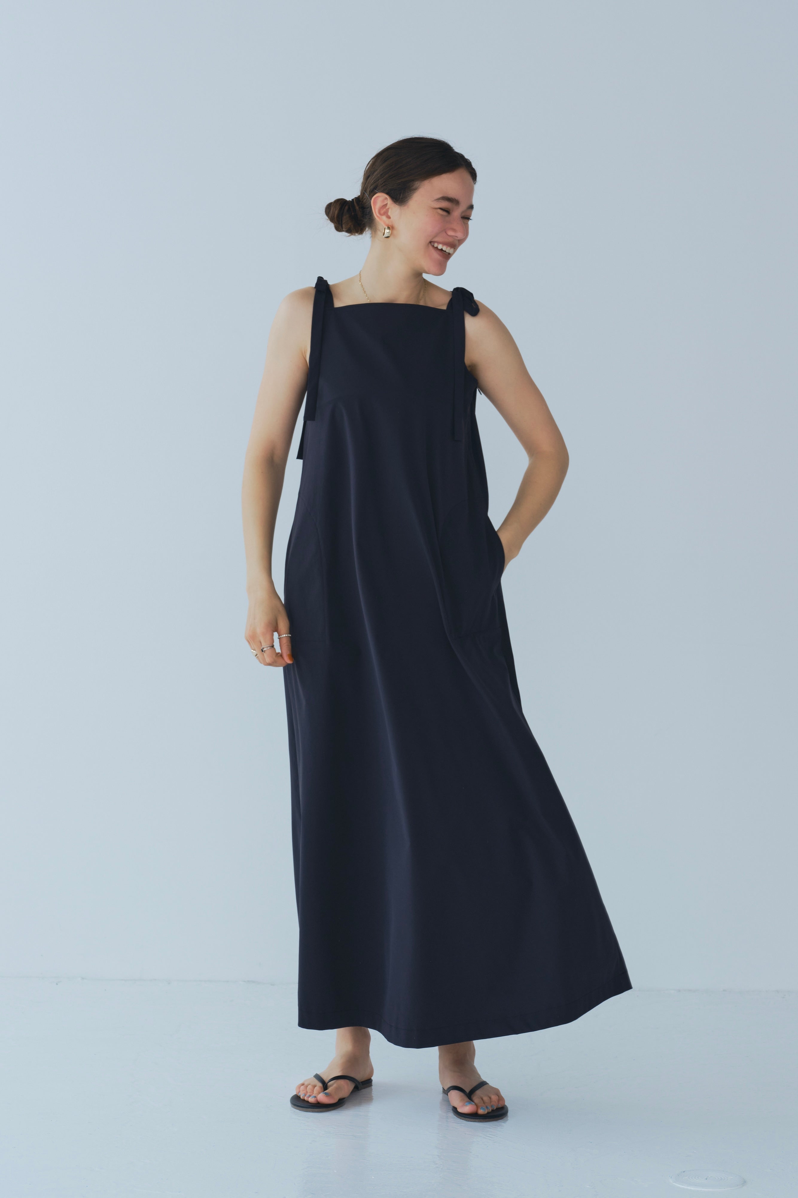 This dress features delicate shoulder ribbons that create a feminine and elegant impression. Made from a fabric with UV protection, contact-cooling properties, and stretch, it offers a cool and comfortable wear perfect for summer. The dry-touch, natural texture gives it a simple yet refined appearance.