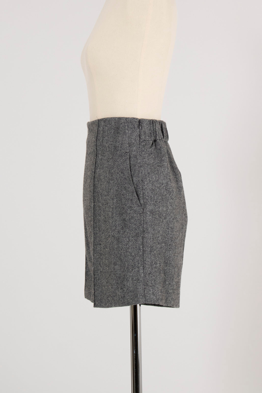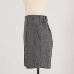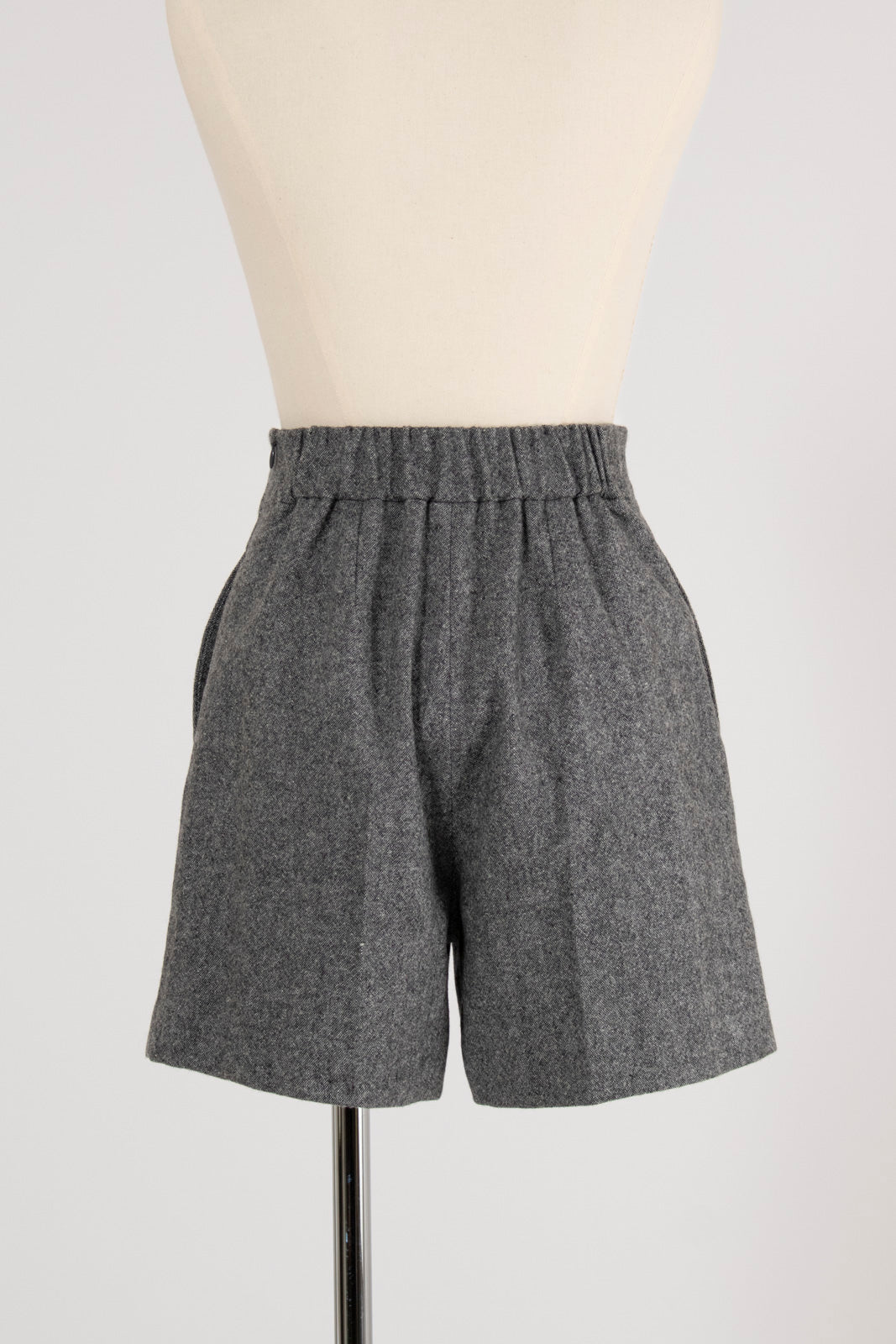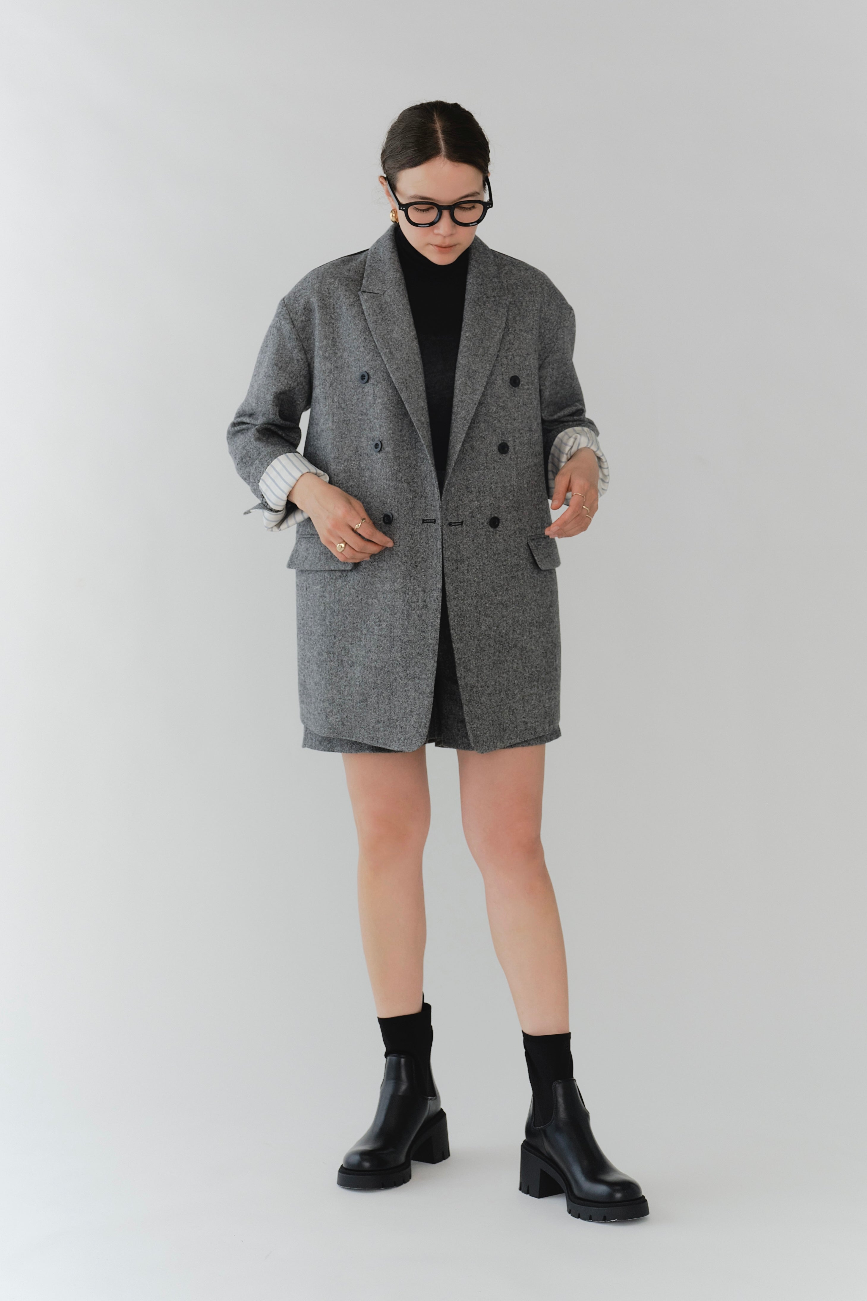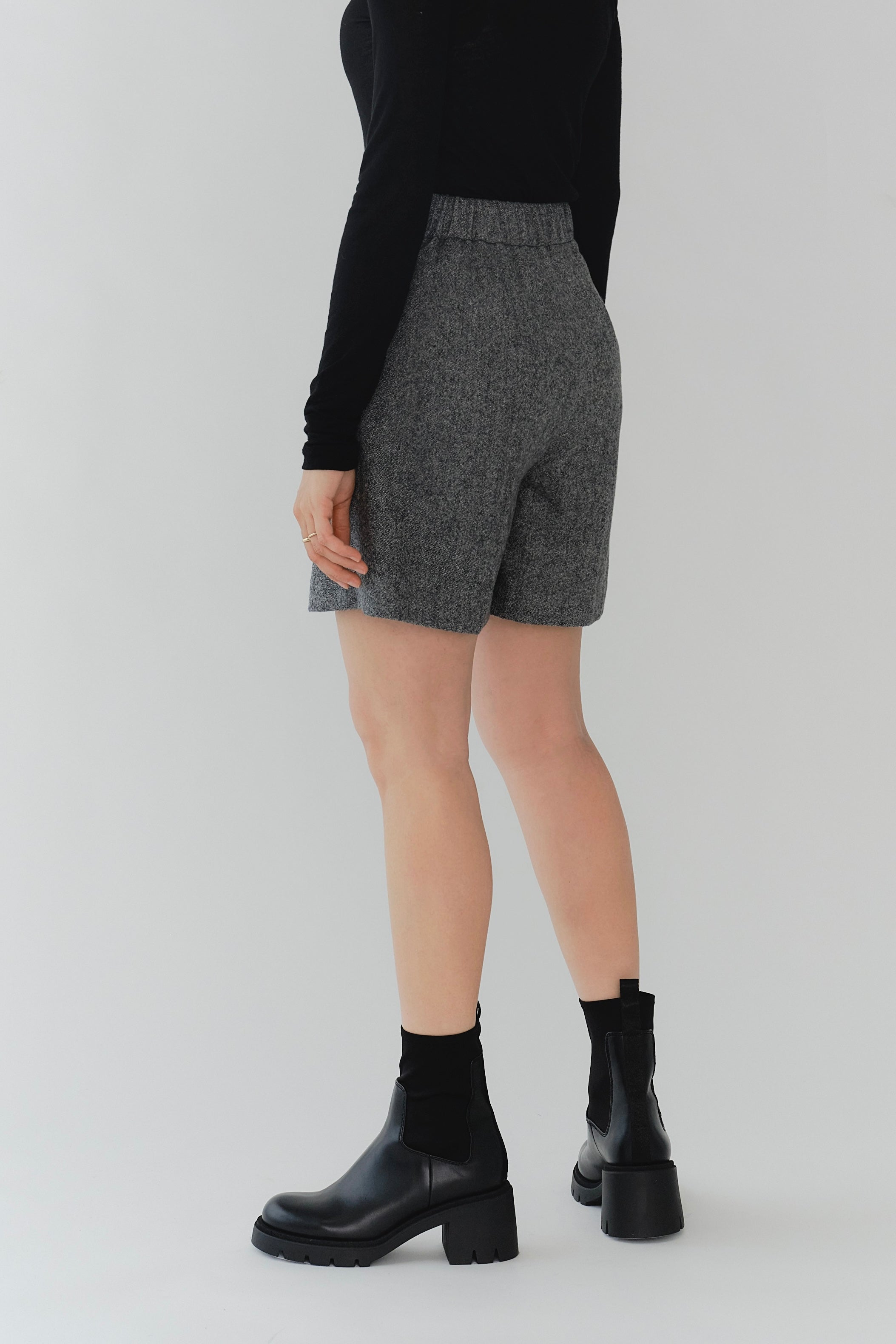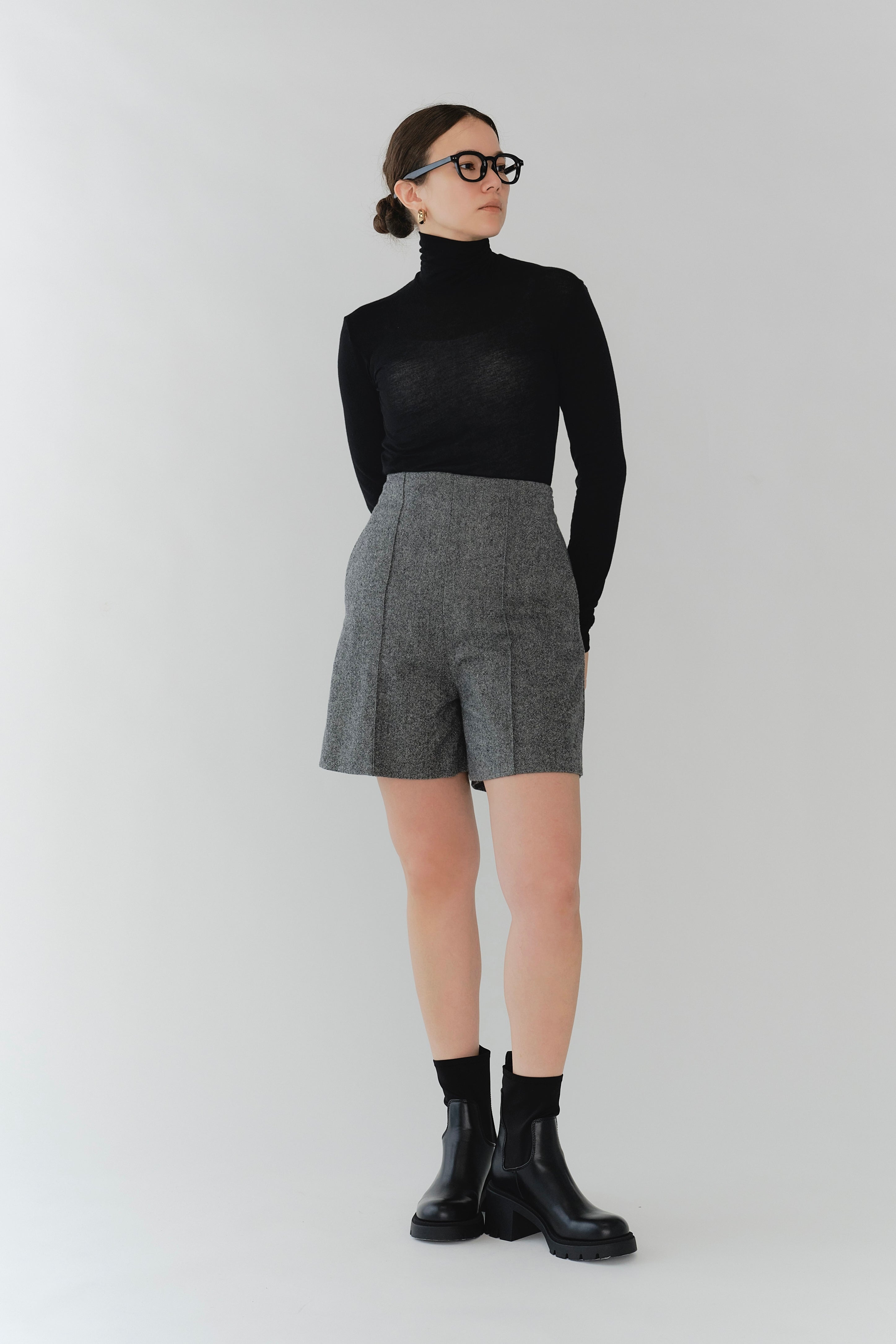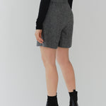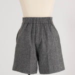 These shorts are crafted from recycled wool material using carefully selected domestic recycled polyester, with all production processes completed in Japan. The meticulously woven fabric creates an impressive heathered texture with rich depth. Soft with just the right amount of stretch, they offer easy movement and comfortable wear. The high waist and center stitch create a leg-lengthening effect, while the flat front and elastic back provide a clean silhouette around the waist. The perfectly calculated length makes your legs look slimmer and pairs beautifully with both boots and sneakers. Easy to balance with voluminous tops, we also recommend styling them as a set with the matching jacket, layering a sweet top underneath for a sophisticated sweet-and-edgy look. A versatile piece that works beautifully for both polished and casual styling.