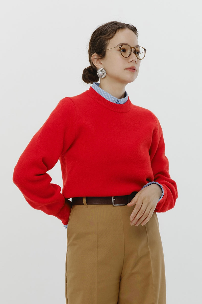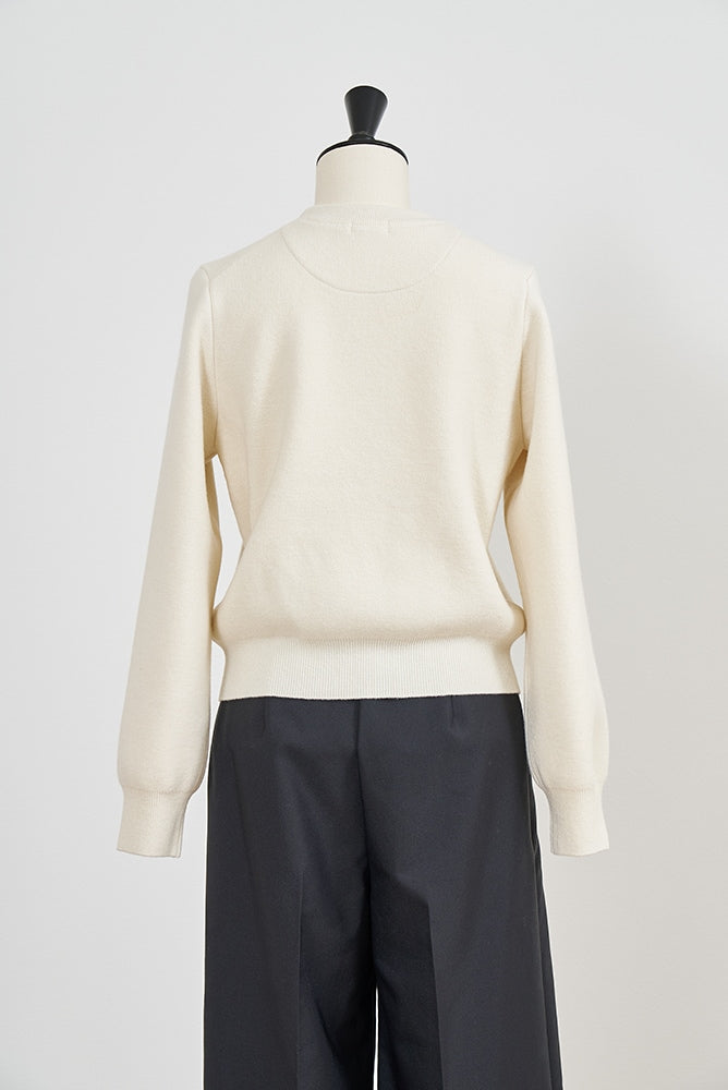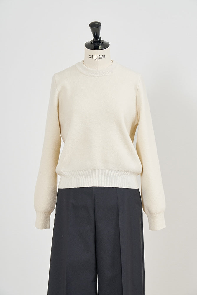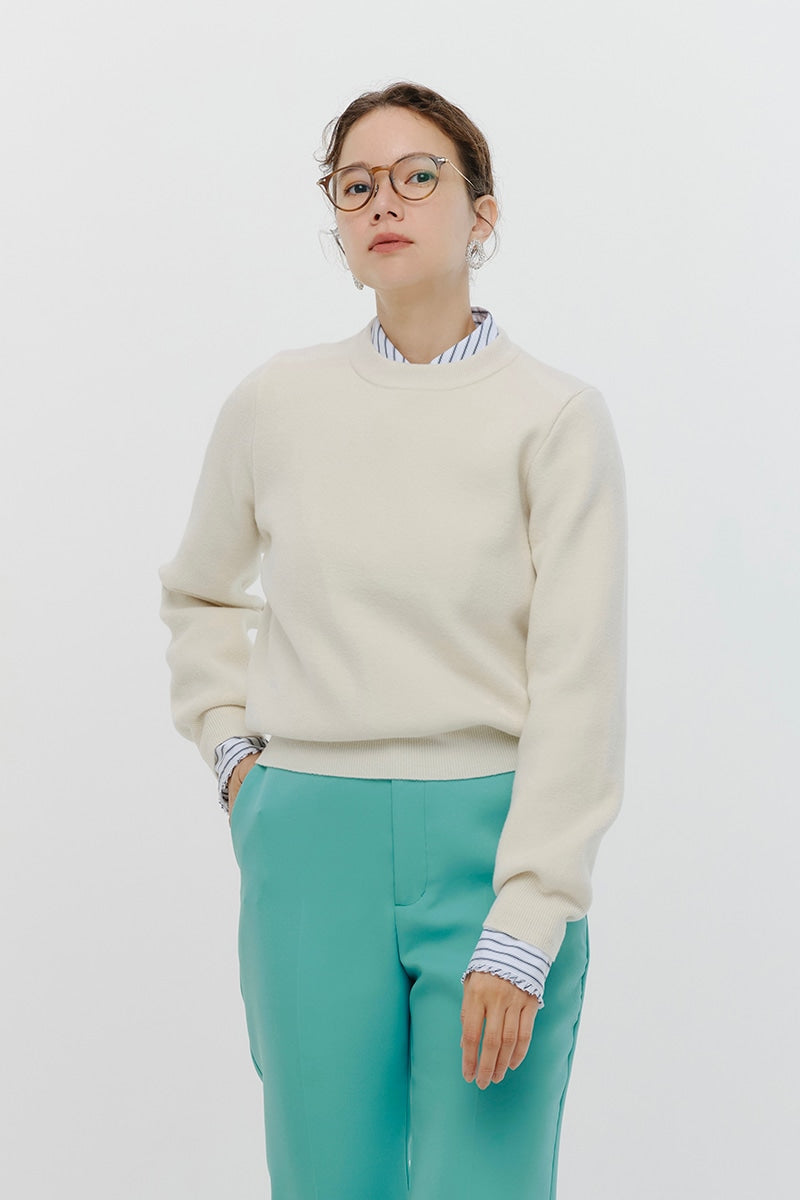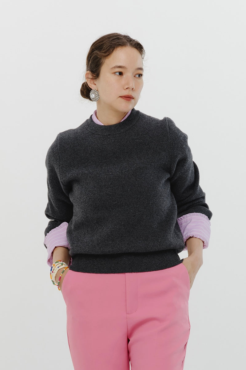 This knit features a fresh color-blocked design. It’s a compact pullover with a blend of carefully selected wool fibers, offering lightness, softness, and durability. The addition of stretch yarn ensures the material retains its shape while providing a comfortable, voluminous feel. The compact design makes it easy to wear with both slim and voluminous bottoms.