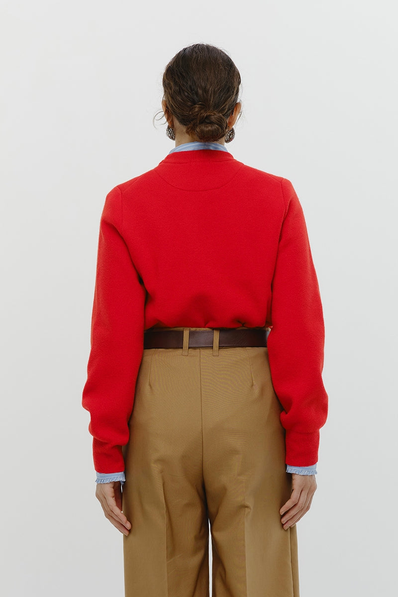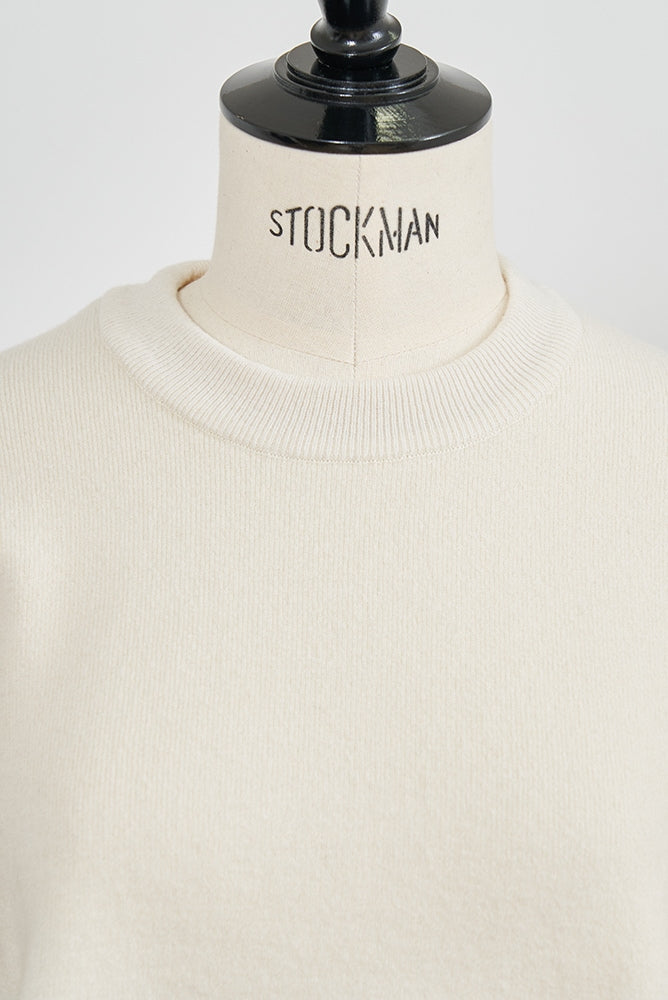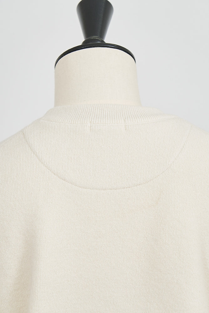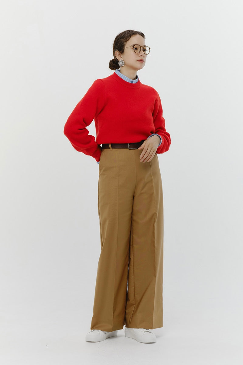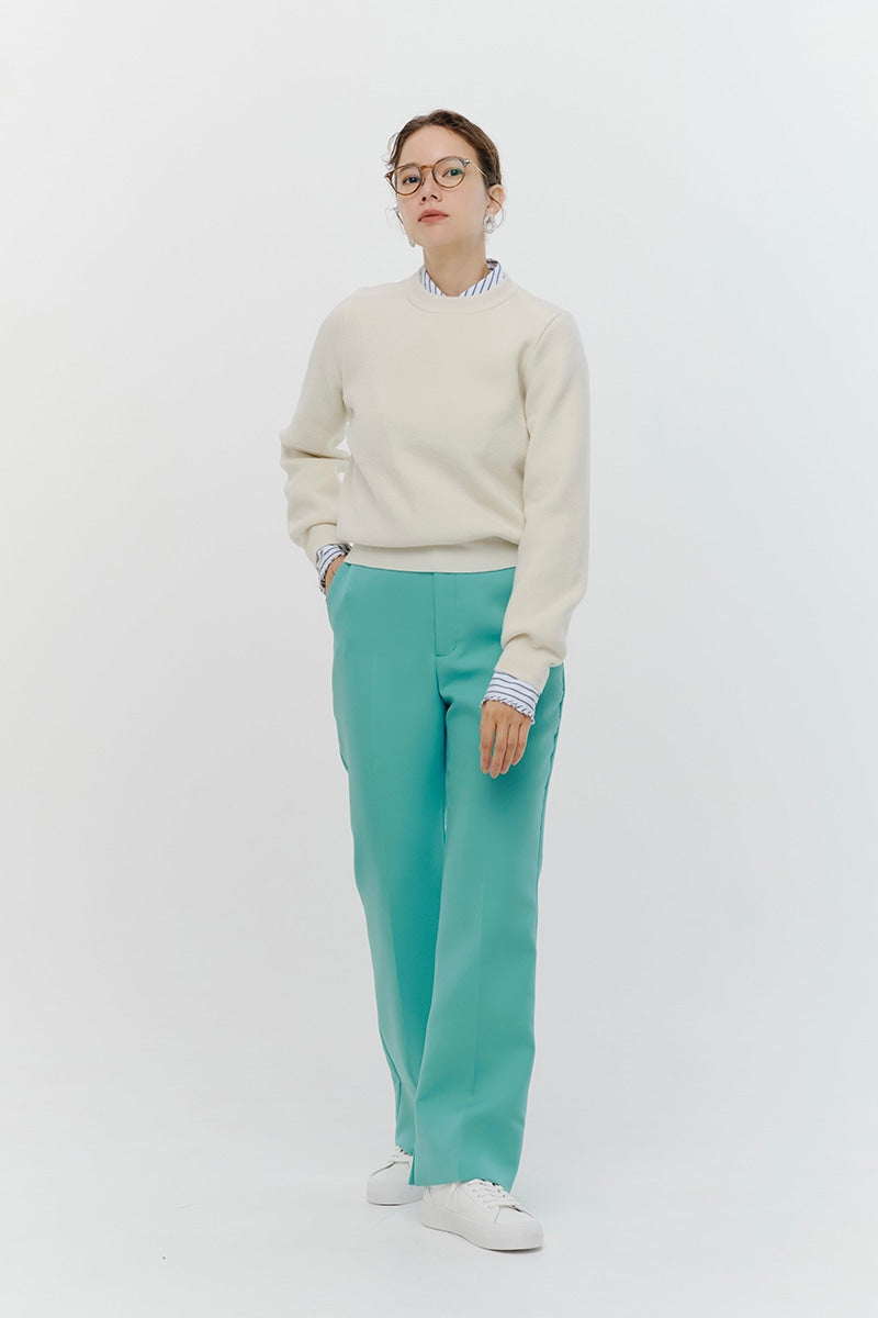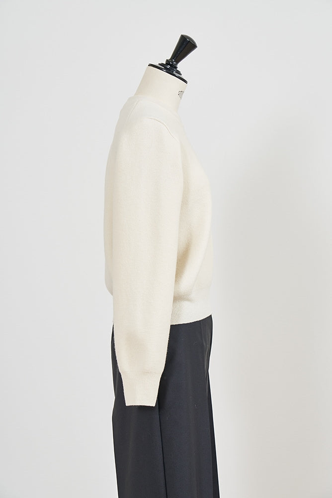 This knit features a fresh color-blocked design. It’s a compact pullover with a blend of carefully selected wool fibers, offering lightness, softness, and durability. The addition of stretch yarn ensures the material retains its shape while providing a comfortable, voluminous feel. The compact design makes it easy to wear with both slim and voluminous bottoms.