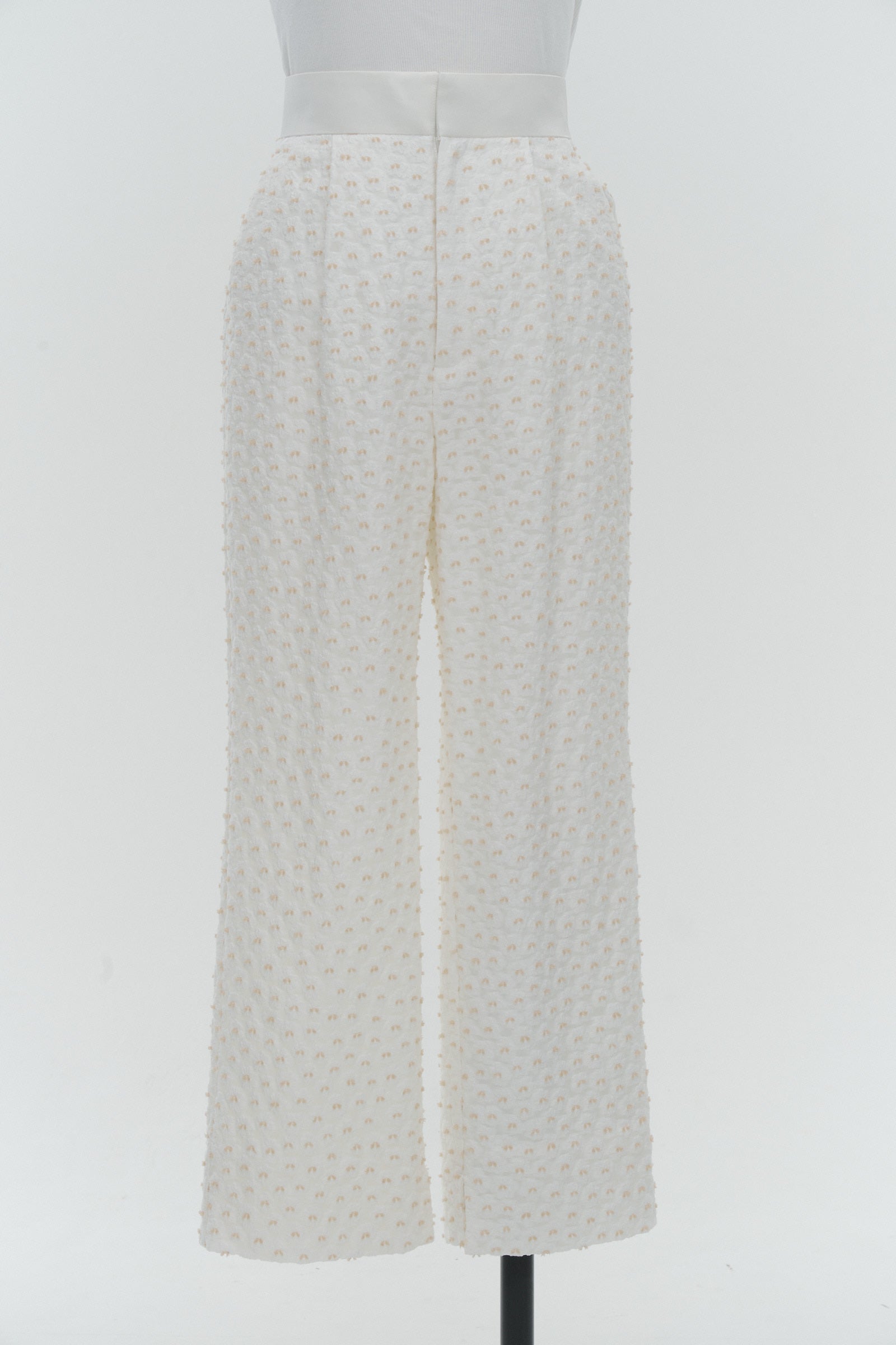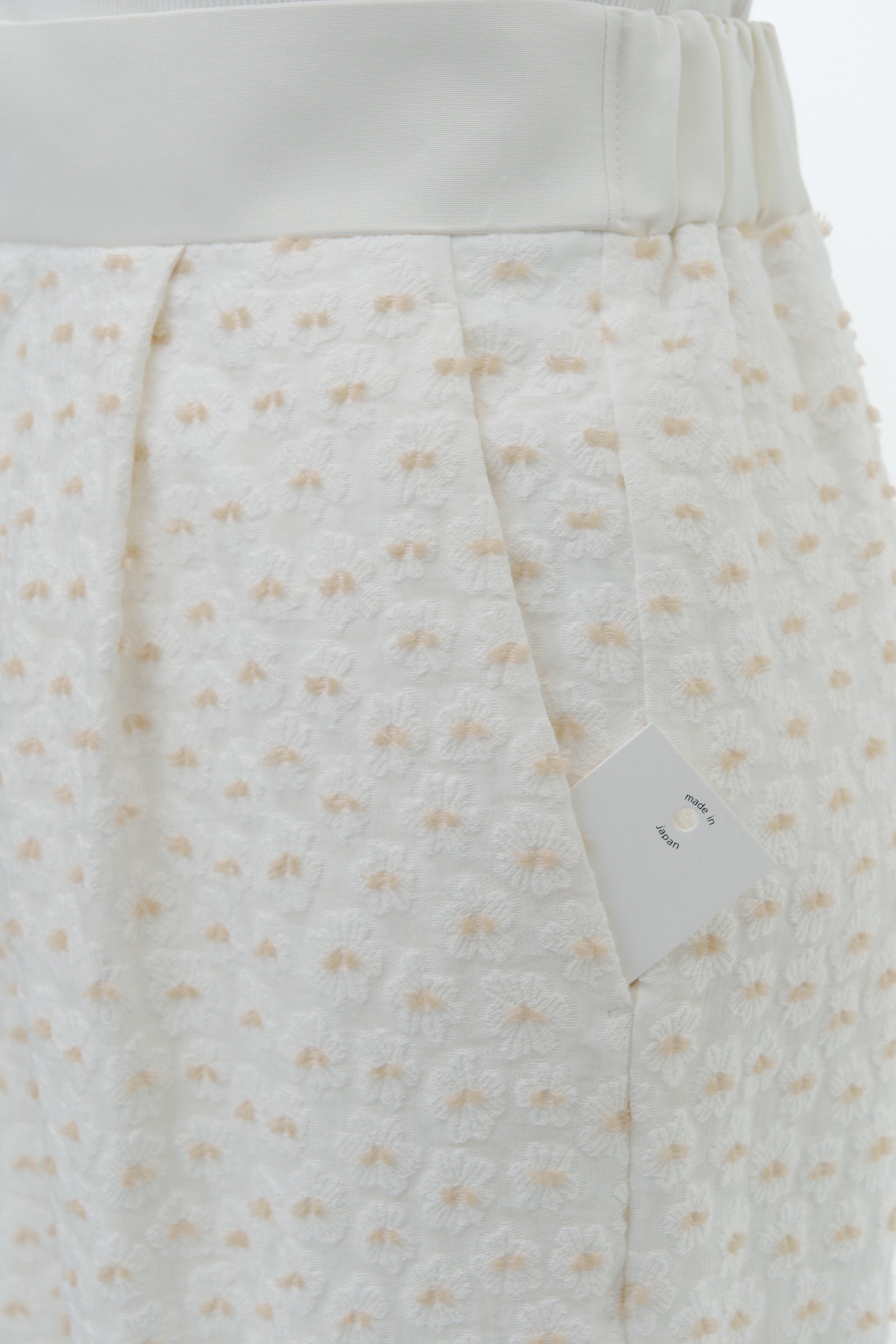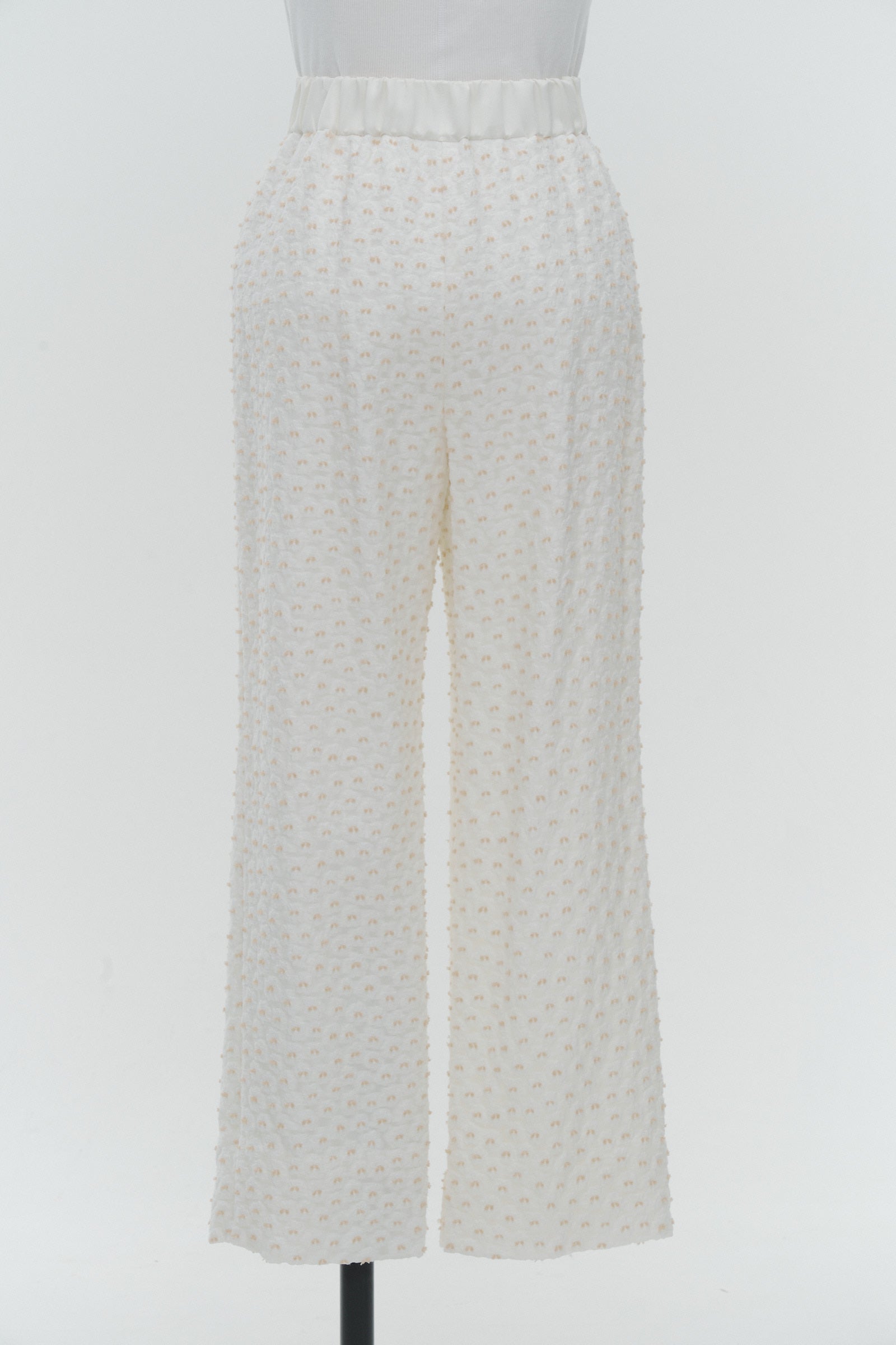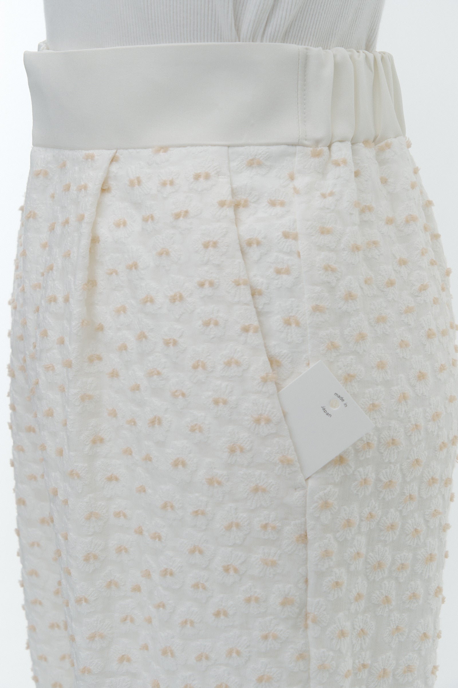 Description (EN): These chamomile straight pants are made from "shirocon" original lightweight, sheer organza jacquard fabric that feels soft and flows naturally. Featuring a high waist, open front, and elastic sides, they offer a sleek and elegant look. The zipper closure makes them easy to put on and take off.