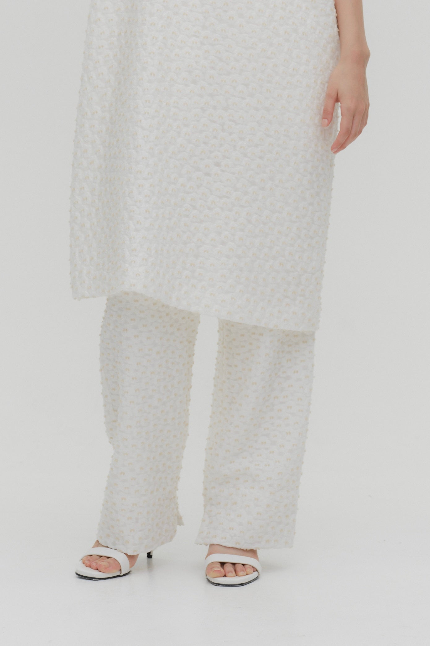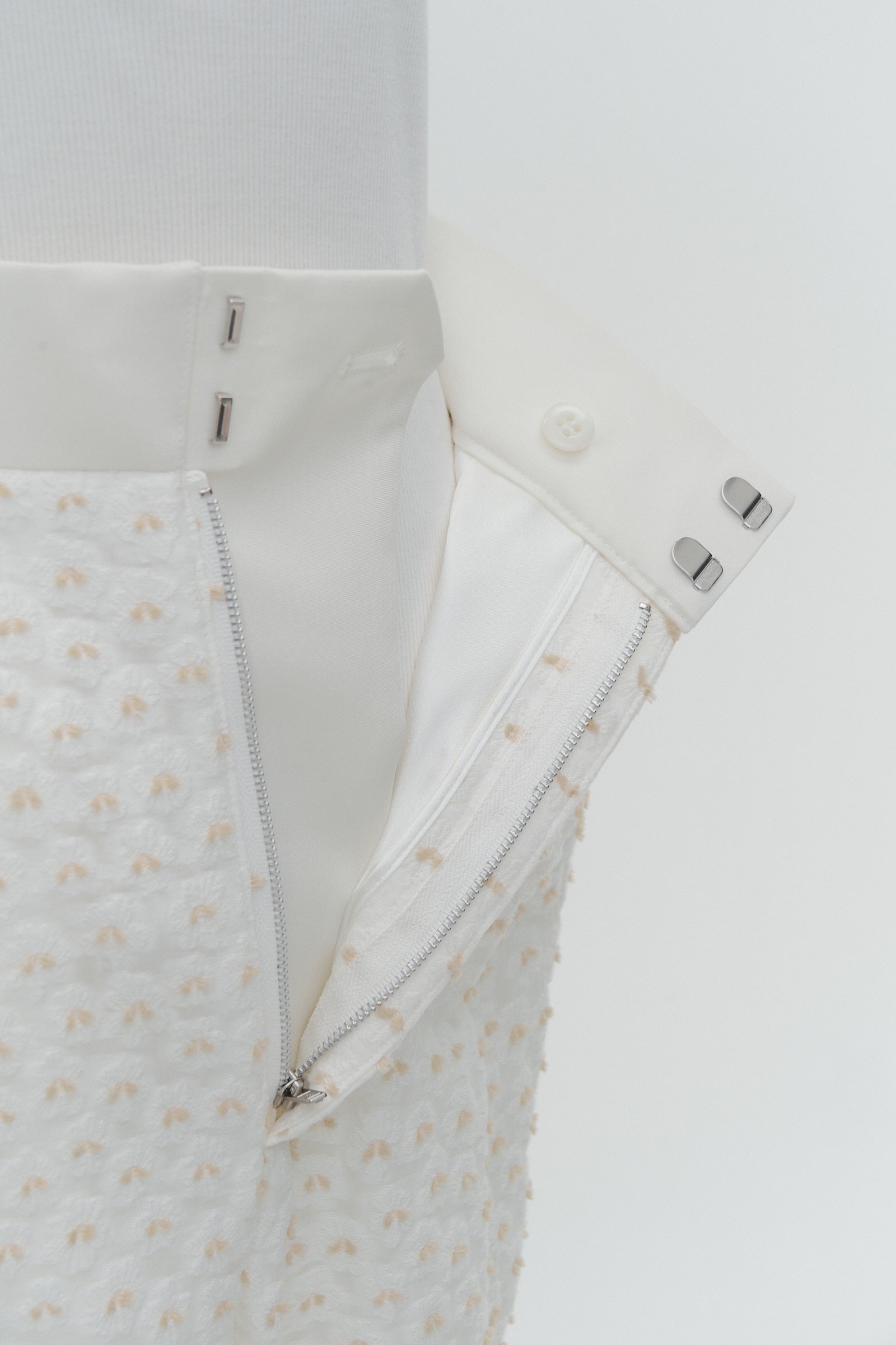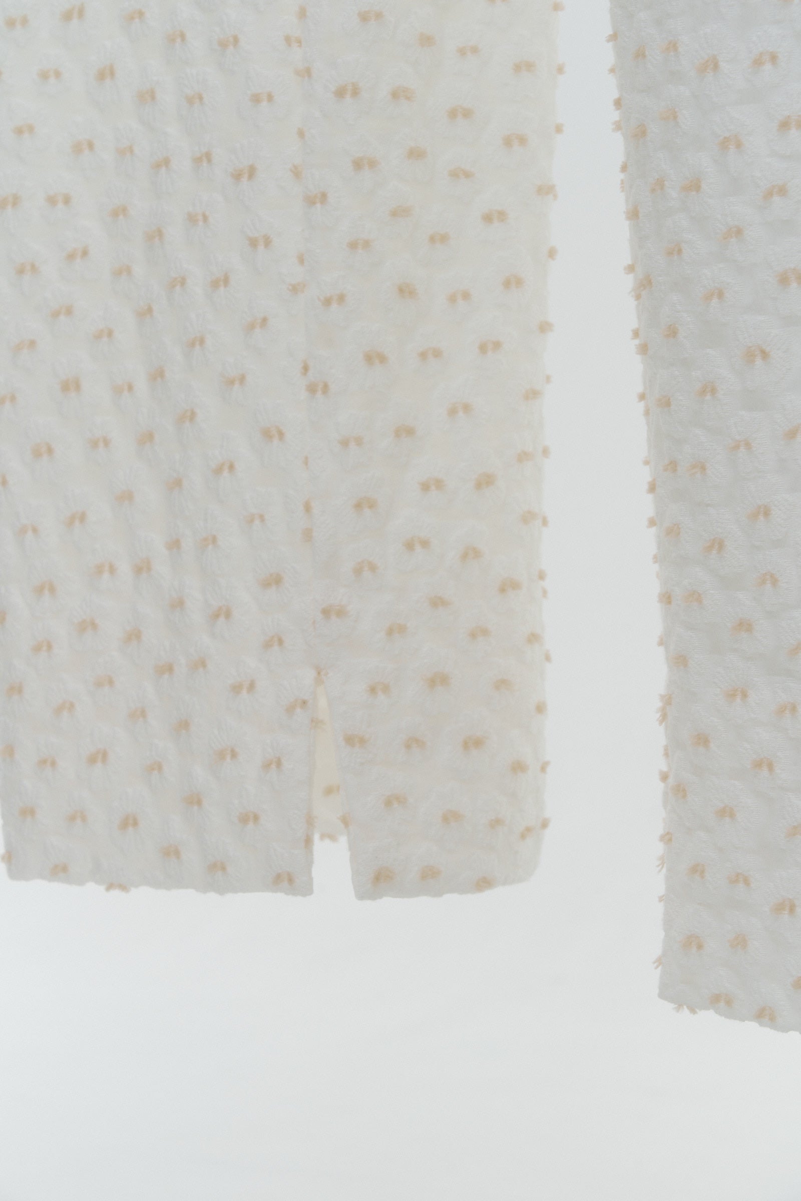 Description (EN): These chamomile straight pants are made from "shirocon" original lightweight, sheer organza jacquard fabric that feels soft and flows naturally. Featuring a high waist, open front, and elastic sides, they offer a sleek and elegant look. The zipper closure makes them easy to put on and take off.