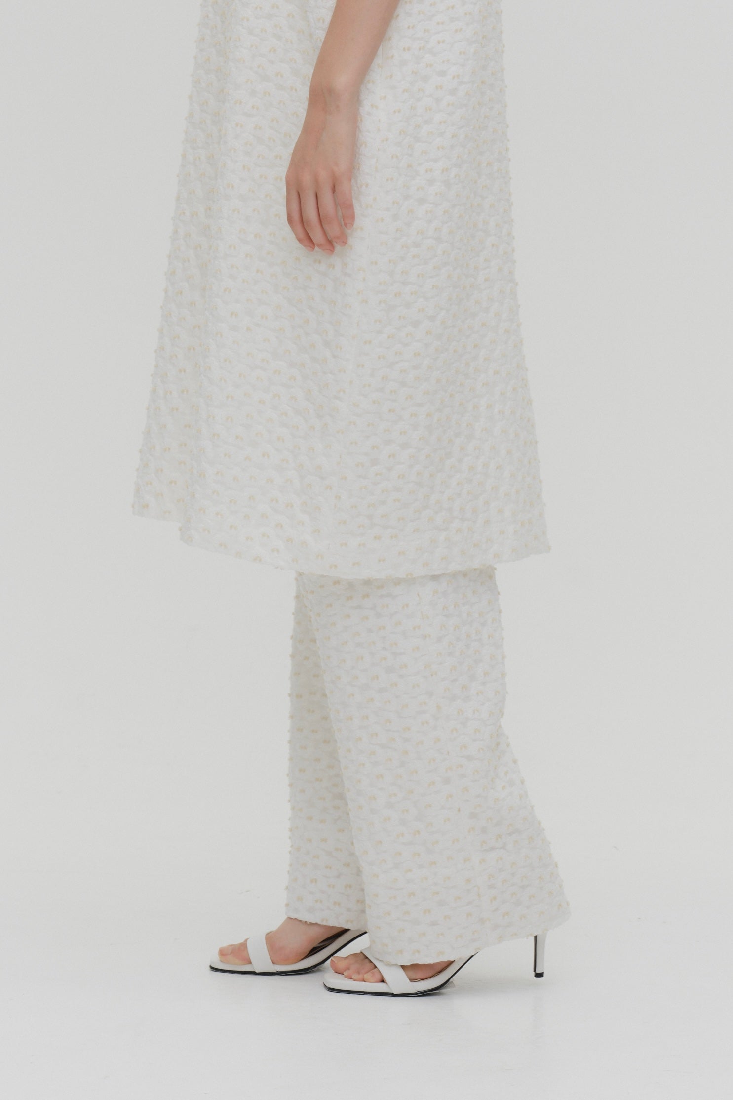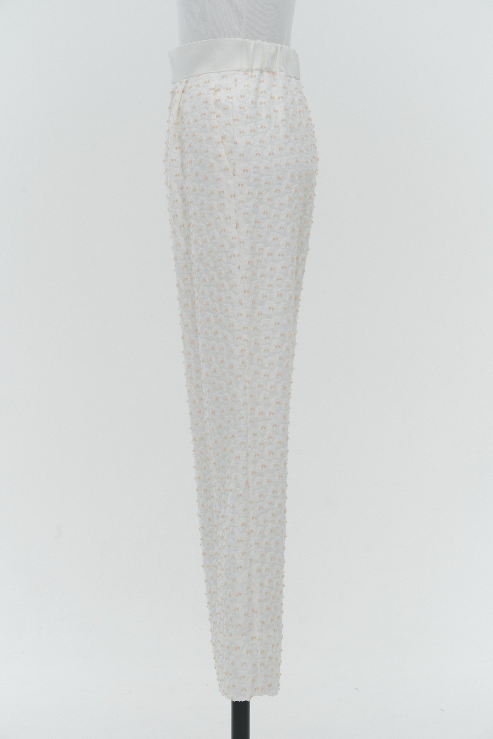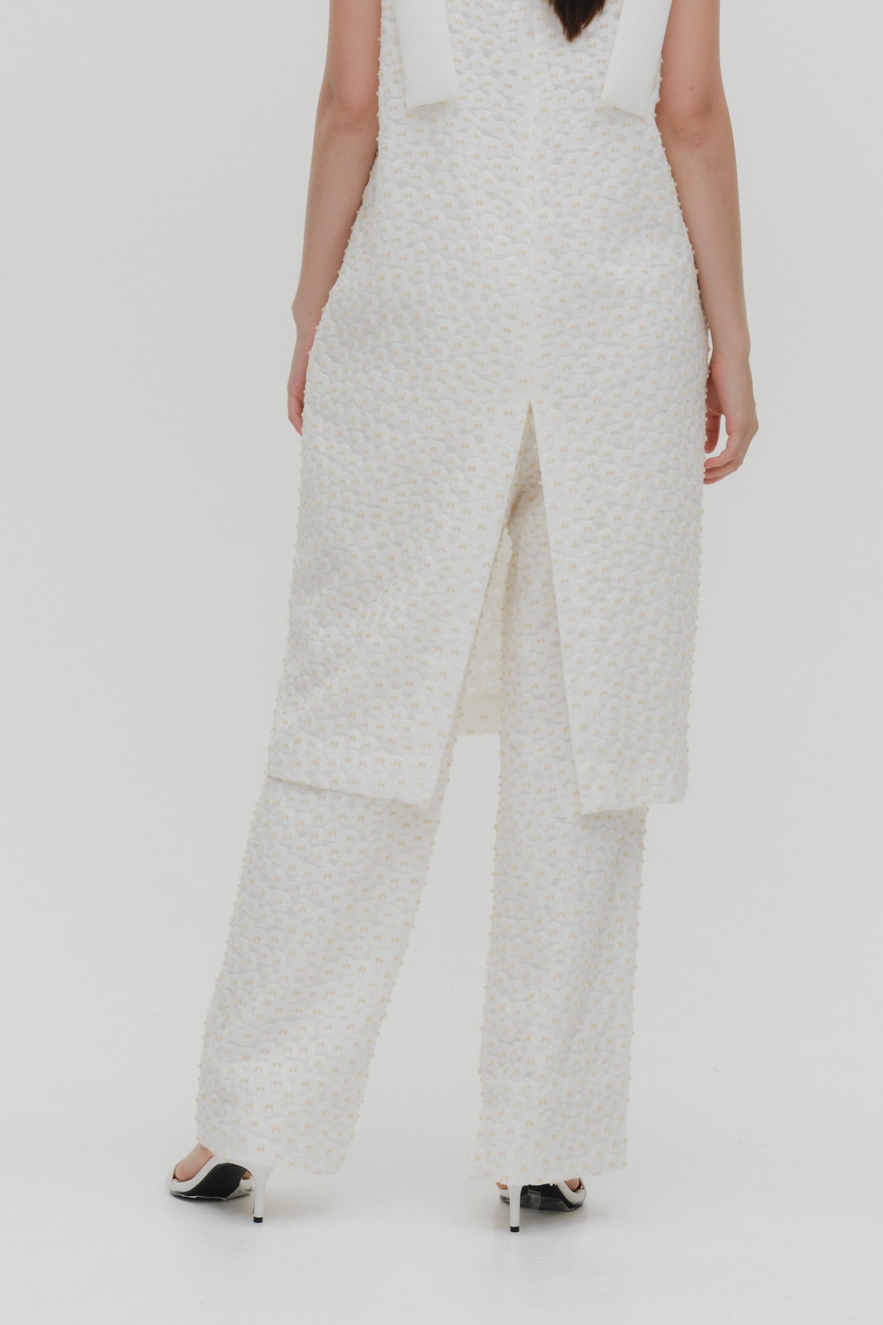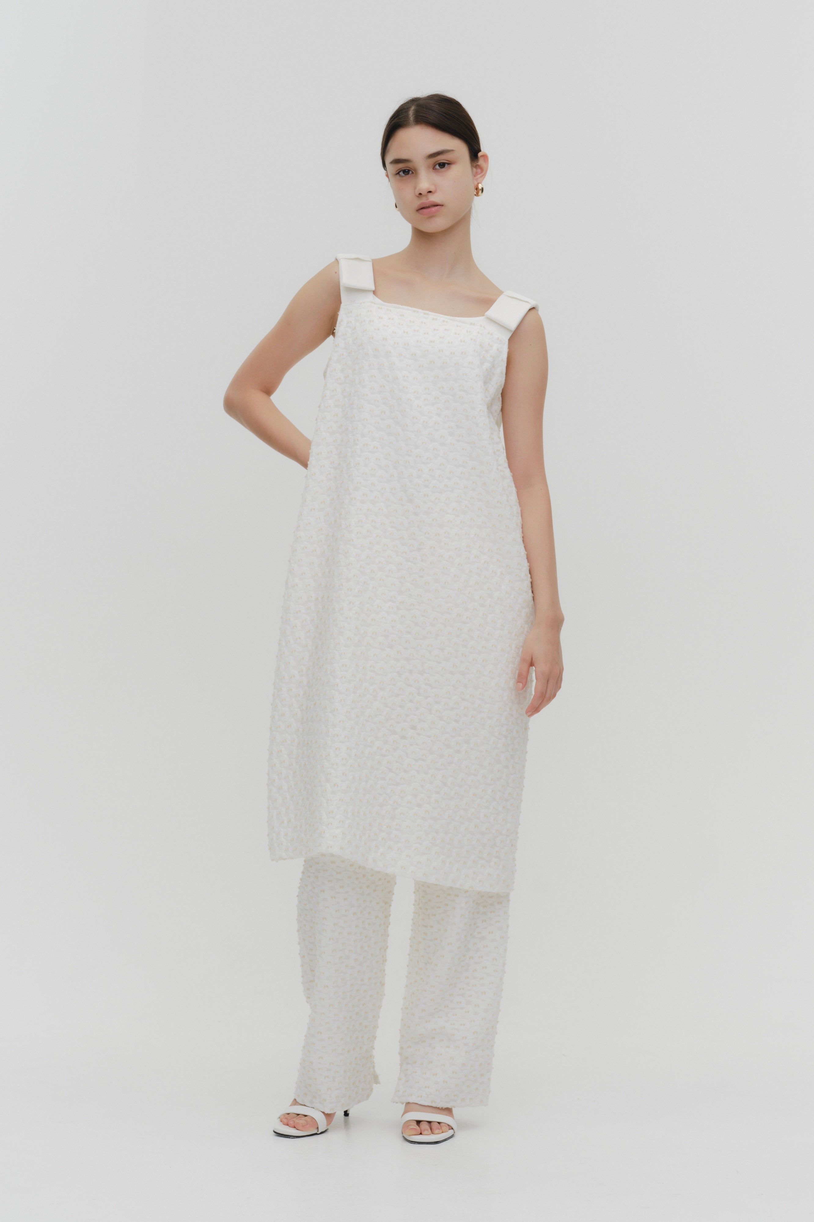 Description (EN): These chamomile straight pants are made from "shirocon" original lightweight, sheer organza jacquard fabric that feels soft and flows naturally. Featuring a high waist, open front, and elastic sides, they offer a sleek and elegant look. The zipper closure makes them easy to put on and take off.