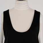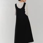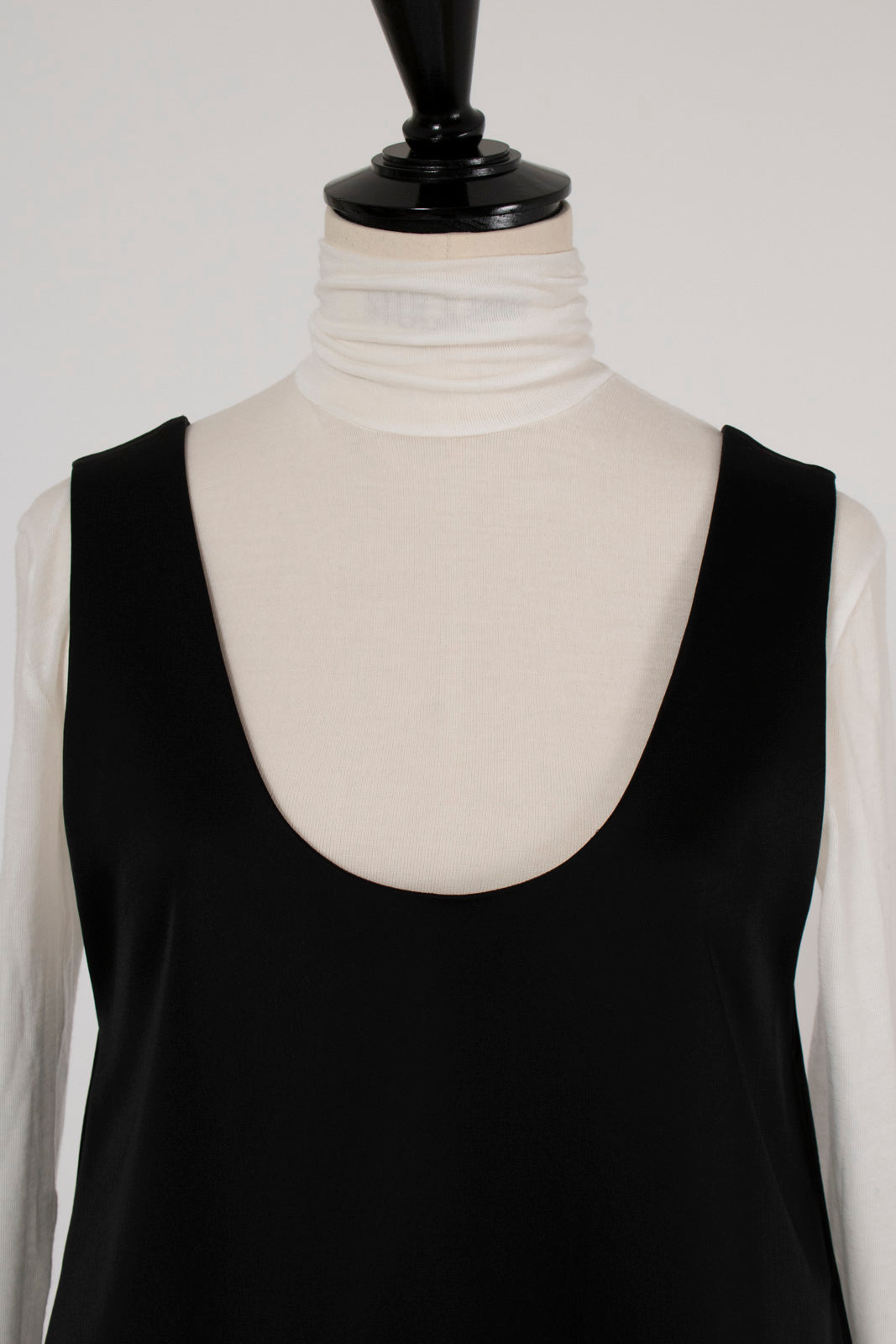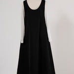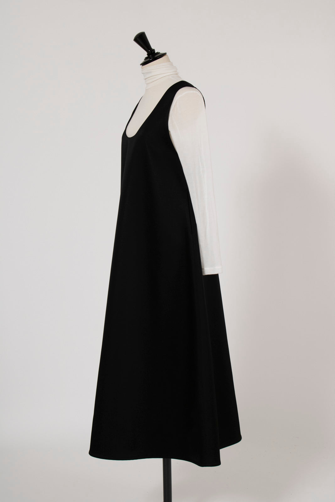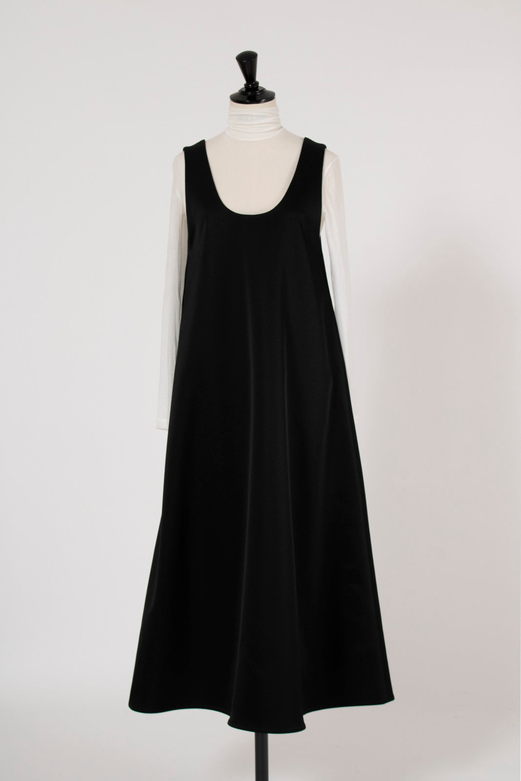 The silhouette is an A-line that gently envelops the body. The widely open neckline at both the front and back allows for various expressions through inner layering, offering versatility in styling.