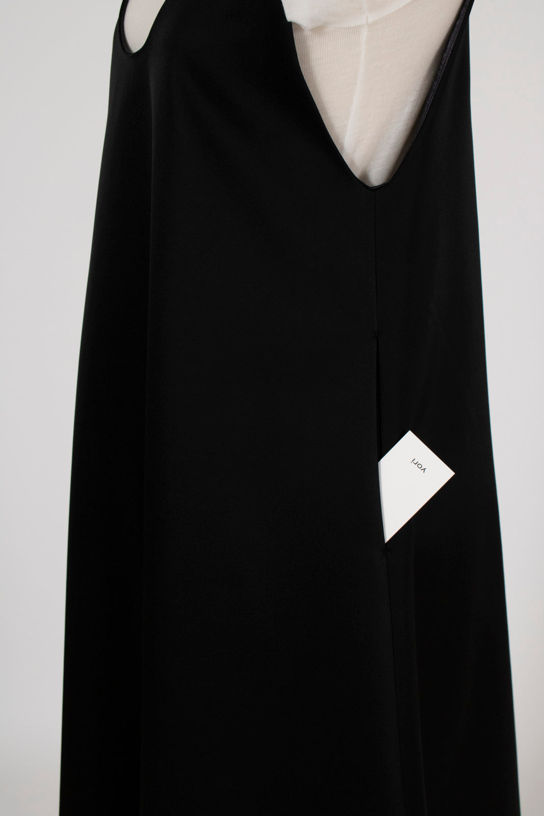 The double-woven satin fabric, which pairs acetate with naturally textured polyester yarn, softly catches the light and offers a plush, voluminous texture. The inherent fullness created by the double weave provides the dress with a moderate three-dimensionality and depth.