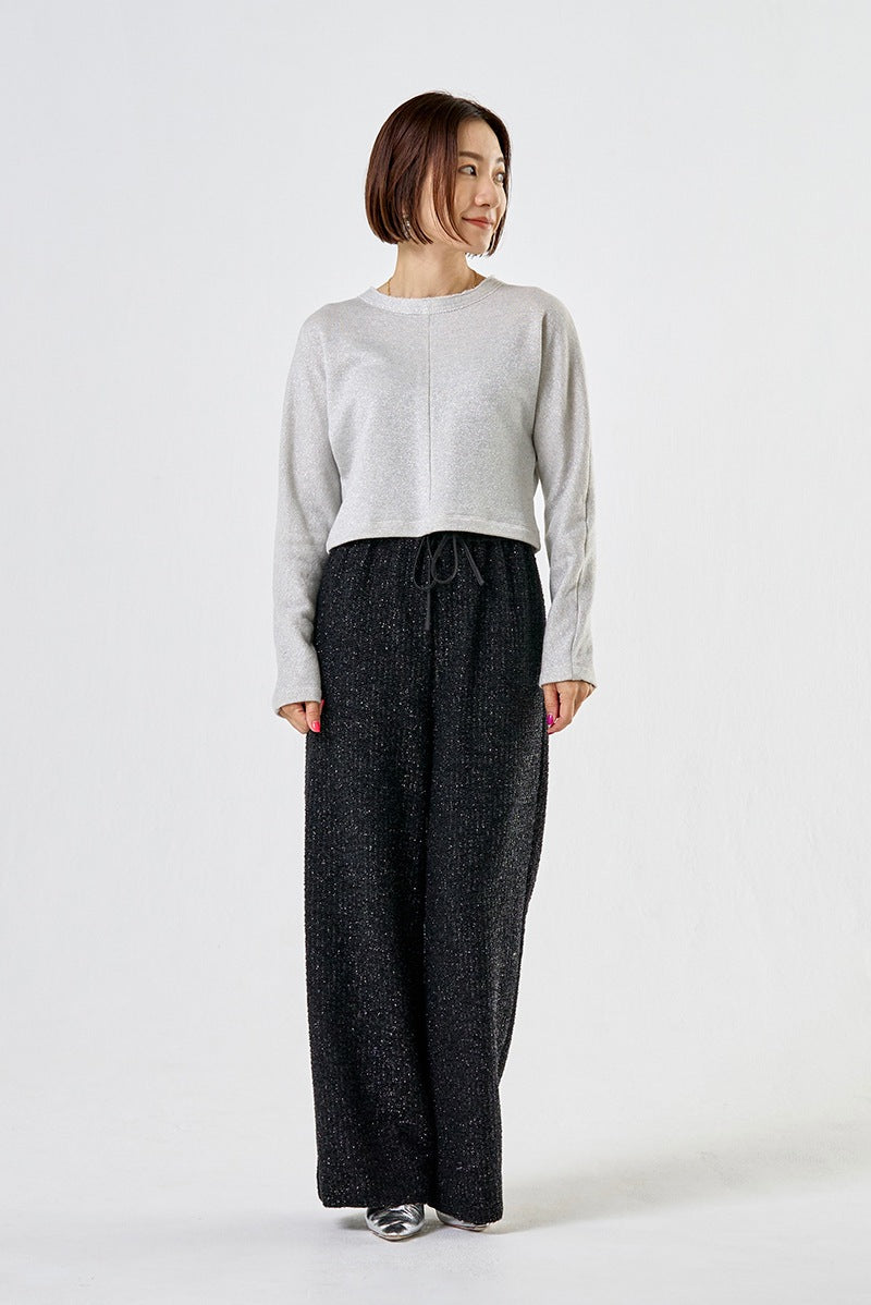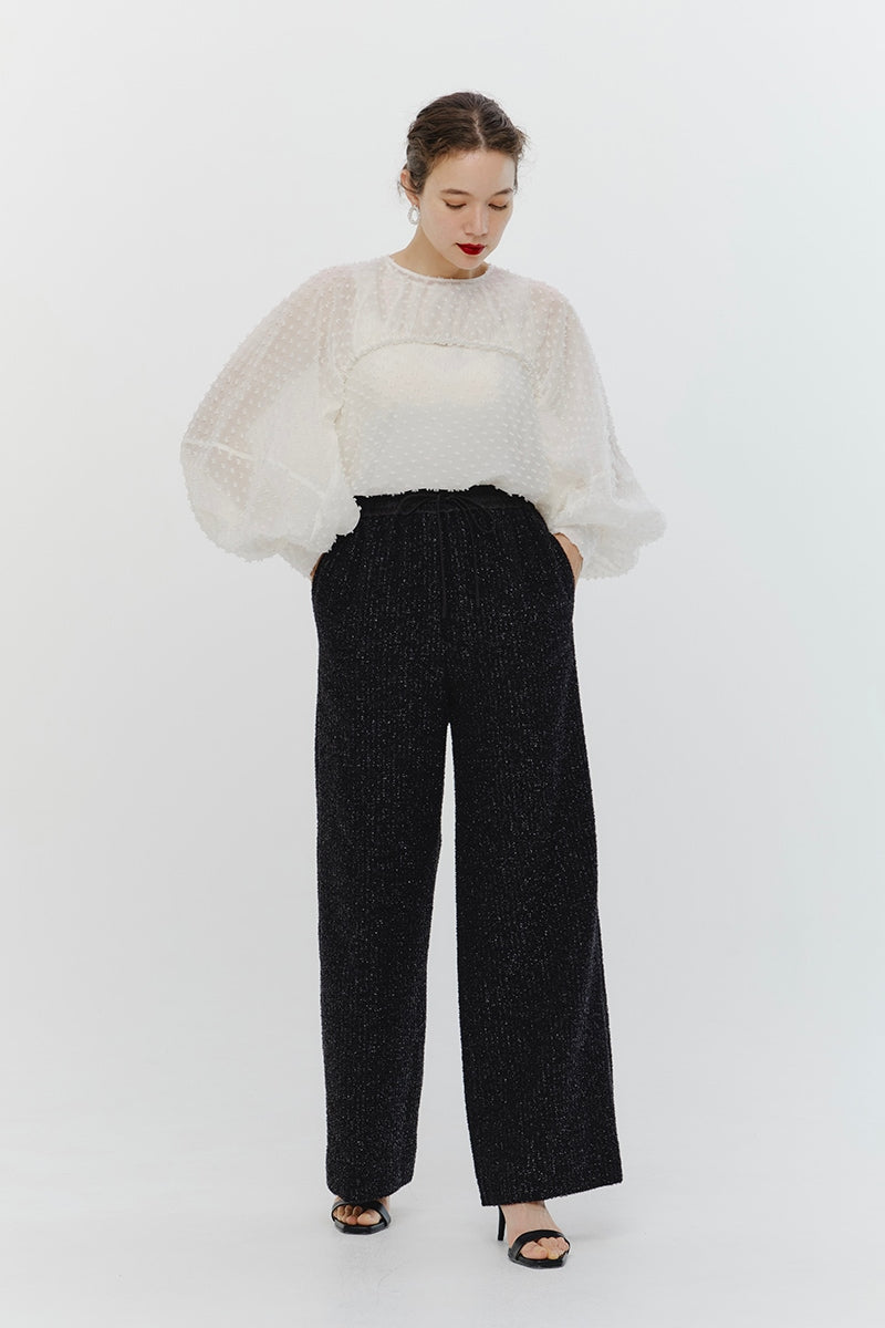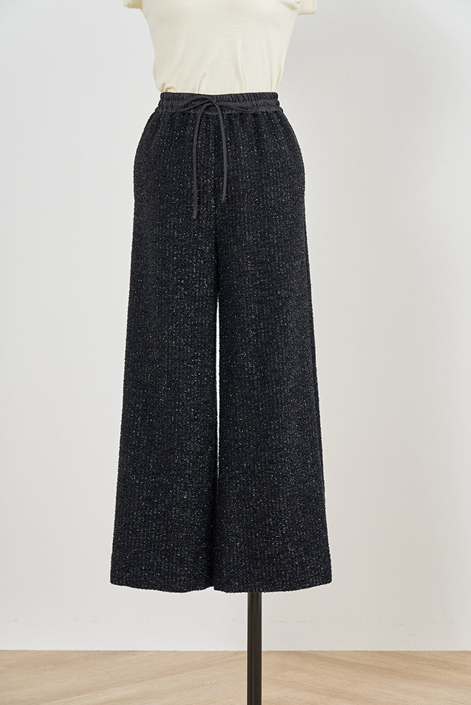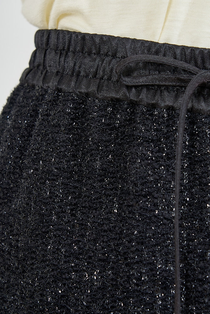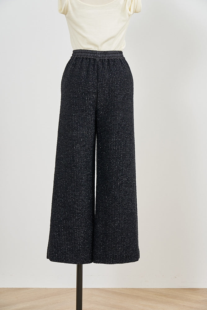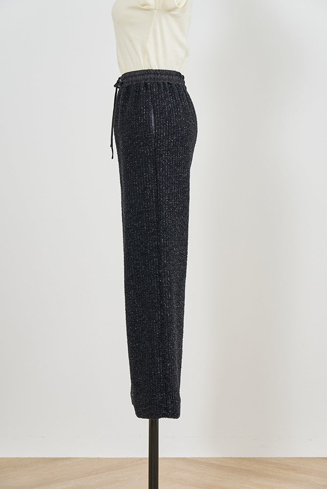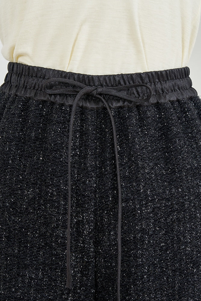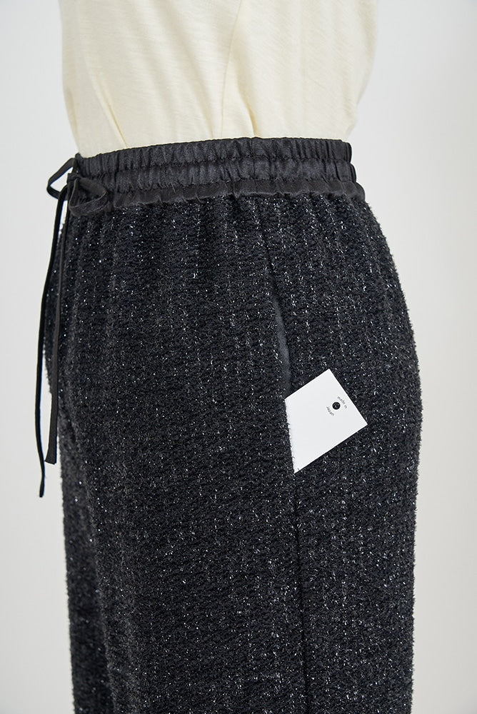 Description (EN): These fancy tweed pants feature luxurious silver filament yarn in a monochrome color palette. The "karami weave" technique intertwines two warp threads and leaves space in the fabric, making it lightweight. The pants have a straight silhouette that falls from the hips, with a snug fit around the waist for a relaxed but sleek look. The elastic waistband with a ribbon ensures a comfortable fit, and the satin details on the waistband and lining add a touch of luxury.