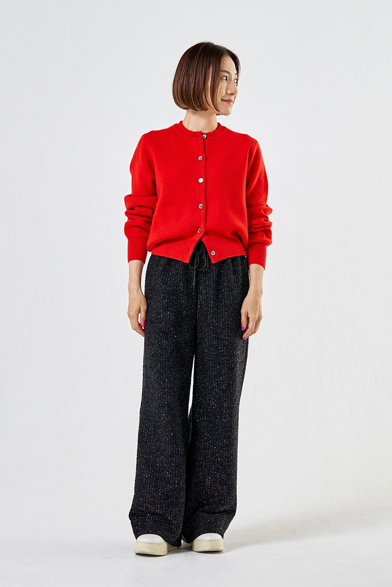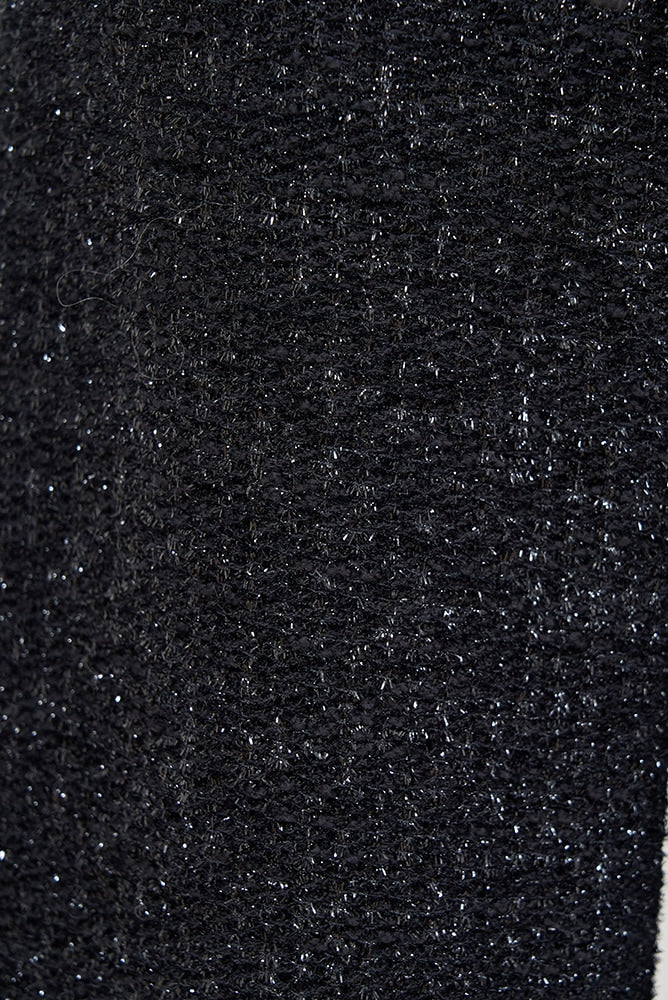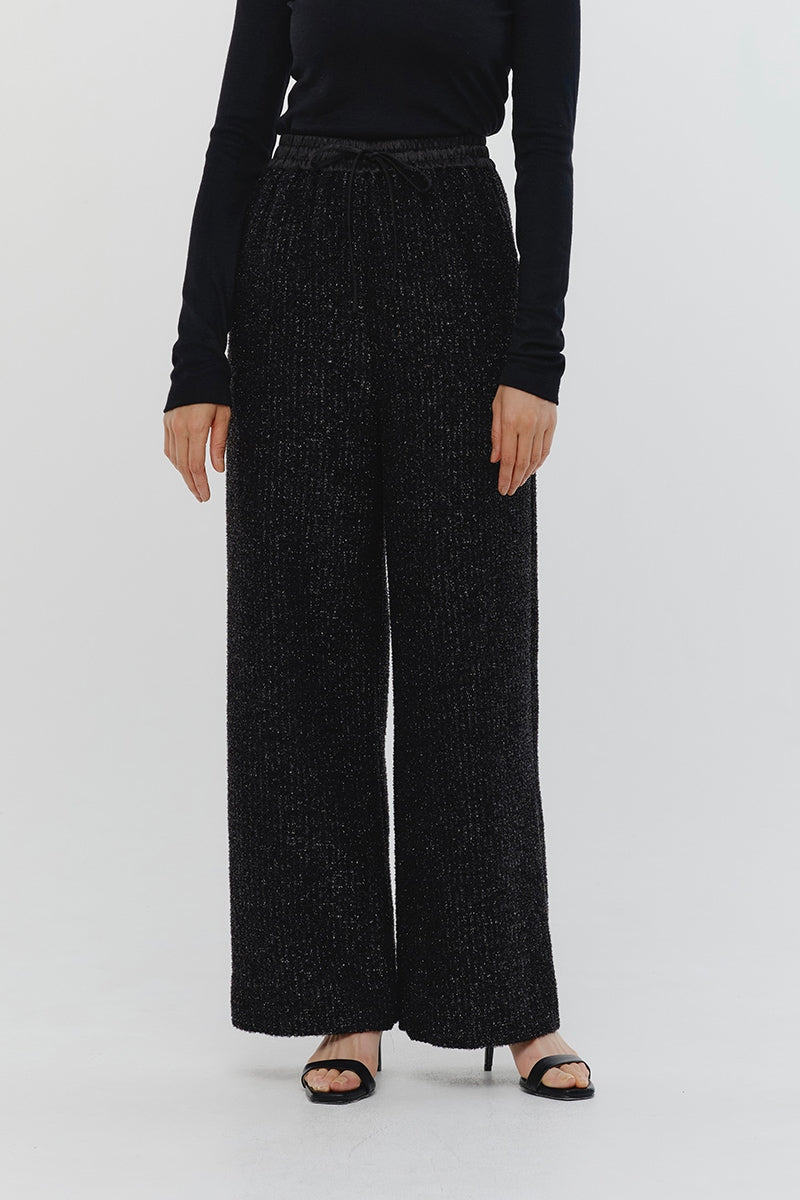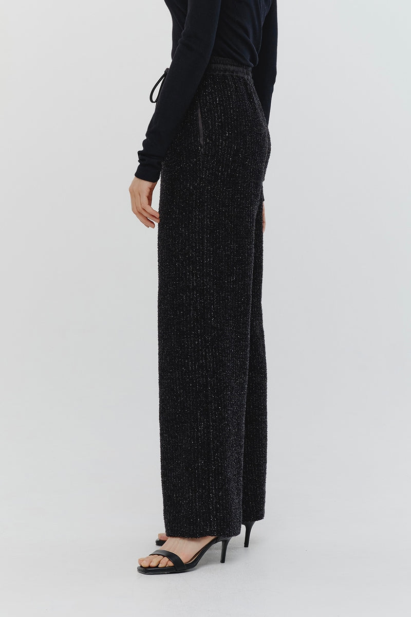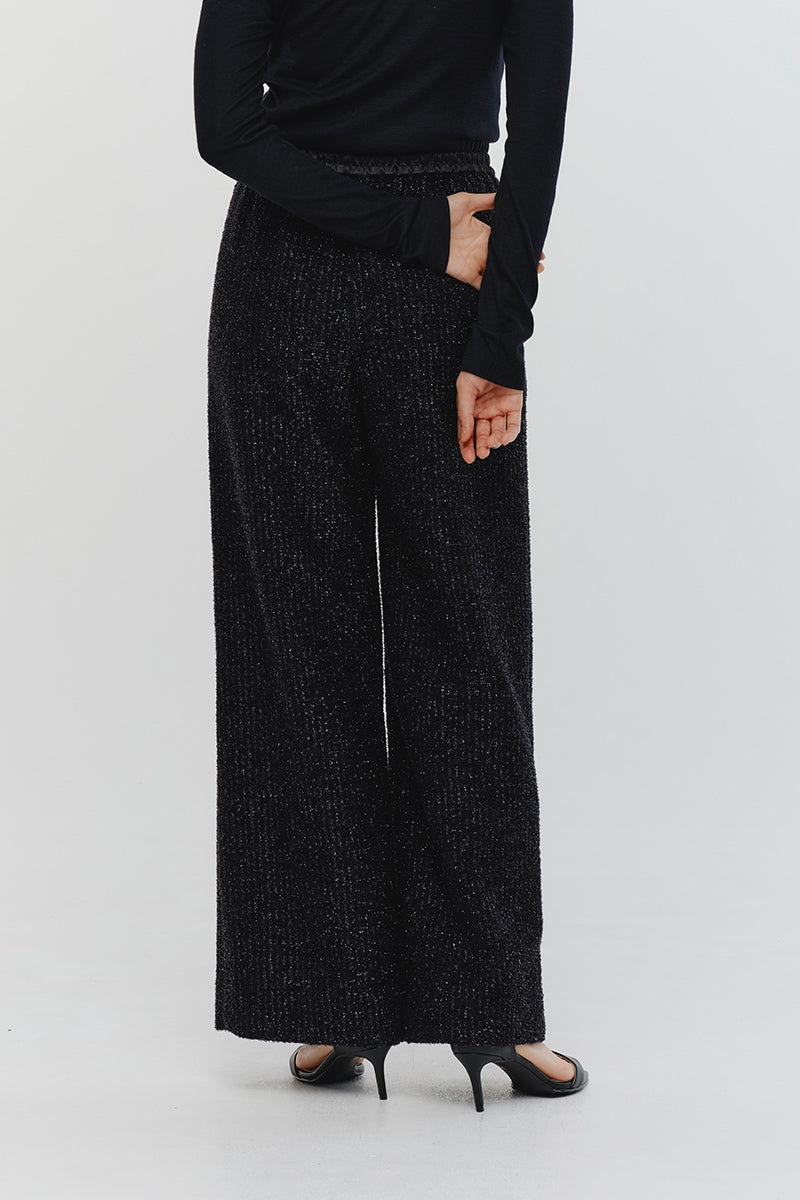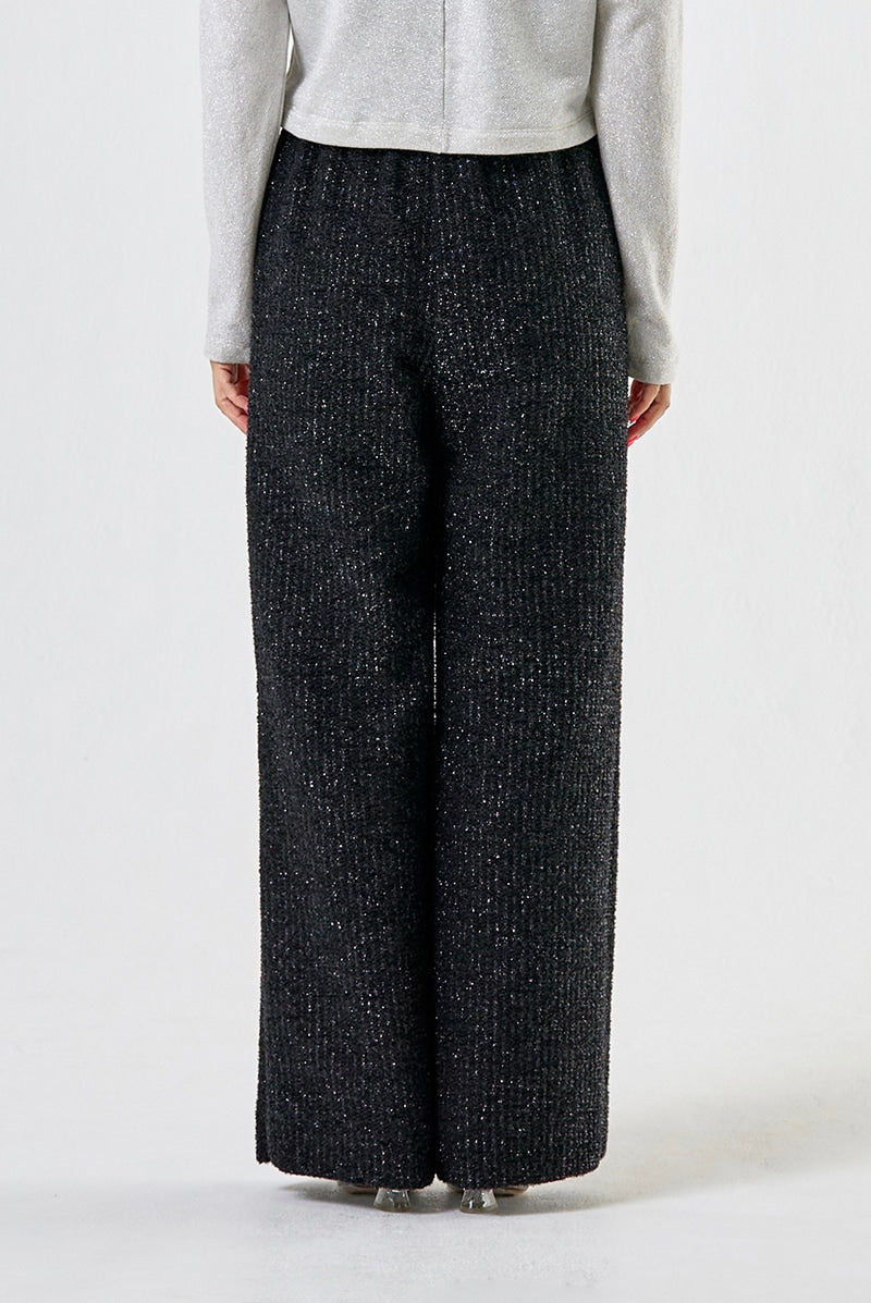 Description (EN): These fancy tweed pants feature luxurious silver filament yarn in a monochrome color palette. The "karami weave" technique intertwines two warp threads and leaves space in the fabric, making it lightweight. The pants have a straight silhouette that falls from the hips, with a snug fit around the waist for a relaxed but sleek look. The elastic waistband with a ribbon ensures a comfortable fit, and the satin details on the waistband and lining add a touch of luxury.