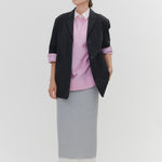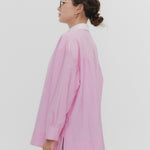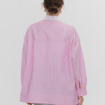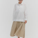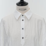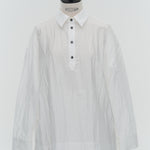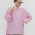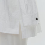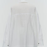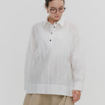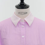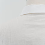 A shirt made from combed lawn fabric, featuring a sheer texture and a glossy finish. The material boasts a textured surface, shiny luster, and a soft feel, offering a rich and expressive appearance with a moderate stiffness and sheer quality. The collar area is crafted with clean and classic Oxford fabric, using 100% cotton with a special finish. This open-collar shirt combines a relaxed fit and an open-collar design to create a laid-back and effortlessly balanced look.