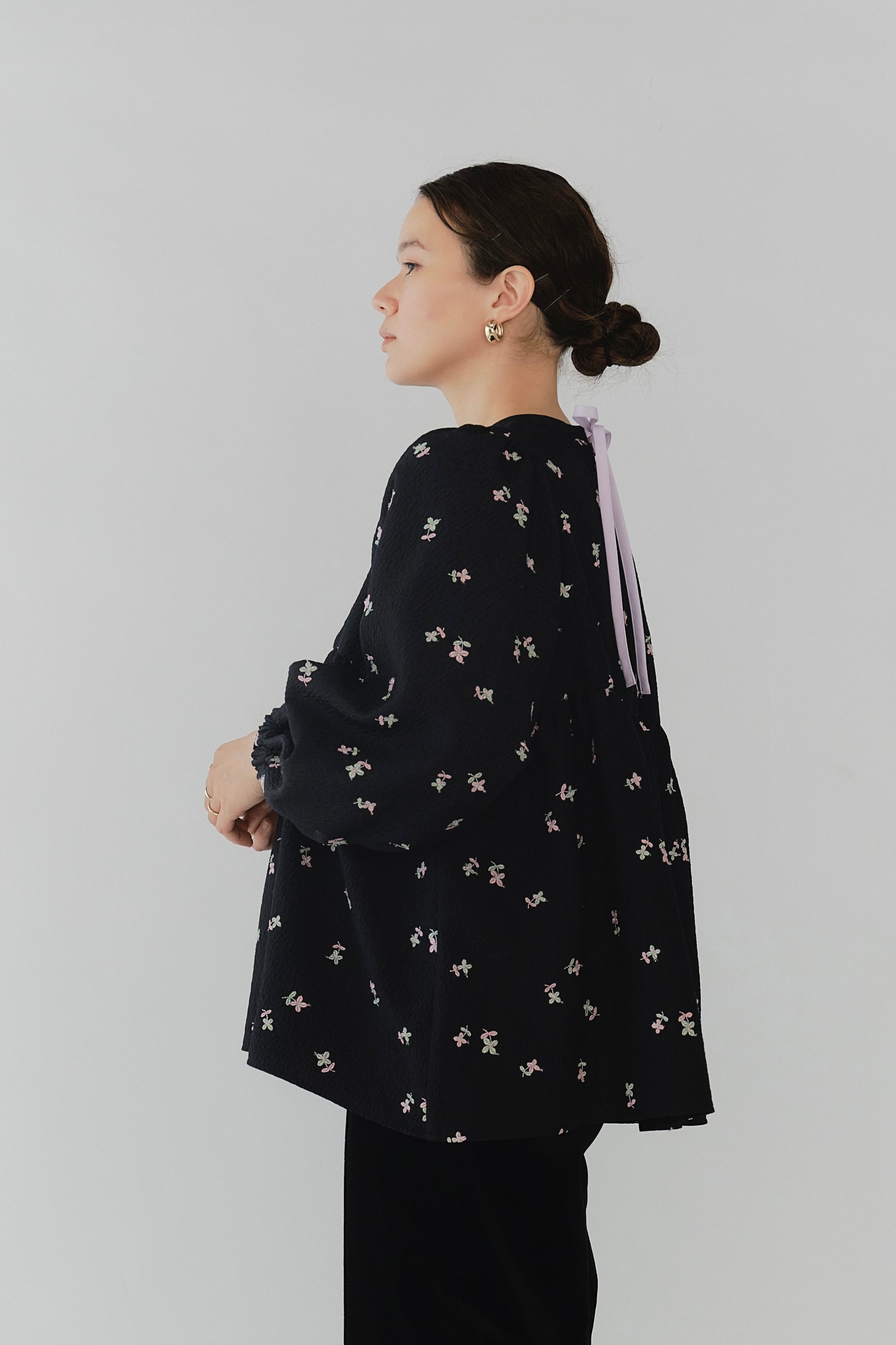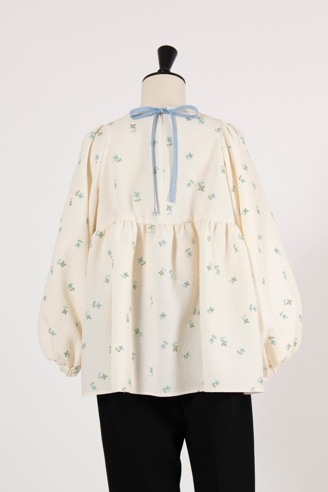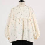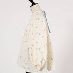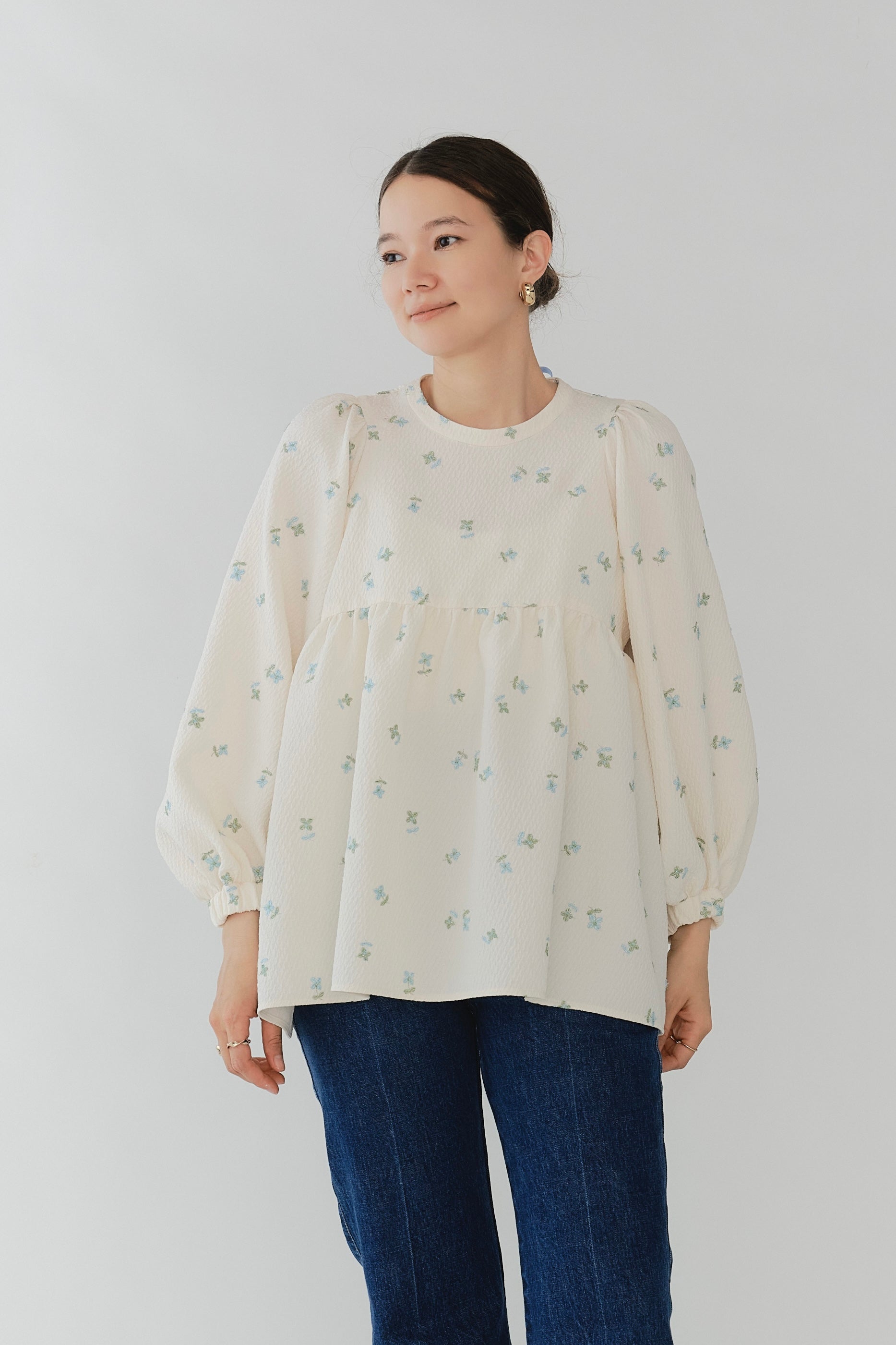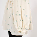 Crafted from our original fukure jacquard fabric, this blouse features enchanting embroidery that dances like shimmering flowers in bloom. The dimensional weave and delicate, lustrous floral embroidery create an extraordinary piece with unparalleled presence. We've captured both sweetness and elegance in every detail. Soft puff sleeves and generous gathers create a flattering silhouette that skims the body while making shoulders and waist appear delicately refined. Elastic cuffs allow you to easily roll sleeves to the elbow for practical versatility, while the color-coordinated back ribbon tie complements the embroidery beautifully. Wrinkle-resistant and machine washable for easy home care. This effortlessly stylish piece stands beautifully on its own, making coordination simple. Perfect for everything from daily wear to special occasions.