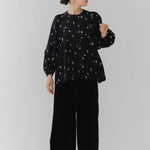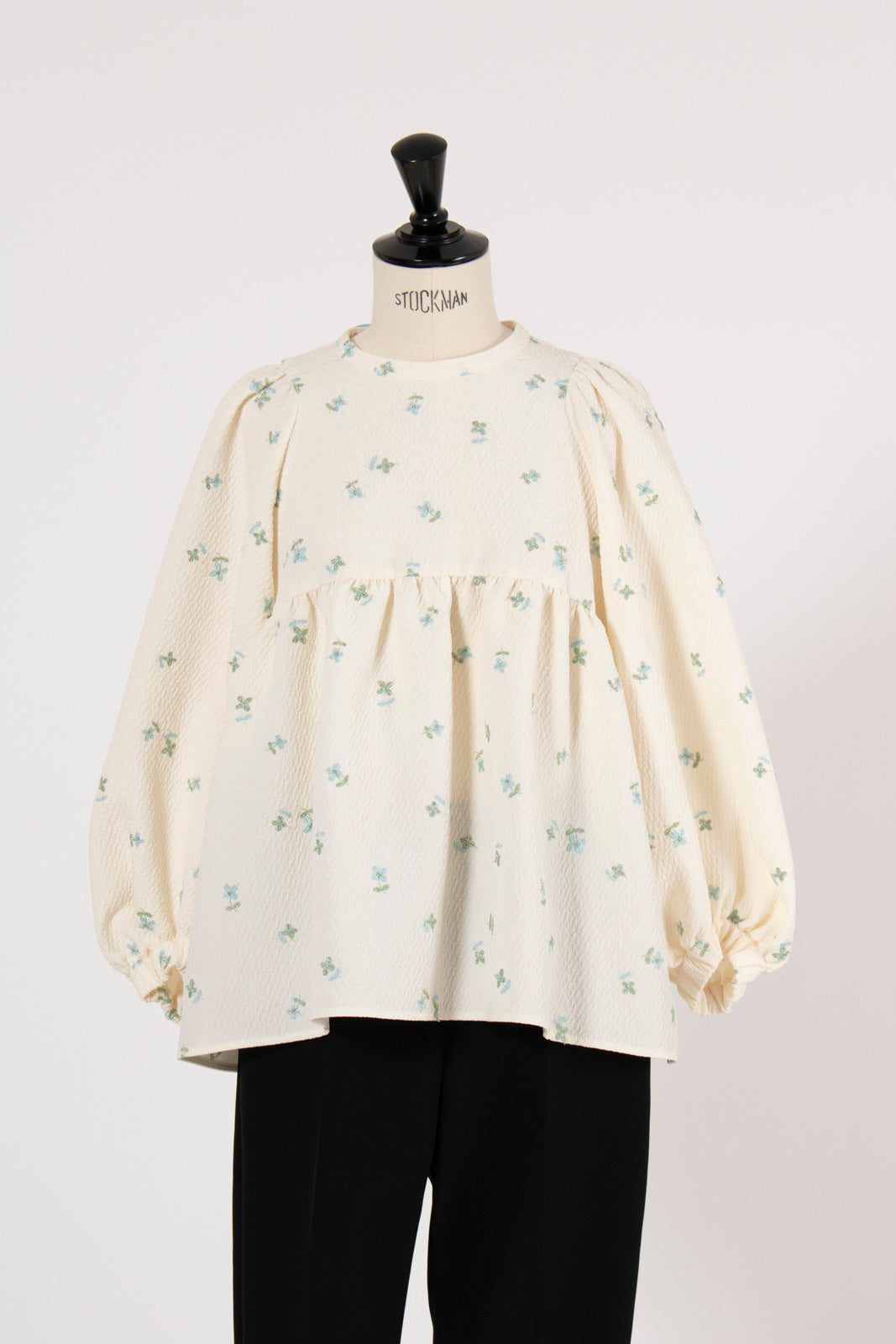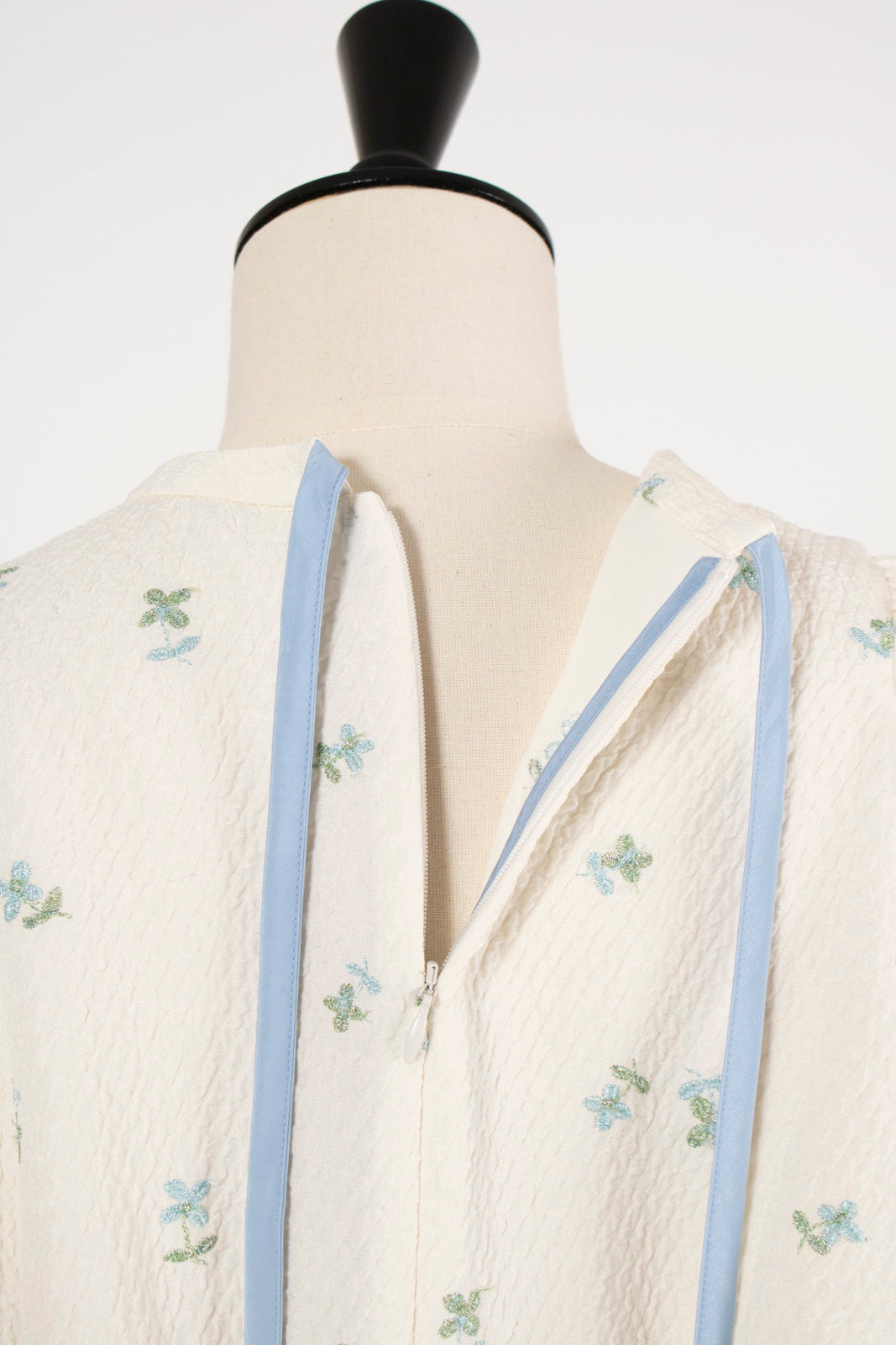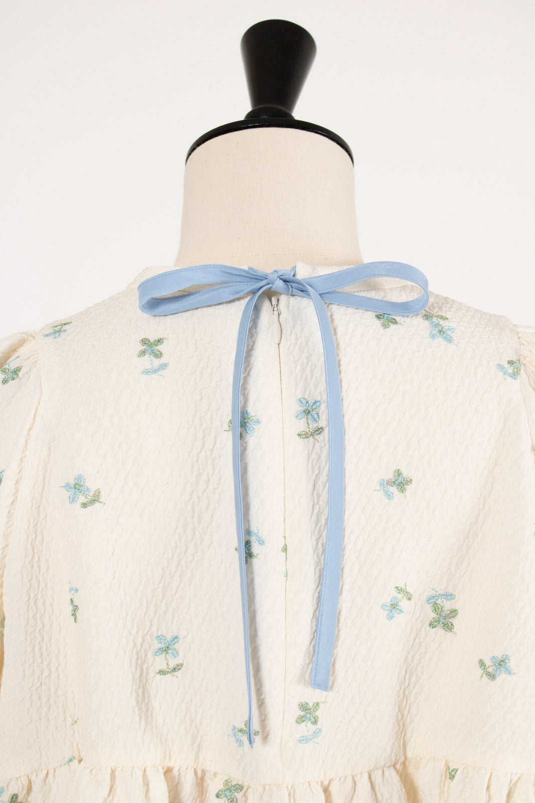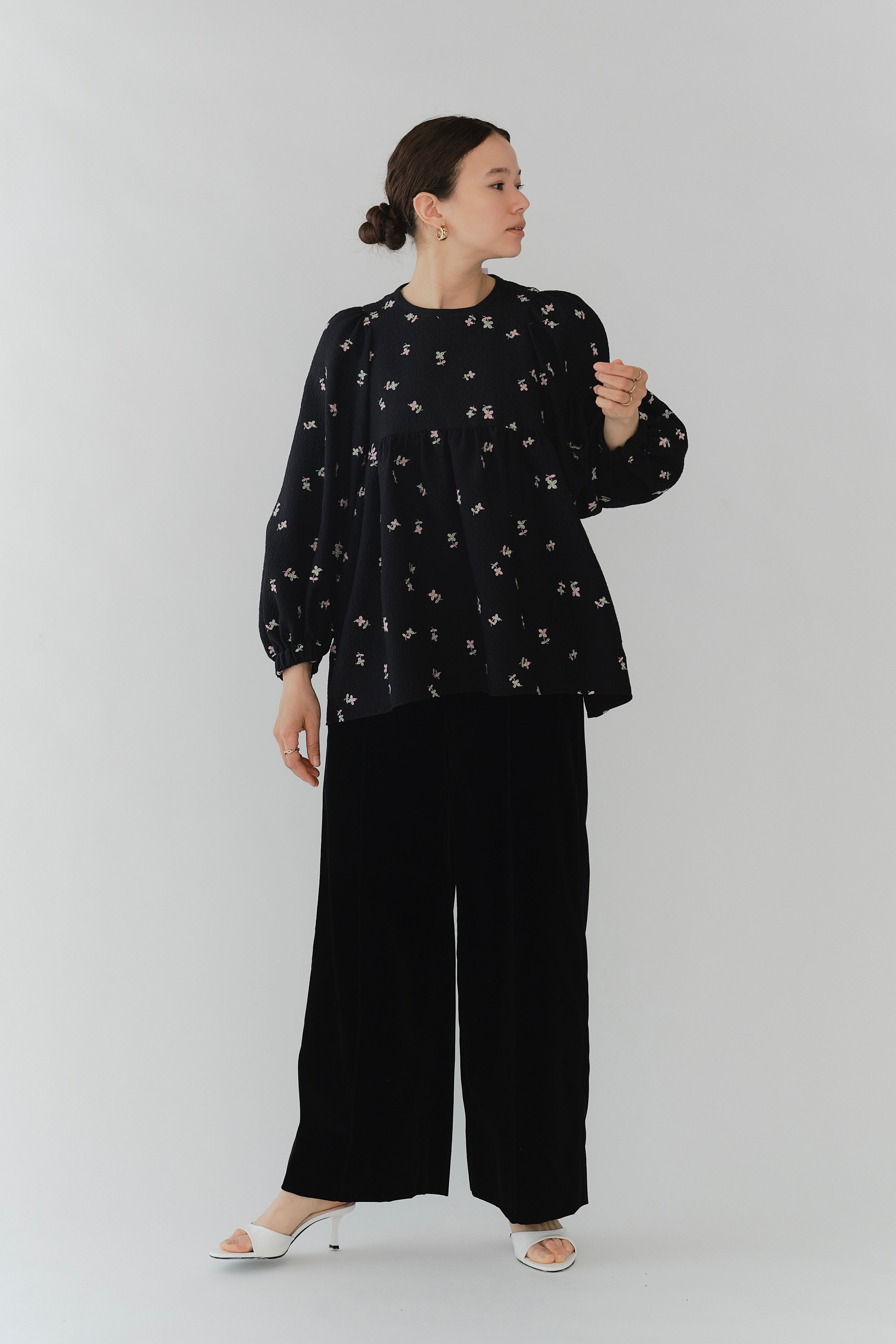 Crafted from our original fukure jacquard fabric, this blouse features enchanting embroidery that dances like shimmering flowers in bloom. The dimensional weave and delicate, lustrous floral embroidery create an extraordinary piece with unparalleled presence. We've captured both sweetness and elegance in every detail. Soft puff sleeves and generous gathers create a flattering silhouette that skims the body while making shoulders and waist appear delicately refined. Elastic cuffs allow you to easily roll sleeves to the elbow for practical versatility, while the color-coordinated back ribbon tie complements the embroidery beautifully. Wrinkle-resistant and machine washable for easy home care. This effortlessly stylish piece stands beautifully on its own, making coordination simple. Perfect for everything from daily wear to special occasions.