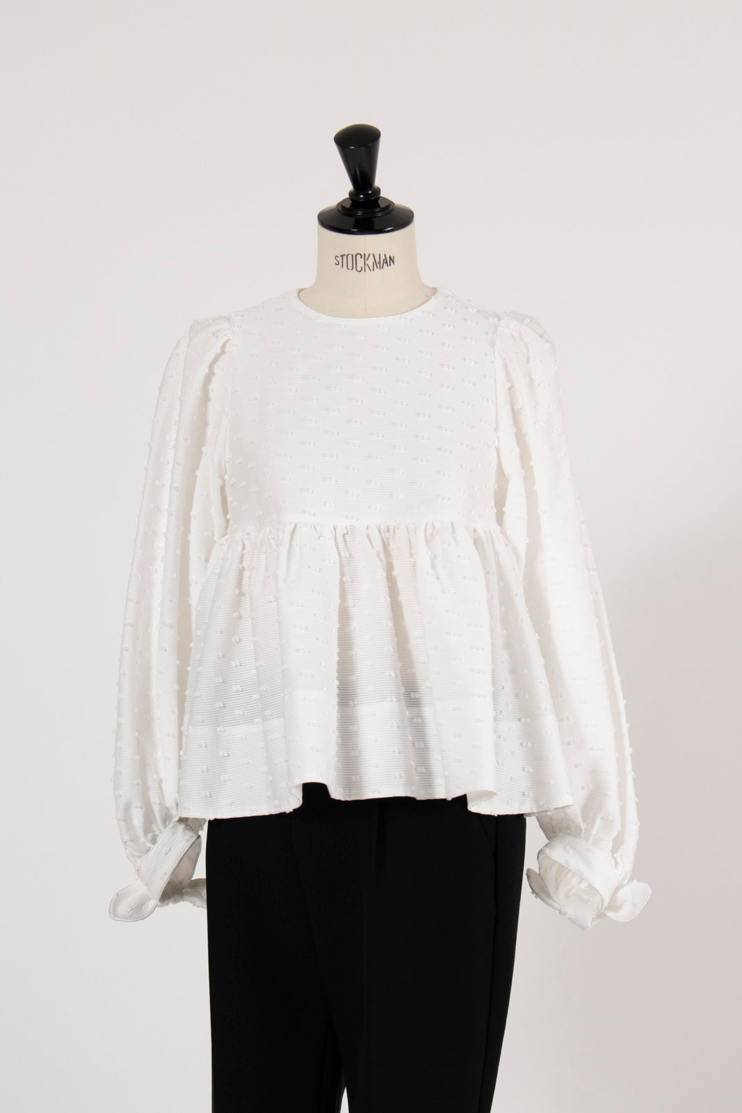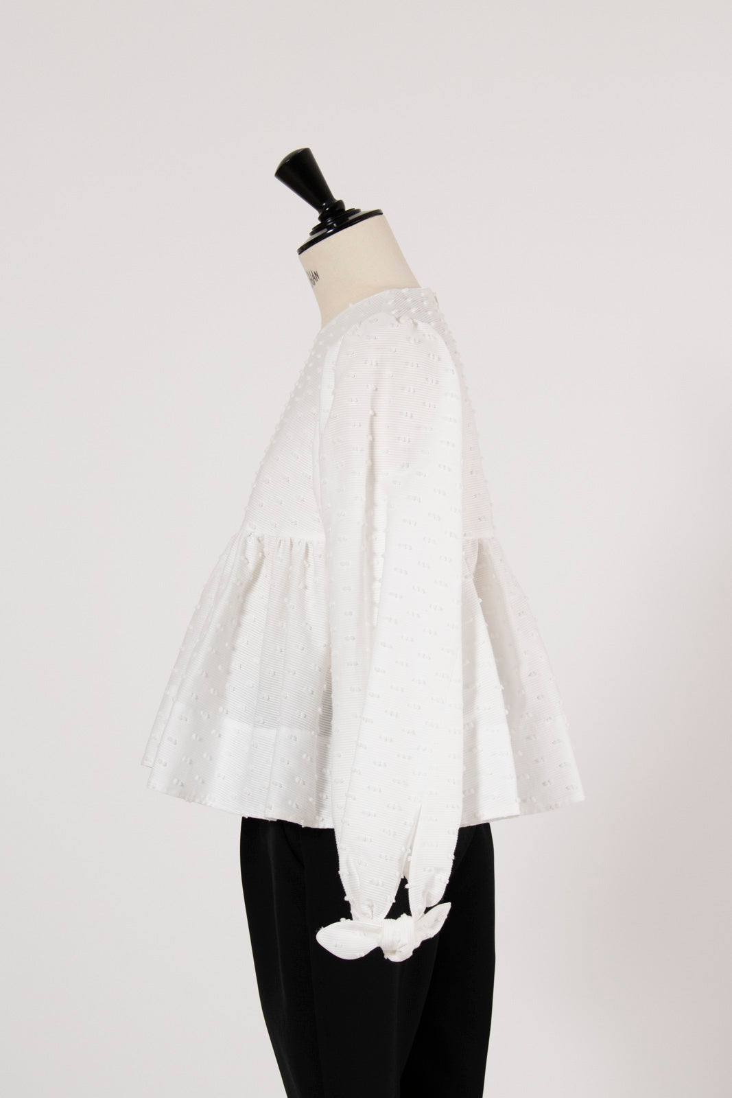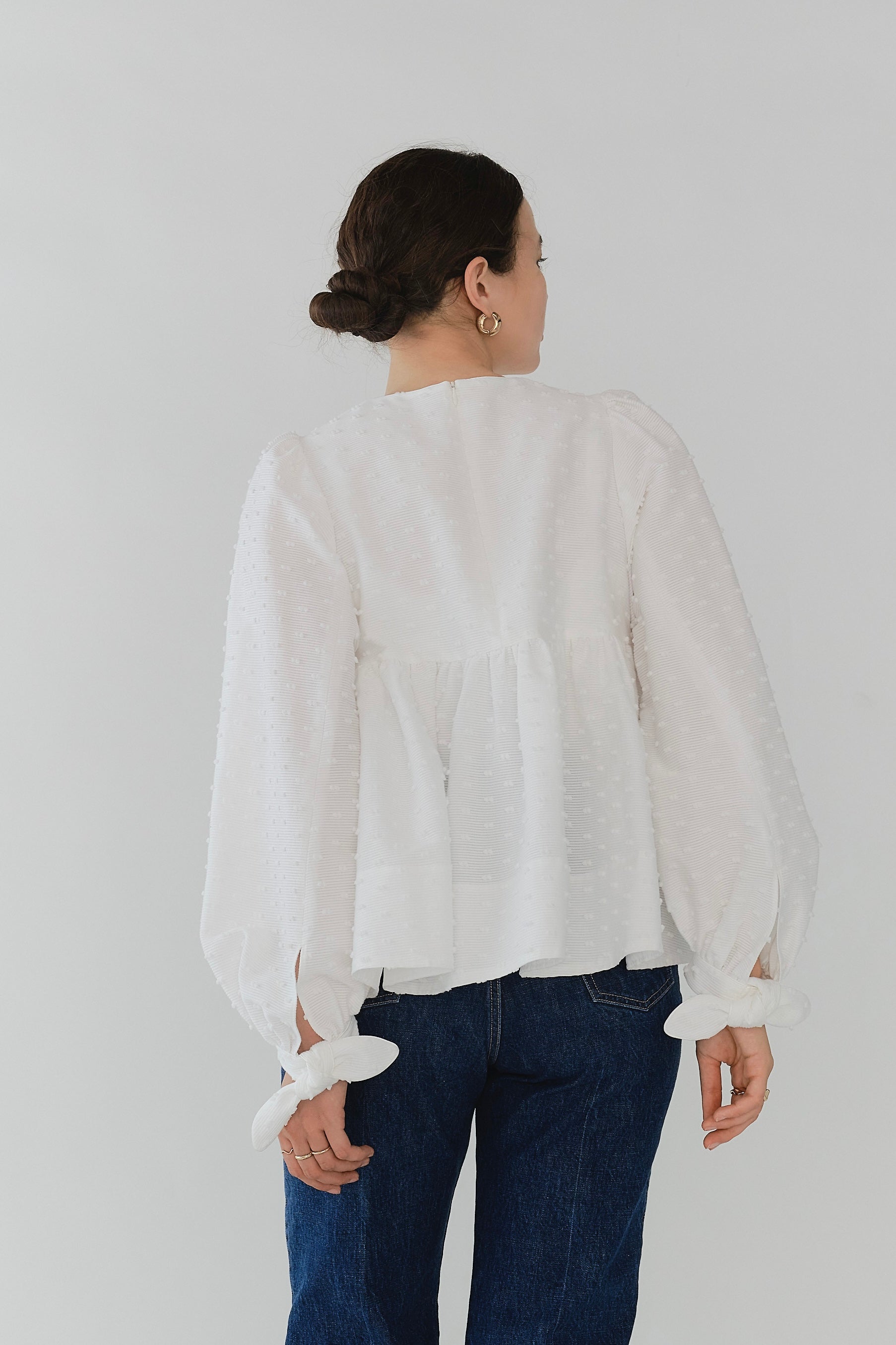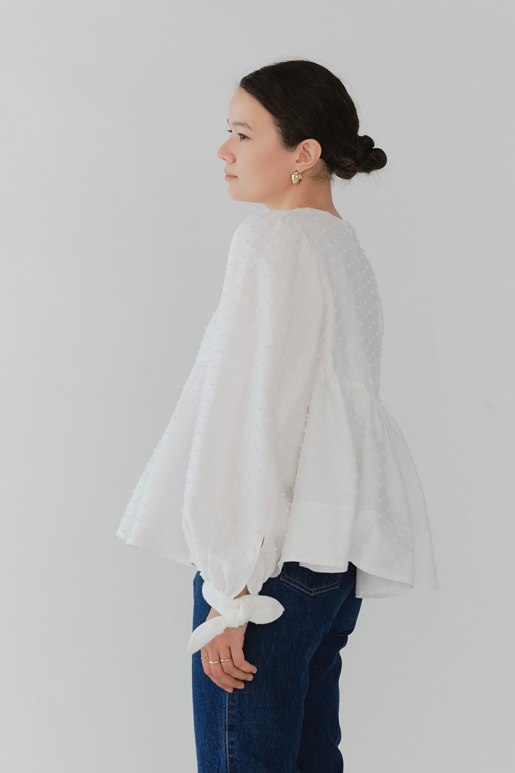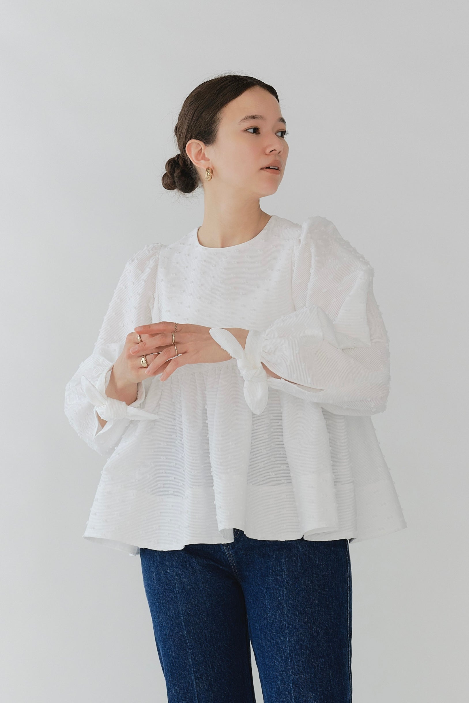 A gathered blouse adorned with delicate snow flowers. Crafted from our luxurious original jacquard fabric featuring charming raised dots that create dimension and elegance. The generous gathers sway gracefully with every movement, creating a delicate feminine silhouette. The bodice and back are double-layered to prevent inner garments from showing through. The sleeve ribbons are sewn in place for easy tying, and they look lovely peeking out from under outerwear. Subtle satin piping at the neckline and cuffs adds a refined touch. Style it with tailored pants for a feminine look, or pair it with denim for casual elegance—this versatile piece adapts to various aesthetics. A must-have wardrobe addition that radiates charm from every angle.