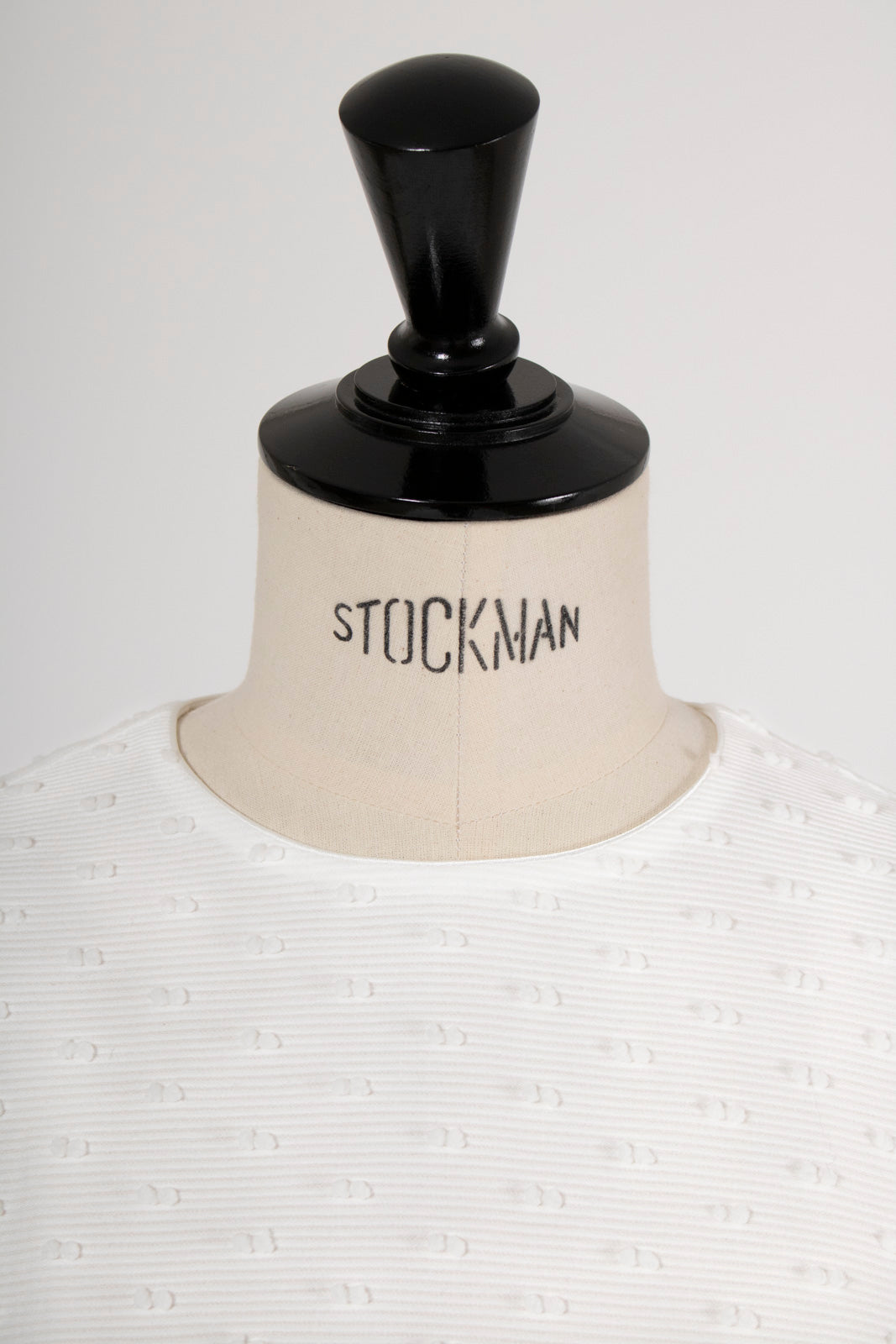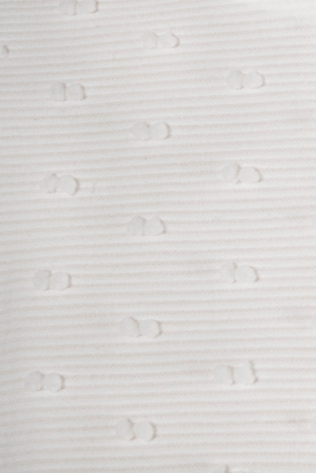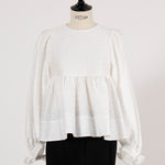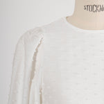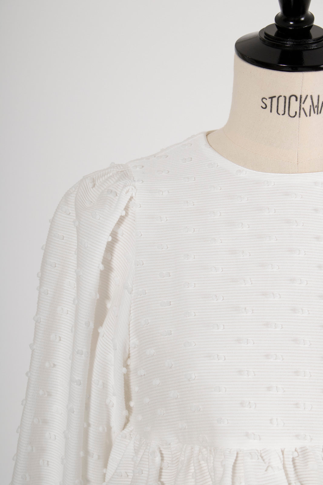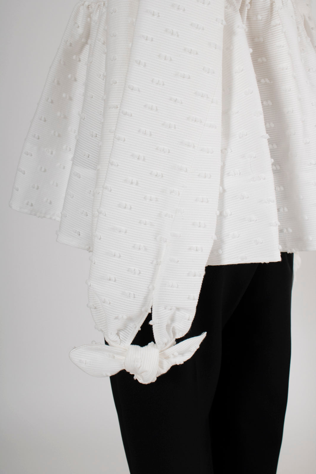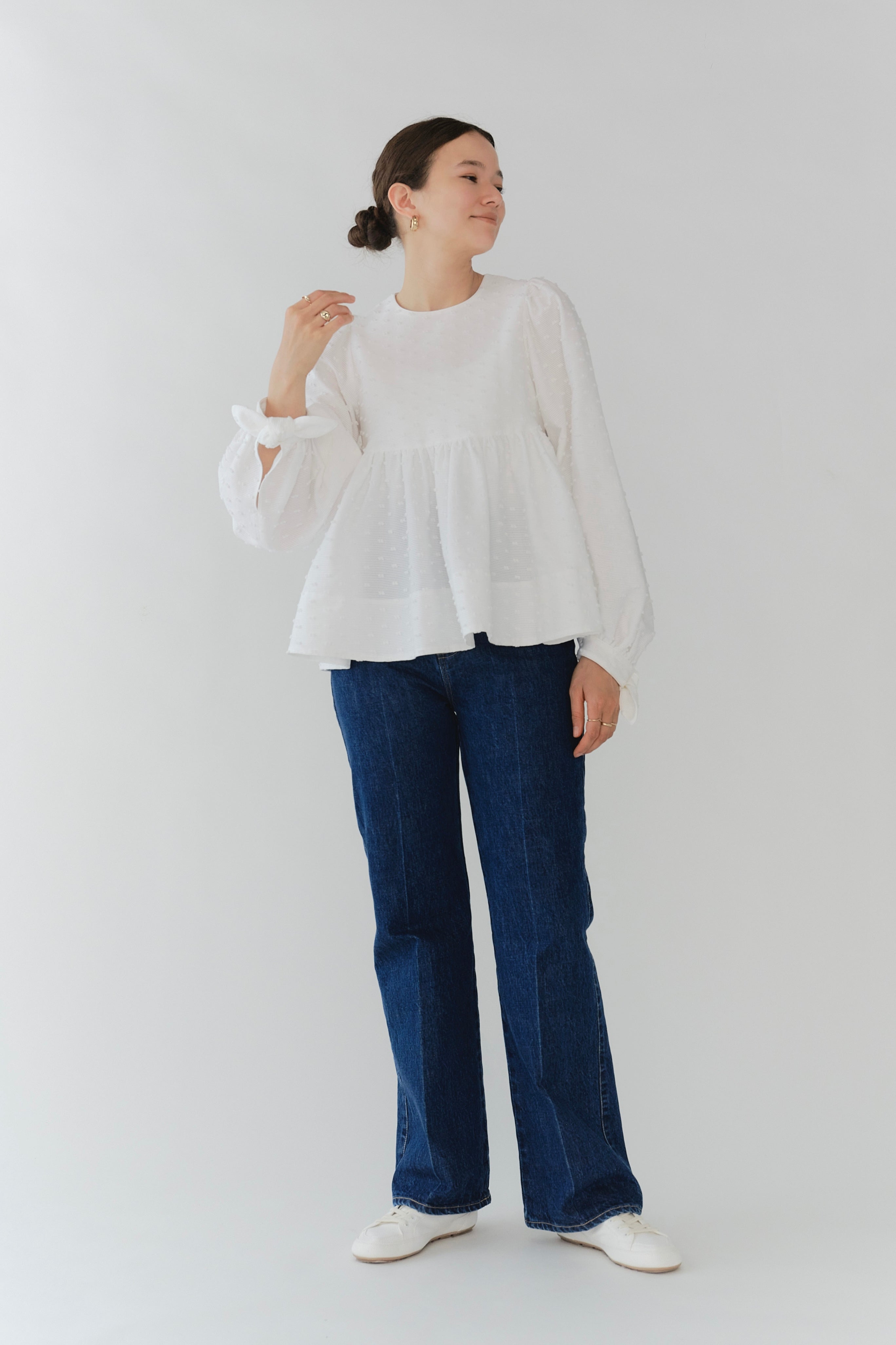 A gathered blouse adorned with delicate snow flowers. Crafted from our luxurious original jacquard fabric featuring charming raised dots that create dimension and elegance. The generous gathers sway gracefully with every movement, creating a delicate feminine silhouette. The bodice and back are double-layered to prevent inner garments from showing through. The sleeve ribbons are sewn in place for easy tying, and they look lovely peeking out from under outerwear. Subtle satin piping at the neckline and cuffs adds a refined touch. Style it with tailored pants for a feminine look, or pair it with denim for casual elegance—this versatile piece adapts to various aesthetics. A must-have wardrobe addition that radiates charm from every angle.