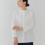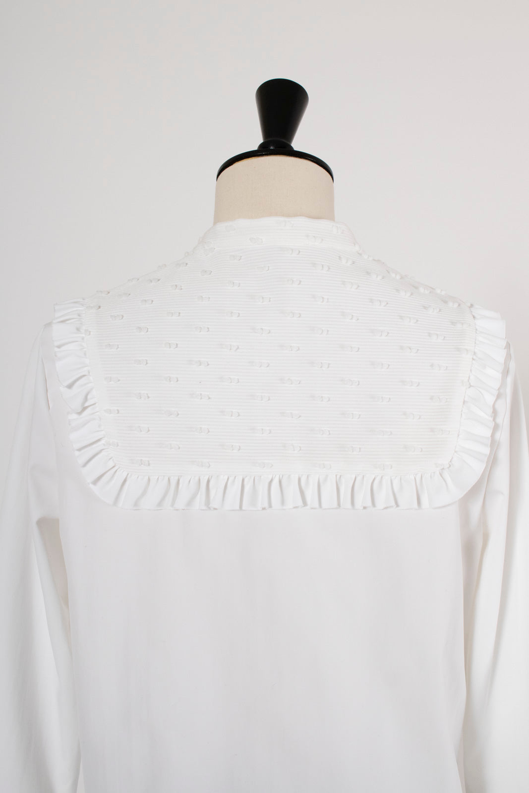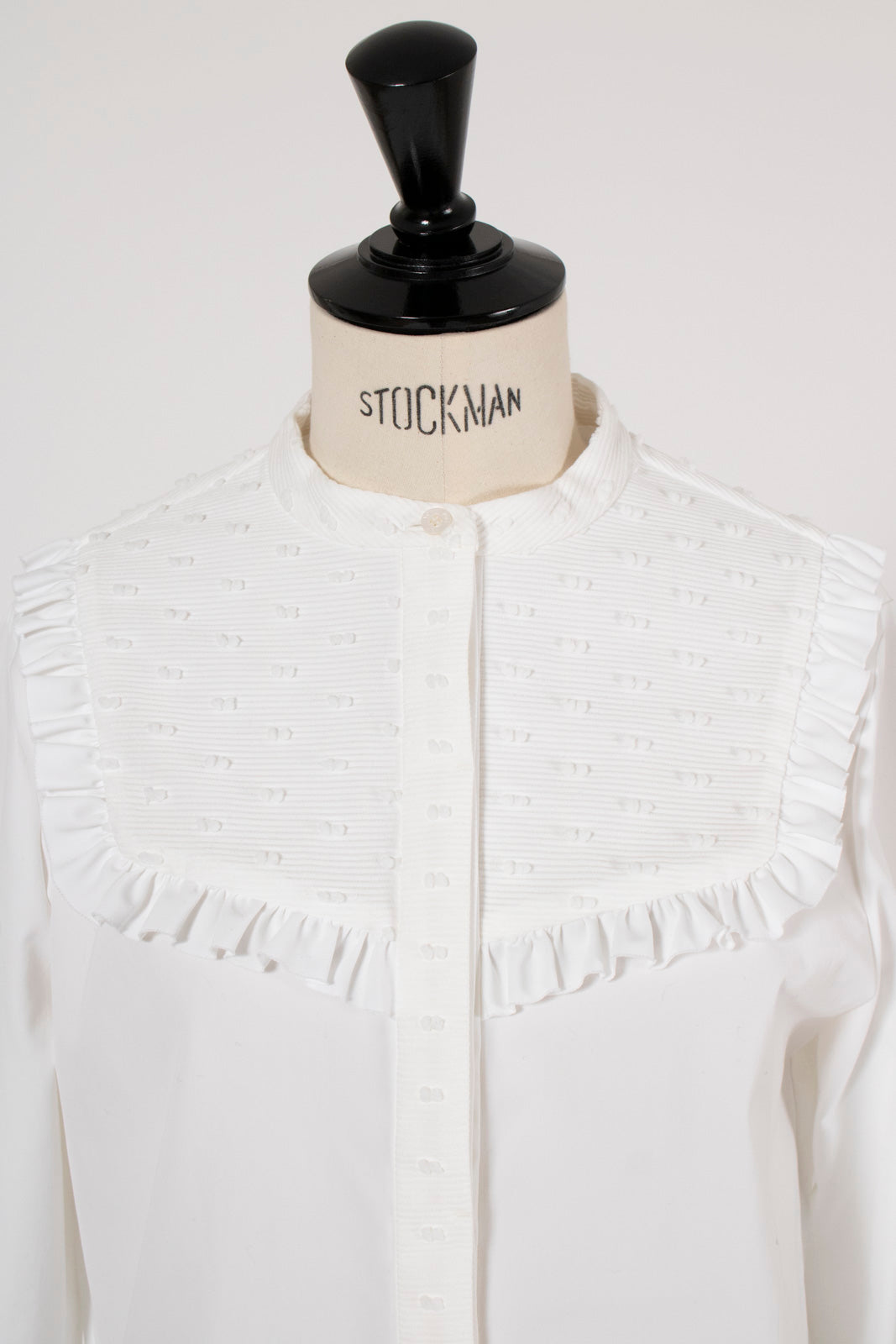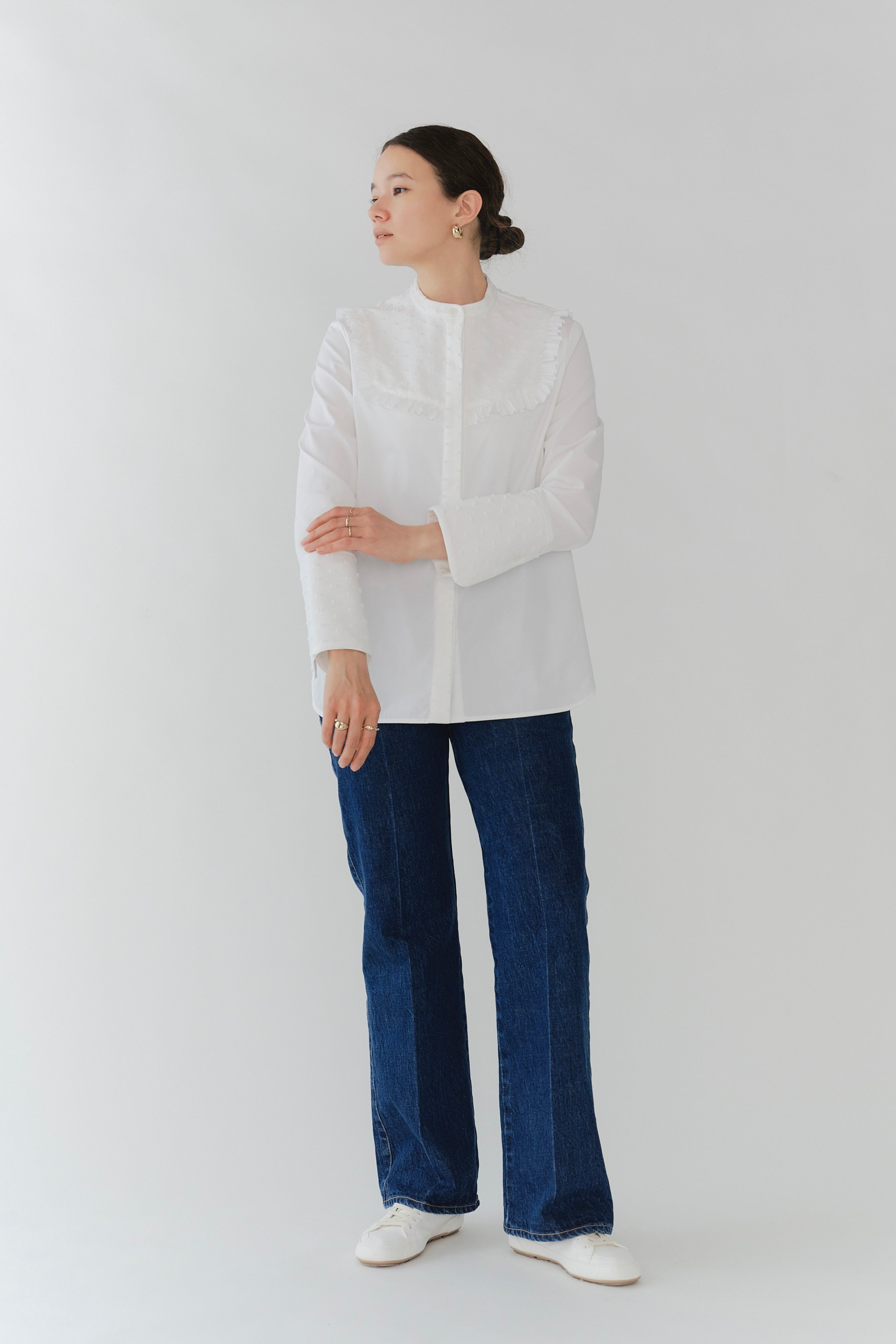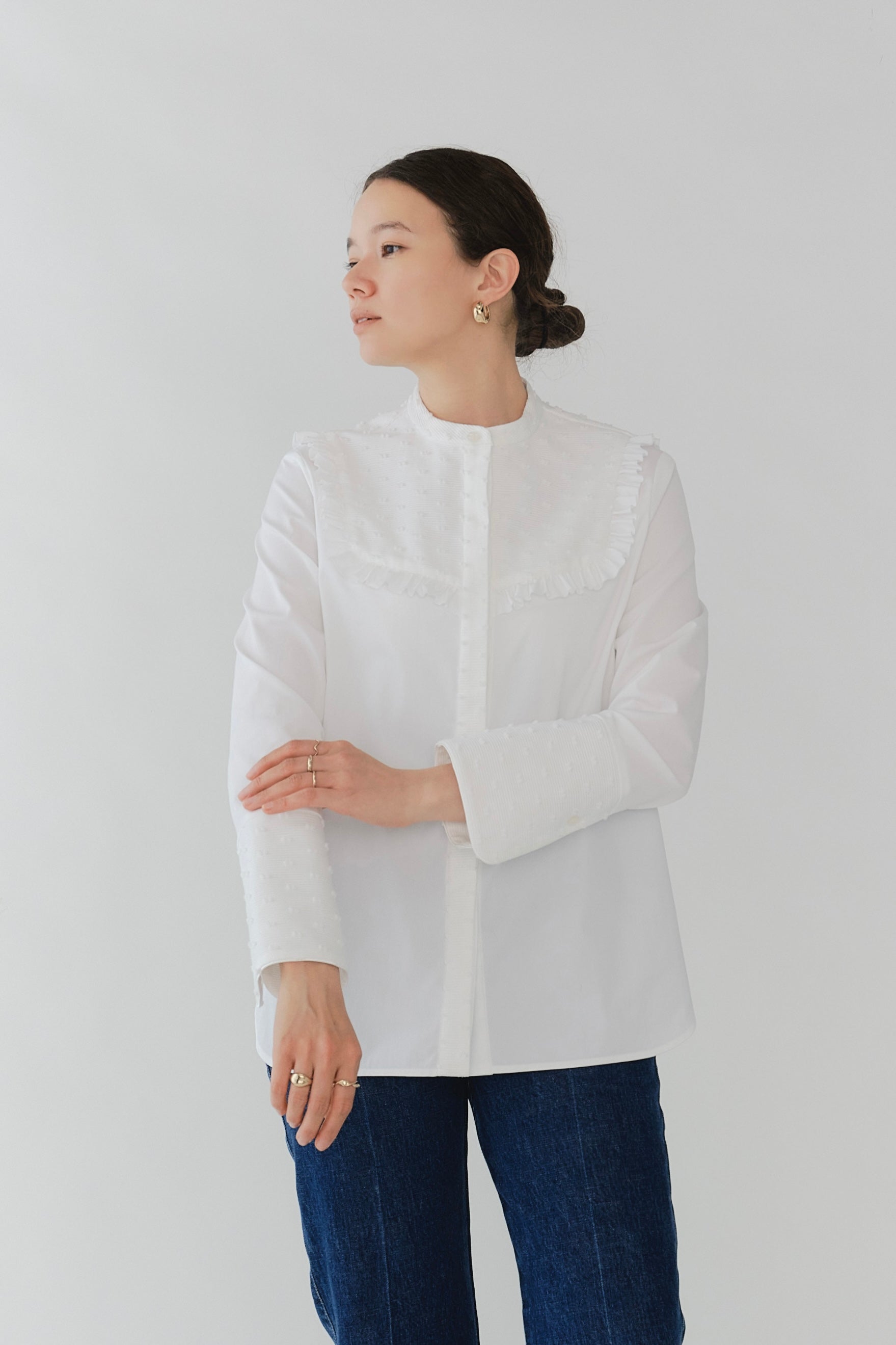 A shirt blouse that looks like tiny snow flowers have fallen. The original jacquard fabric with cute, three-dimensional raised round dots adds a luxurious accent to the overall design. The main body uses a familiar material with a crisp yet supple texture and delicate surface finish. Ruffles carefully gathered from the shoulder to the chest create an elegant presence. The cuffs are intentionally made with the same fabric on the reverse side, allowing you to fold them back for a relaxed, effortlessly stylish look that elevates your outfit. This charming handsome-style top pairs beautifully with wide pants tucked in for a conservative look, or with denim for a casual style—enjoy various styling options depending on your choice of items. Neither too formal nor too casual, this piece is perfect for both ceremonies and daily wear.