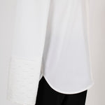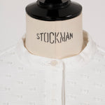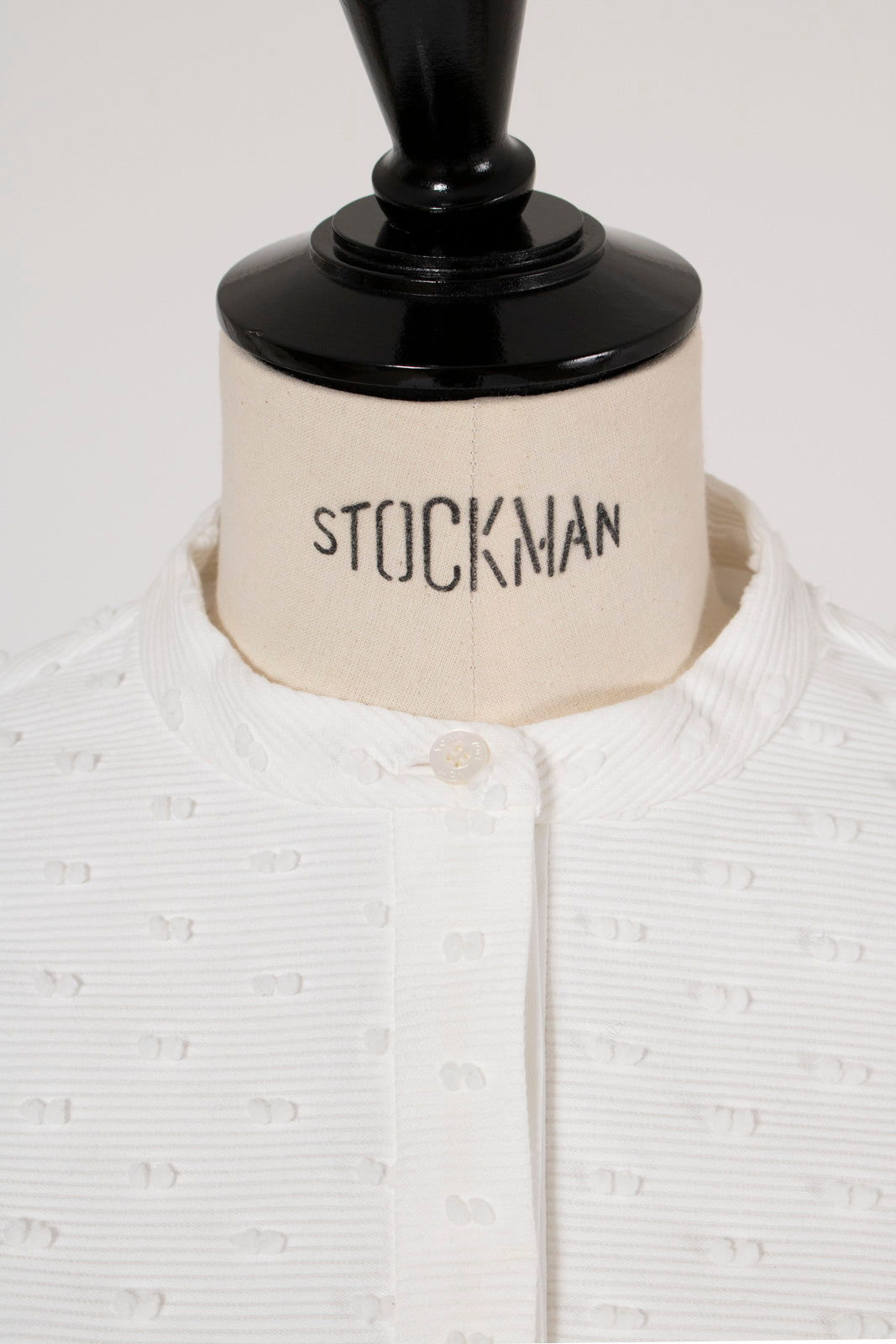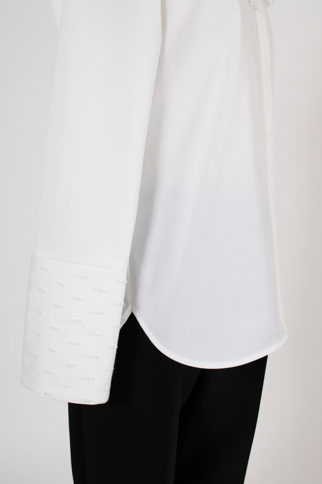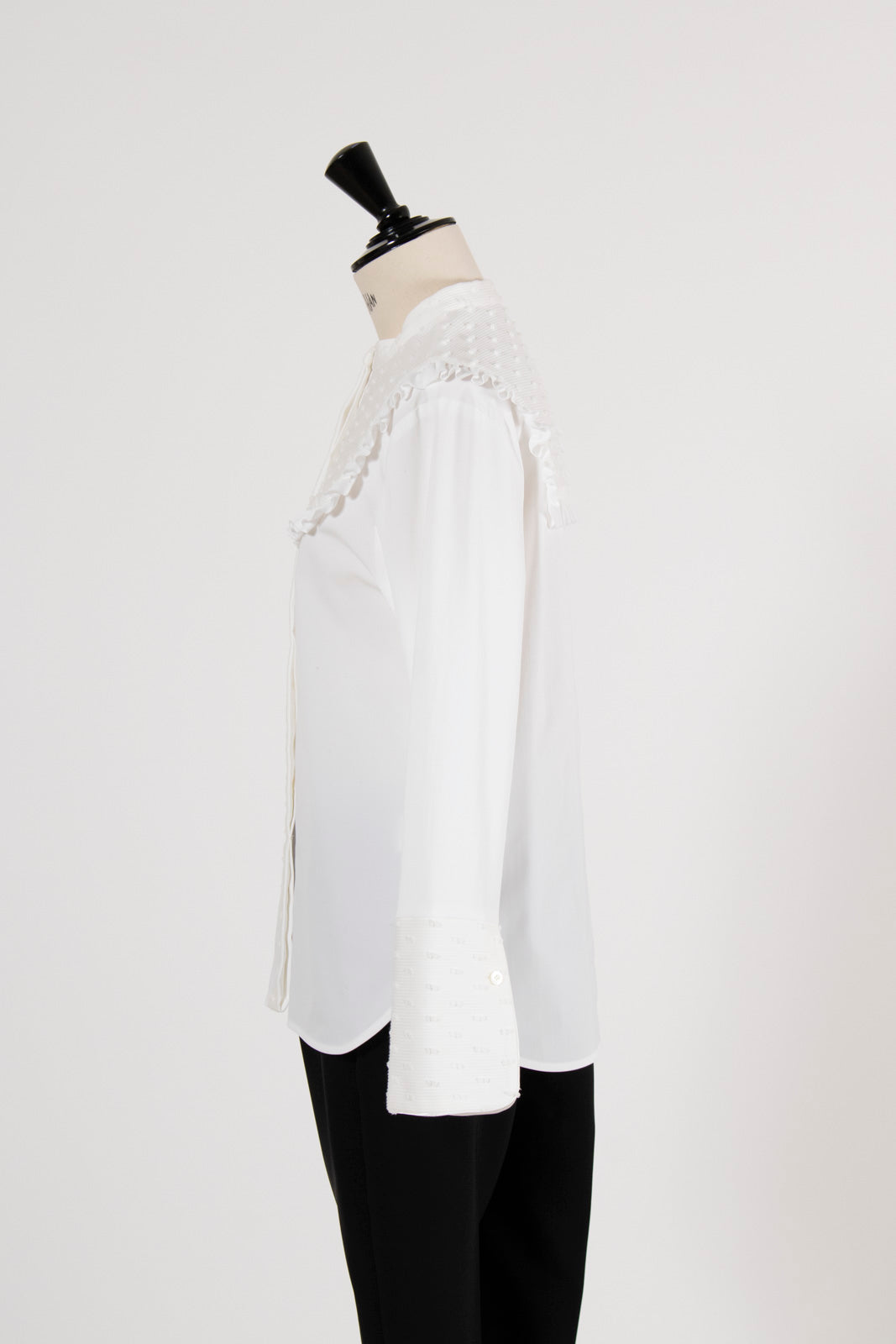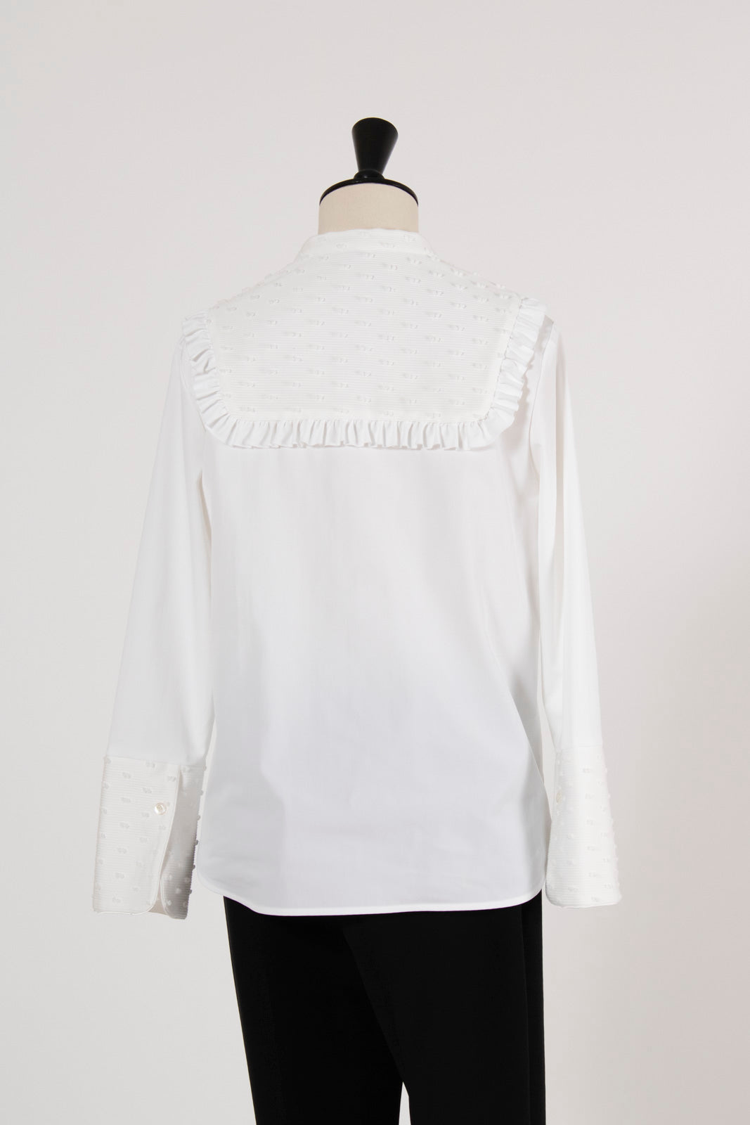 A shirt blouse that looks like tiny snow flowers have fallen. The original jacquard fabric with cute, three-dimensional raised round dots adds a luxurious accent to the overall design. The main body uses a familiar material with a crisp yet supple texture and delicate surface finish. Ruffles carefully gathered from the shoulder to the chest create an elegant presence. The cuffs are intentionally made with the same fabric on the reverse side, allowing you to fold them back for a relaxed, effortlessly stylish look that elevates your outfit. This charming handsome-style top pairs beautifully with wide pants tucked in for a conservative look, or with denim for a casual style—enjoy various styling options depending on your choice of items. Neither too formal nor too casual, this piece is perfect for both ceremonies and daily wear.