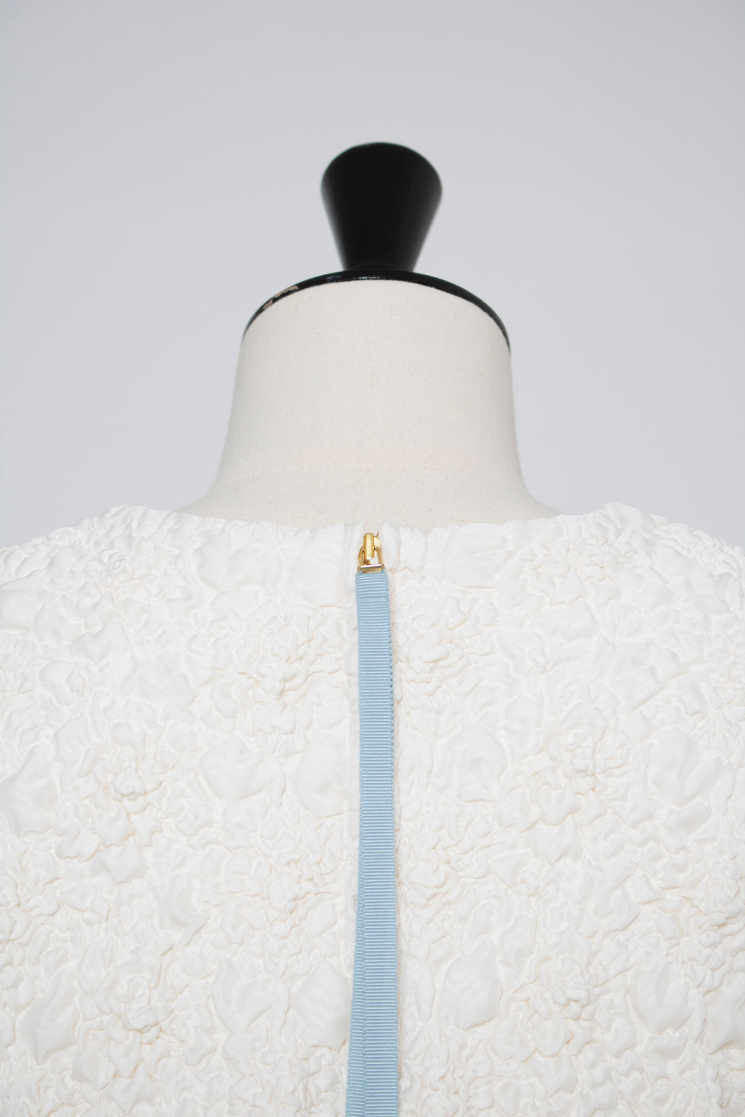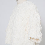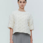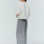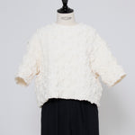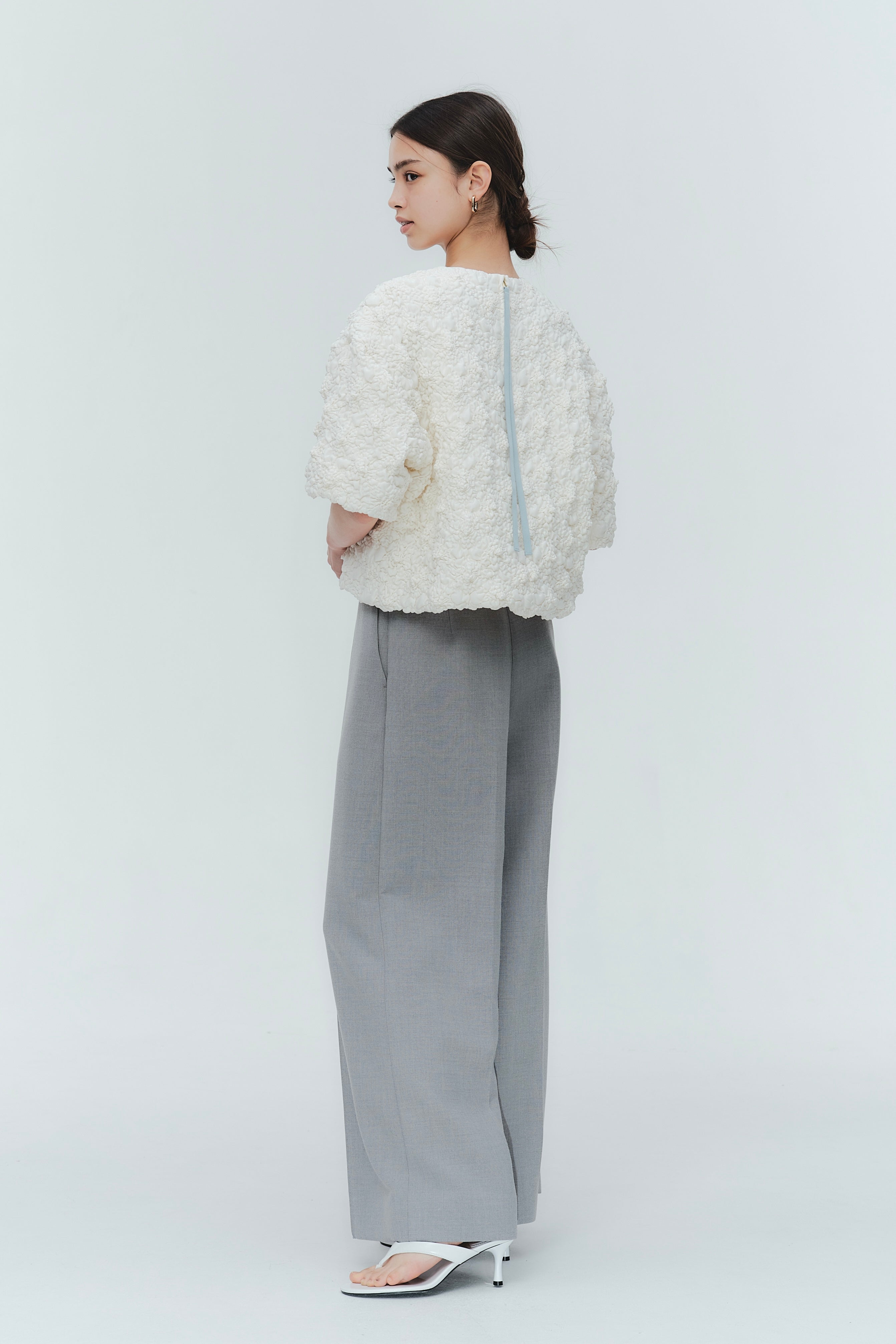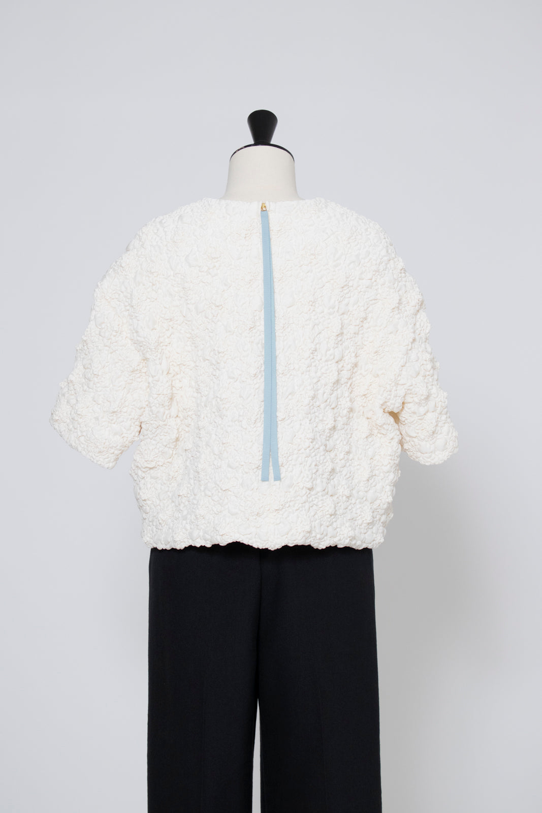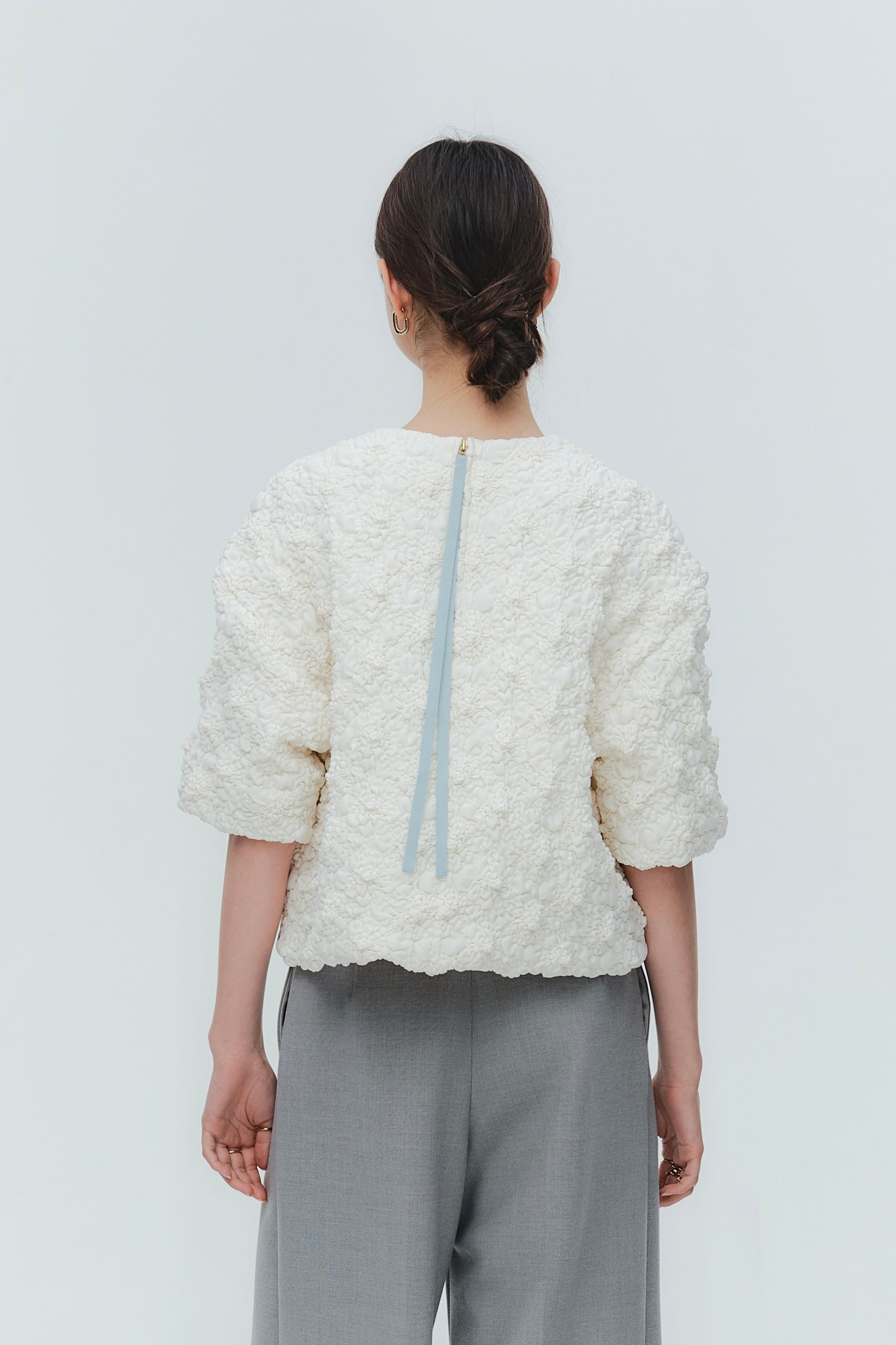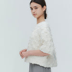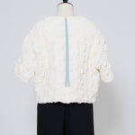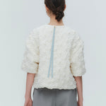 A blouse featuring shirocon's signature three-dimensional texture. Lustrous satin fabric is layered with sheer organza, then delicately embroidered together with lightweight cotton to create a soft, airy volume. The silhouette is simple, yet the back features a zipper opening and contrasting ties that sway playfully with every movement. The lining uses jersey fabric for a soft touch and comfortable wear. Combining a modern aesthetic with light, airy materials, this blouse adds a special touch to everyday outfits. A delightful piece that offers both design appeal and comfort.