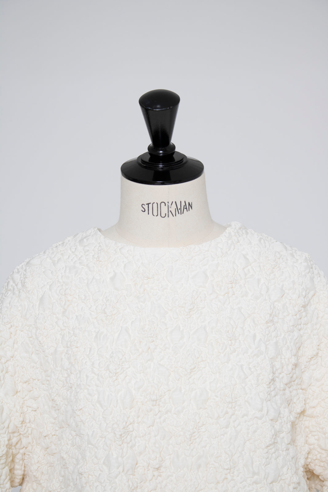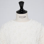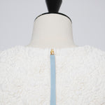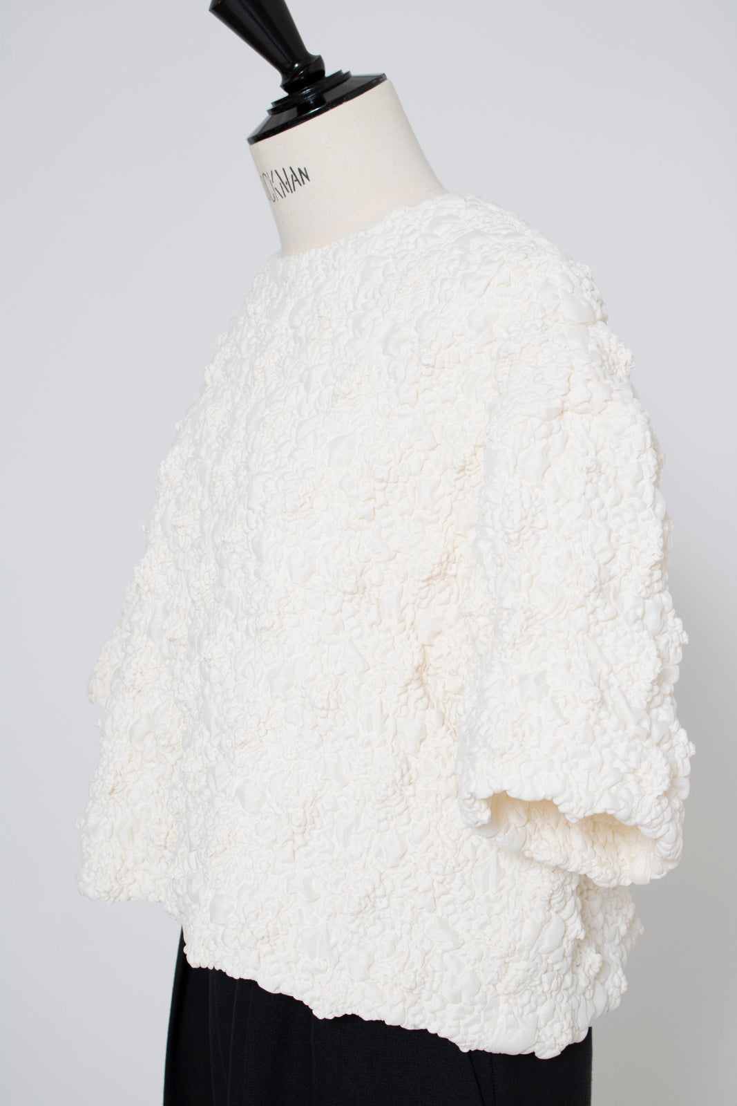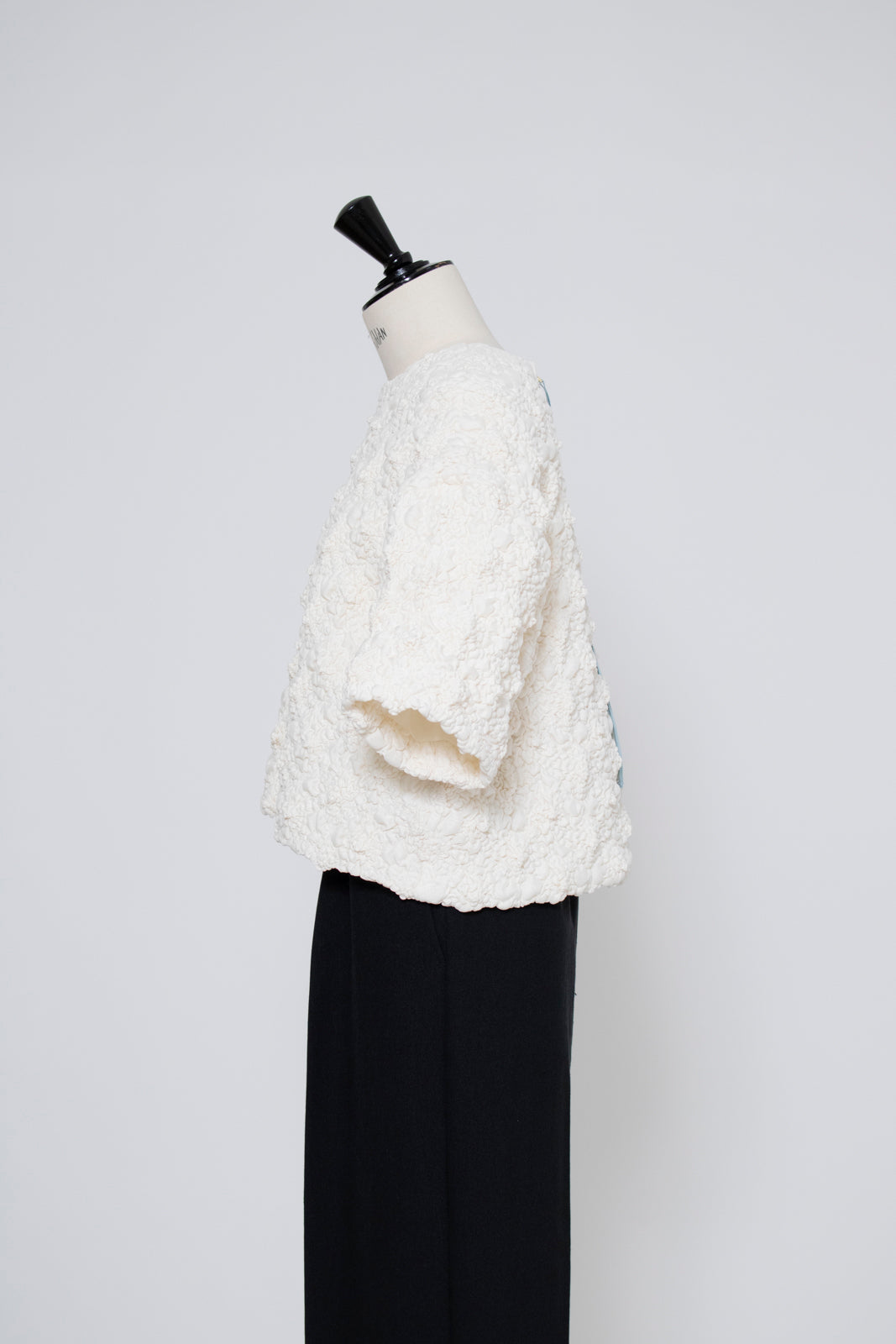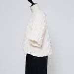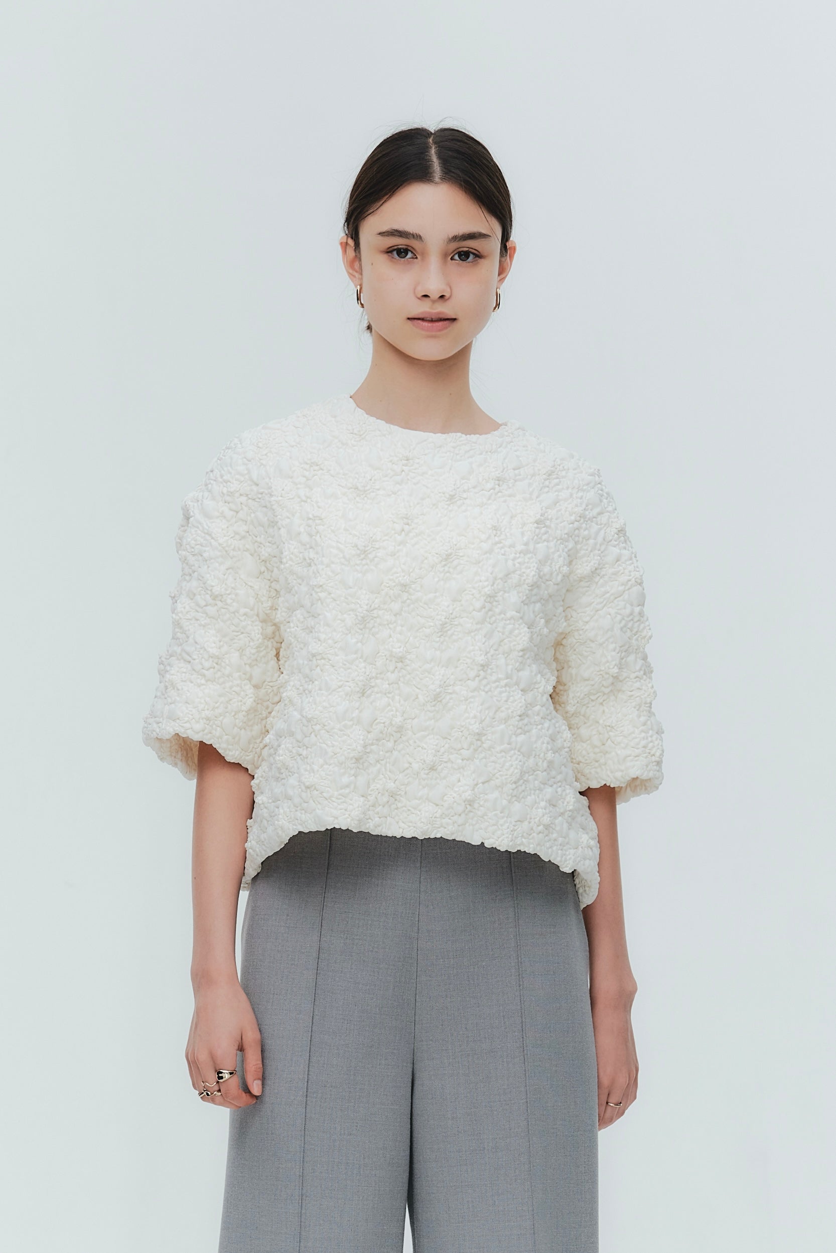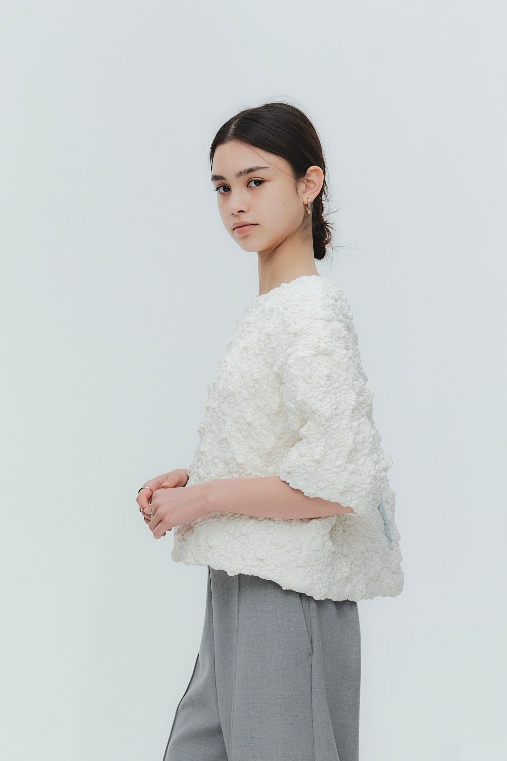 A blouse featuring shirocon's signature three-dimensional texture. Lustrous satin fabric is layered with sheer organza, then delicately embroidered together with lightweight cotton to create a soft, airy volume. The silhouette is simple, yet the back features a zipper opening and contrasting ties that sway playfully with every movement. The lining uses jersey fabric for a soft touch and comfortable wear. Combining a modern aesthetic with light, airy materials, this blouse adds a special touch to everyday outfits. A delightful piece that offers both design appeal and comfort.