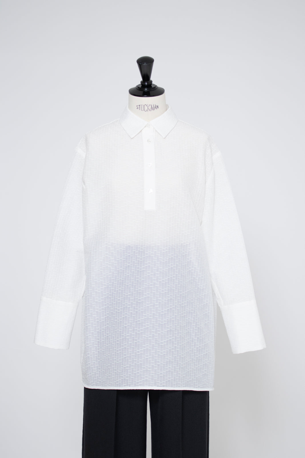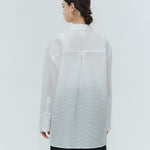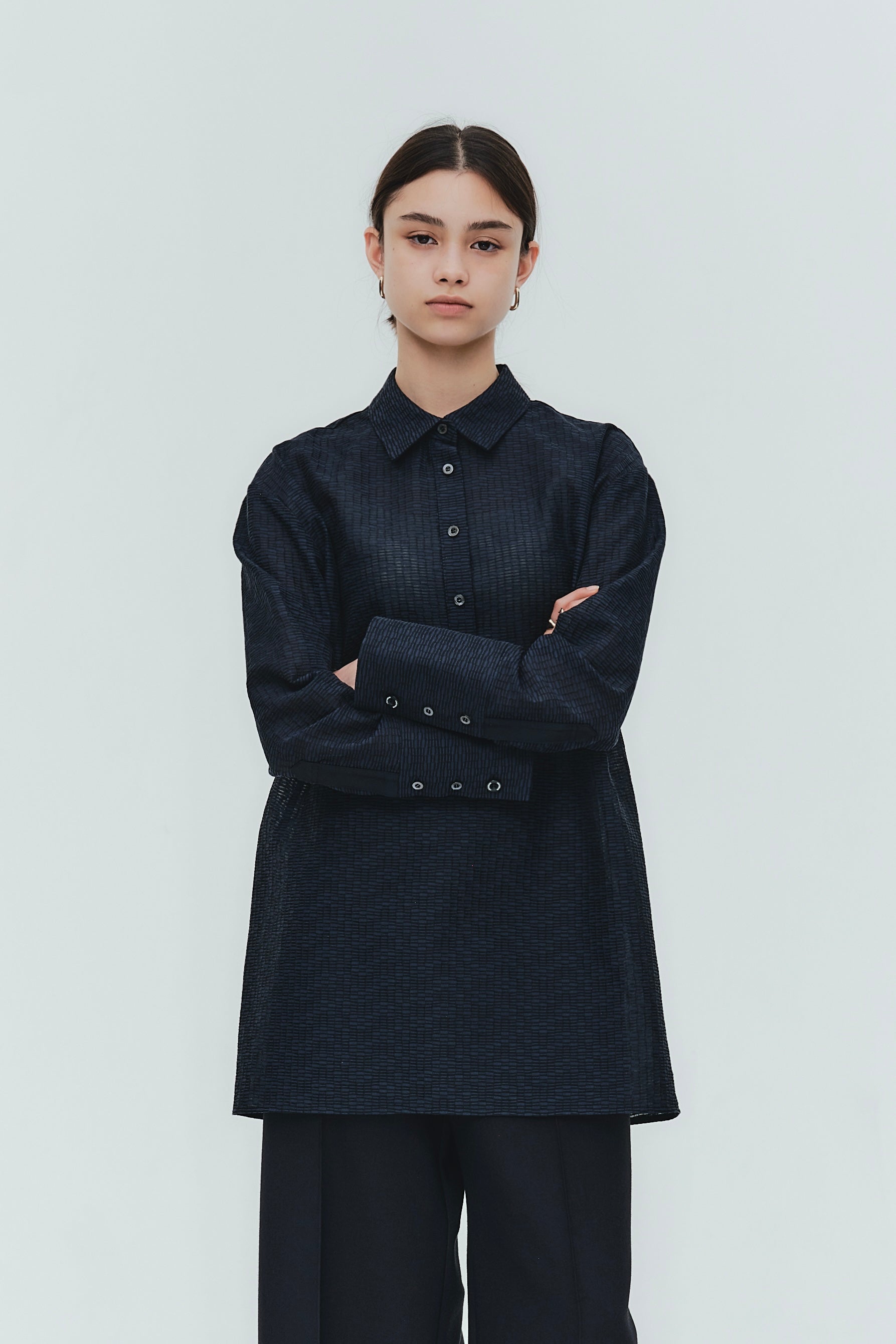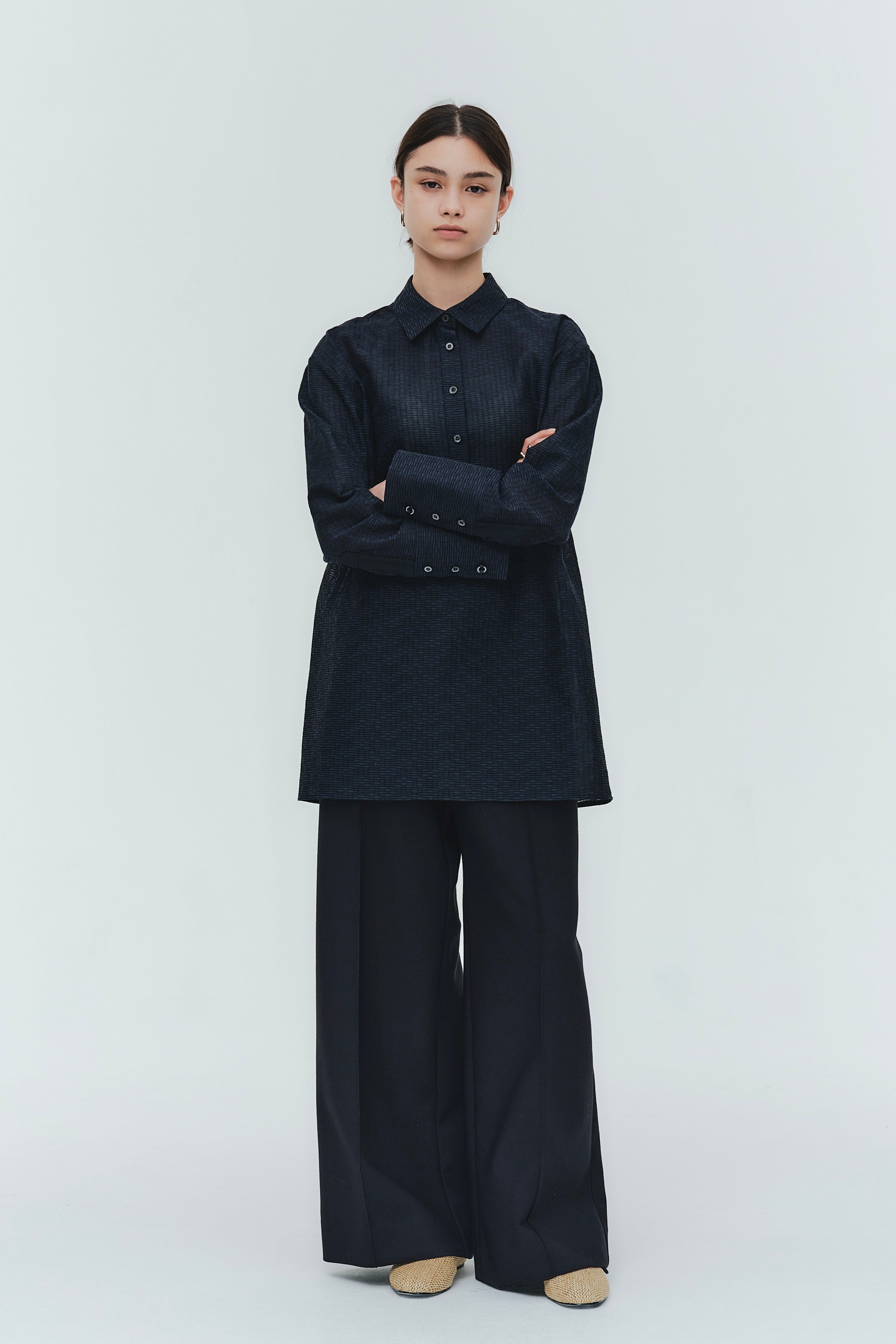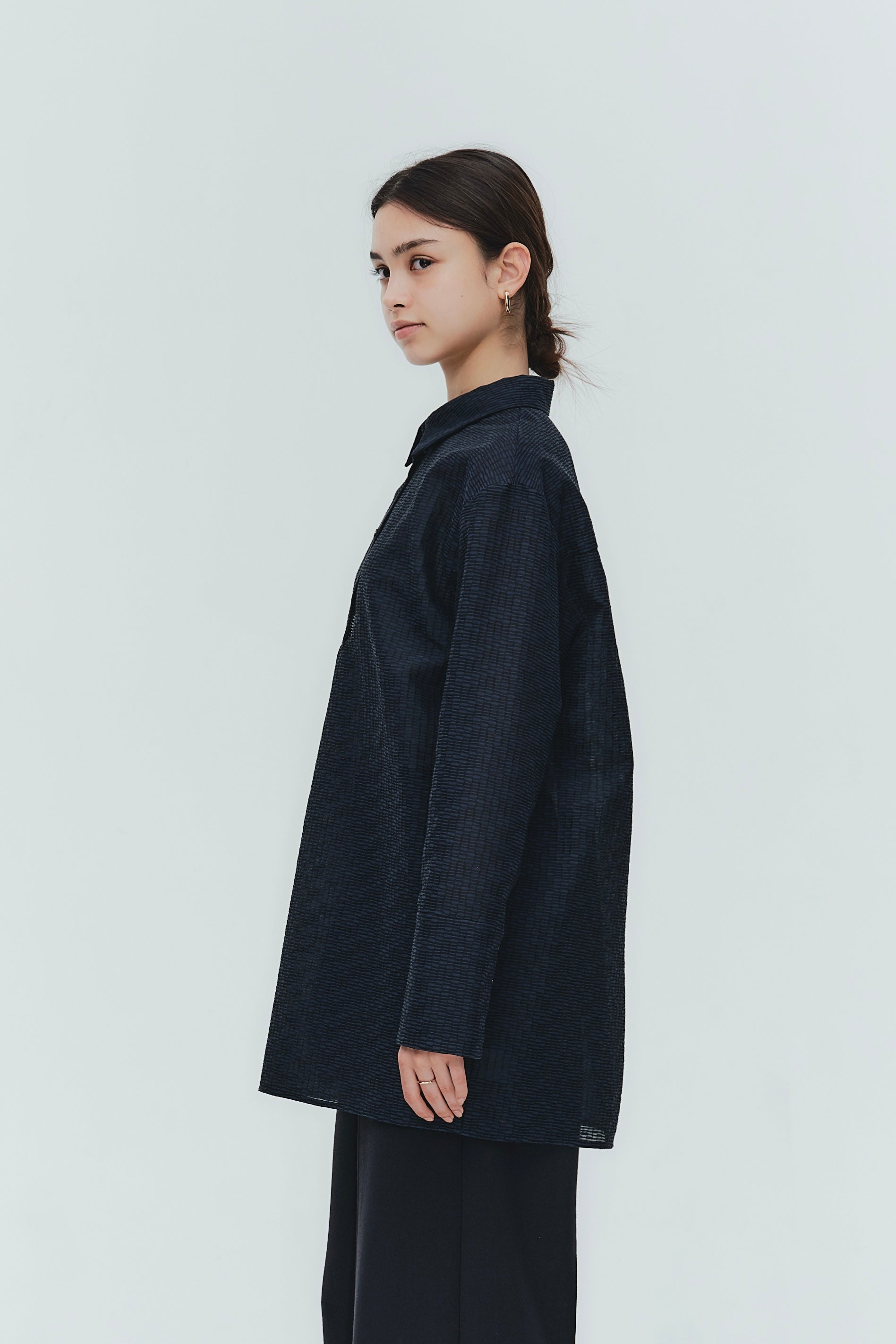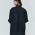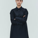 Crafted from post-dyed jacquard fabric made in Japan, this shirt features a textured, dimensional surface that exudes elegance without being overly ornate, achieving a refined and sophisticated finish. The design features a collared henley neckline with front button closure for easy wear. Two types of buttons are combined to add a subtle accent. The moderately longer length covers the hips, ensuring a relaxed and comfortable fit without concern for the hip area. With its refined fabric and polished design, this blouse creates an intelligent and graceful impression perfect for the modern woman.
