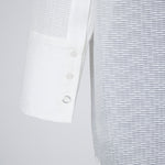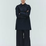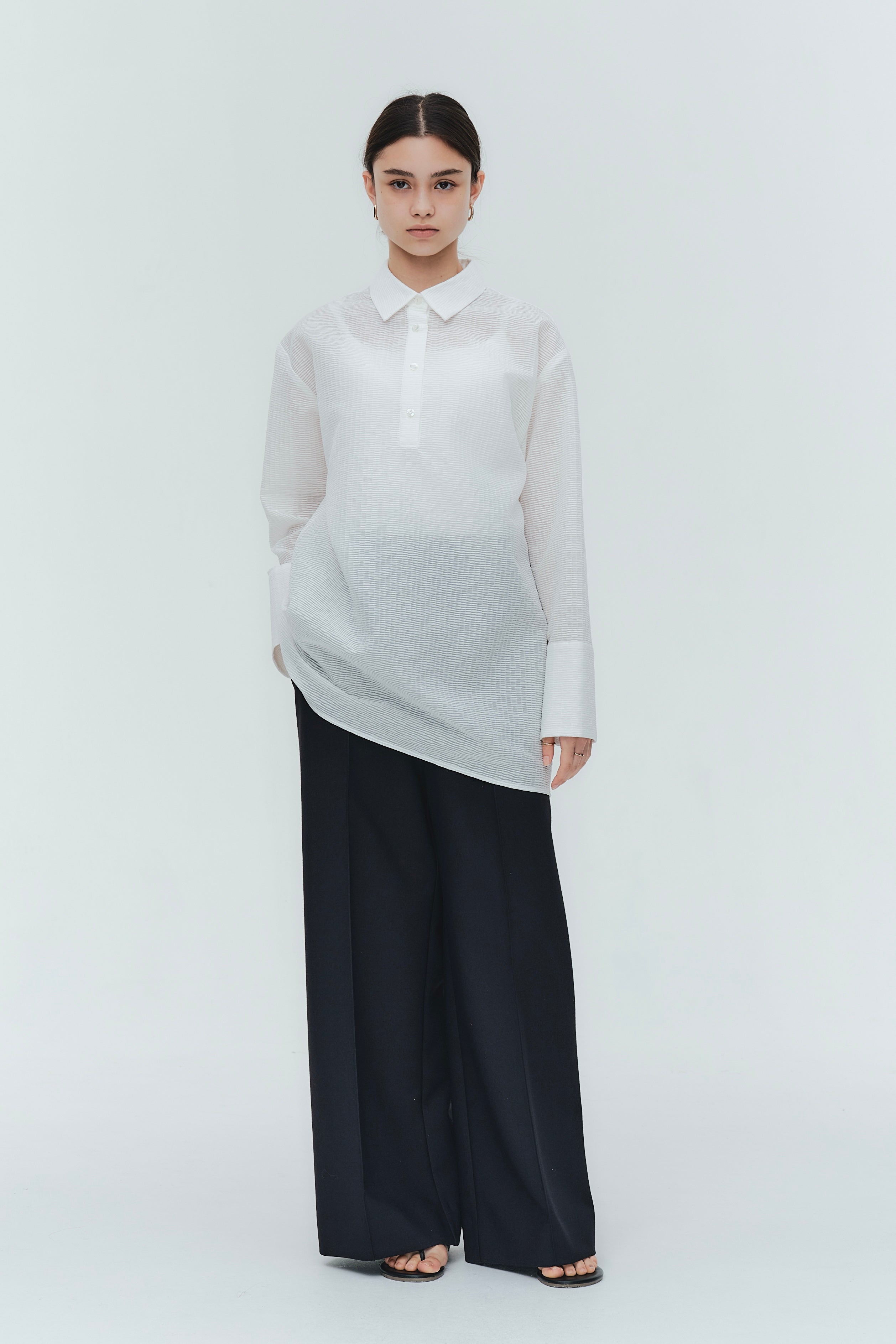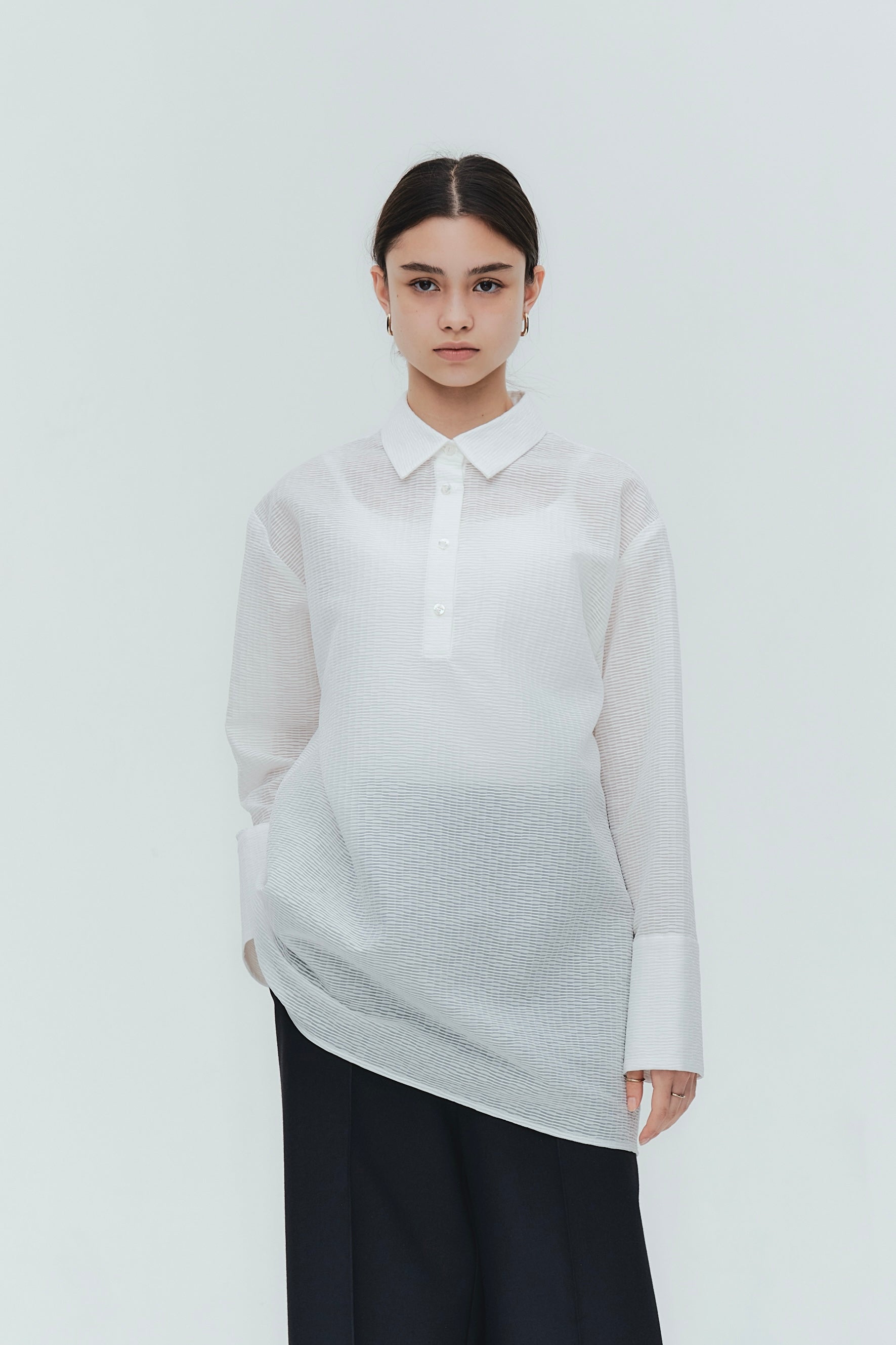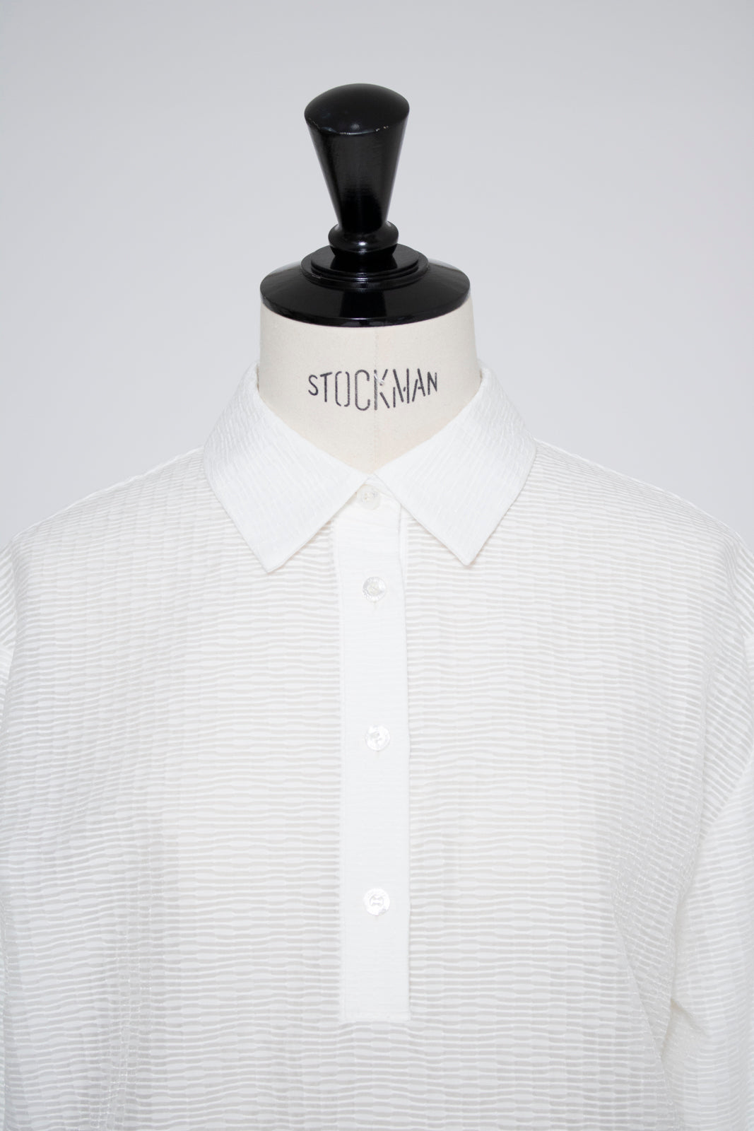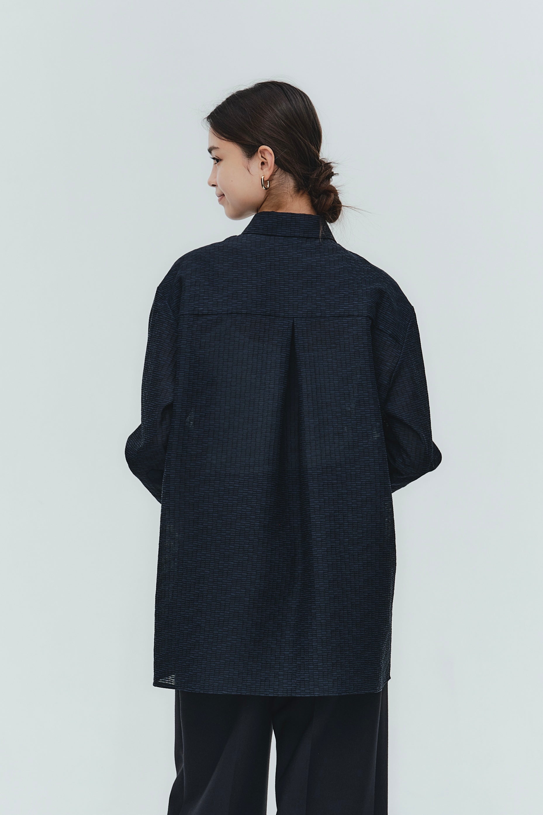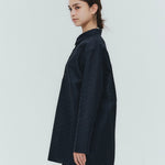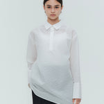 Crafted from post-dyed jacquard fabric made in Japan, this shirt features a textured, dimensional surface that exudes elegance without being overly ornate, achieving a refined and sophisticated finish. The design features a collared henley neckline with front button closure for easy wear. Two types of buttons are combined to add a subtle accent. The moderately longer length covers the hips, ensuring a relaxed and comfortable fit without concern for the hip area. With its refined fabric and polished design, this blouse creates an intelligent and graceful impression perfect for the modern woman.
