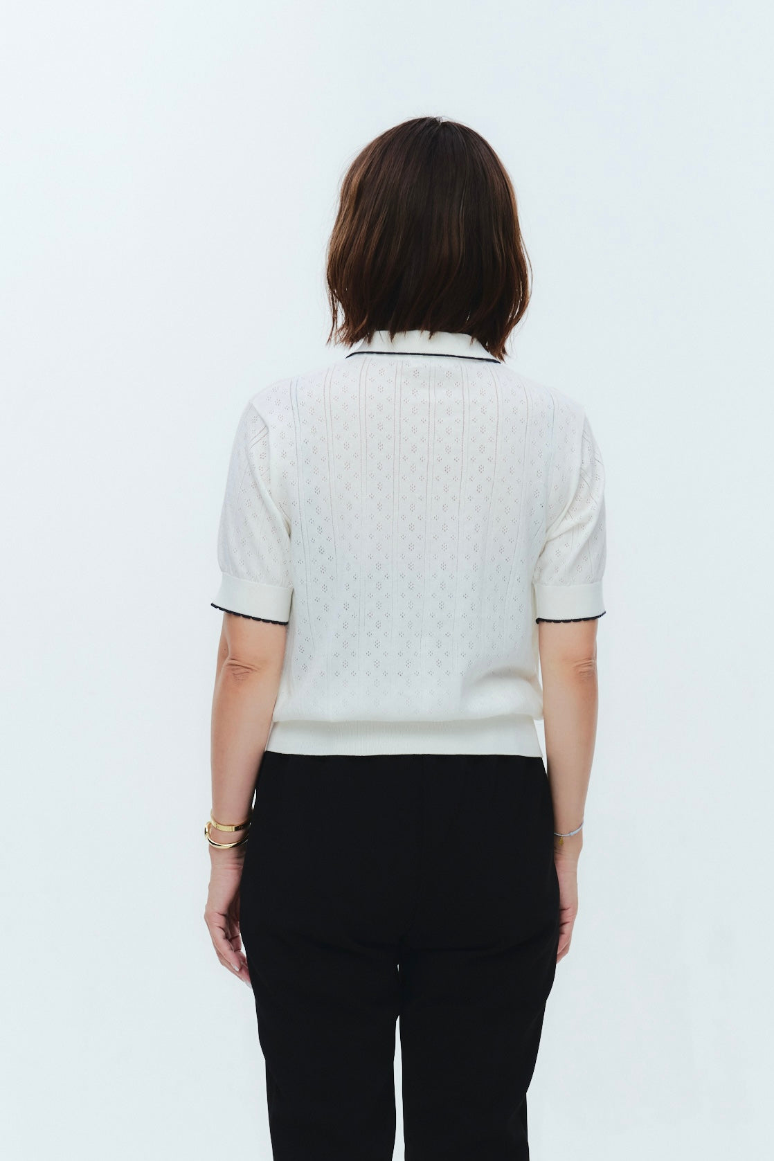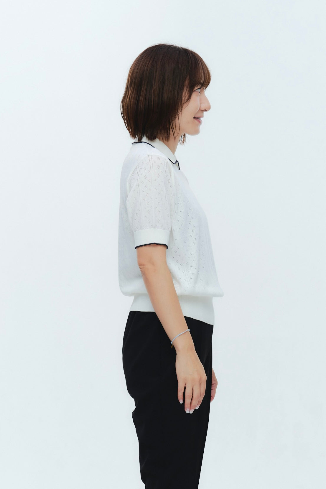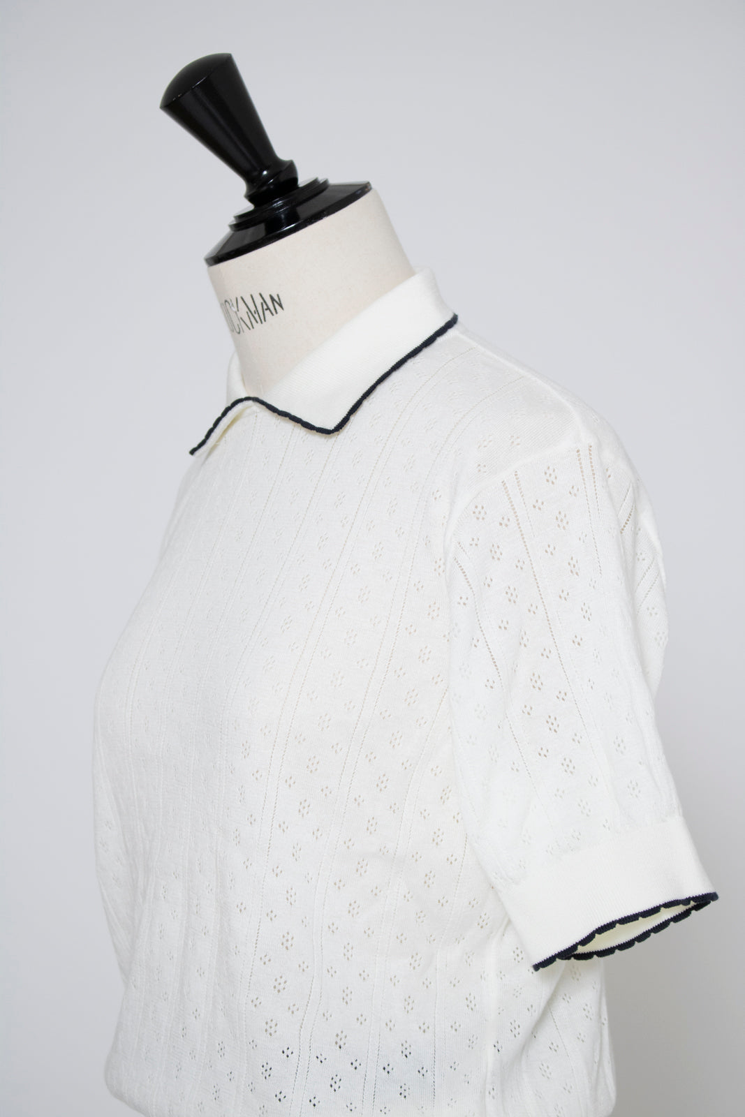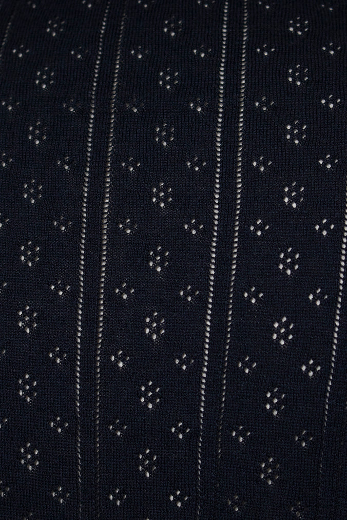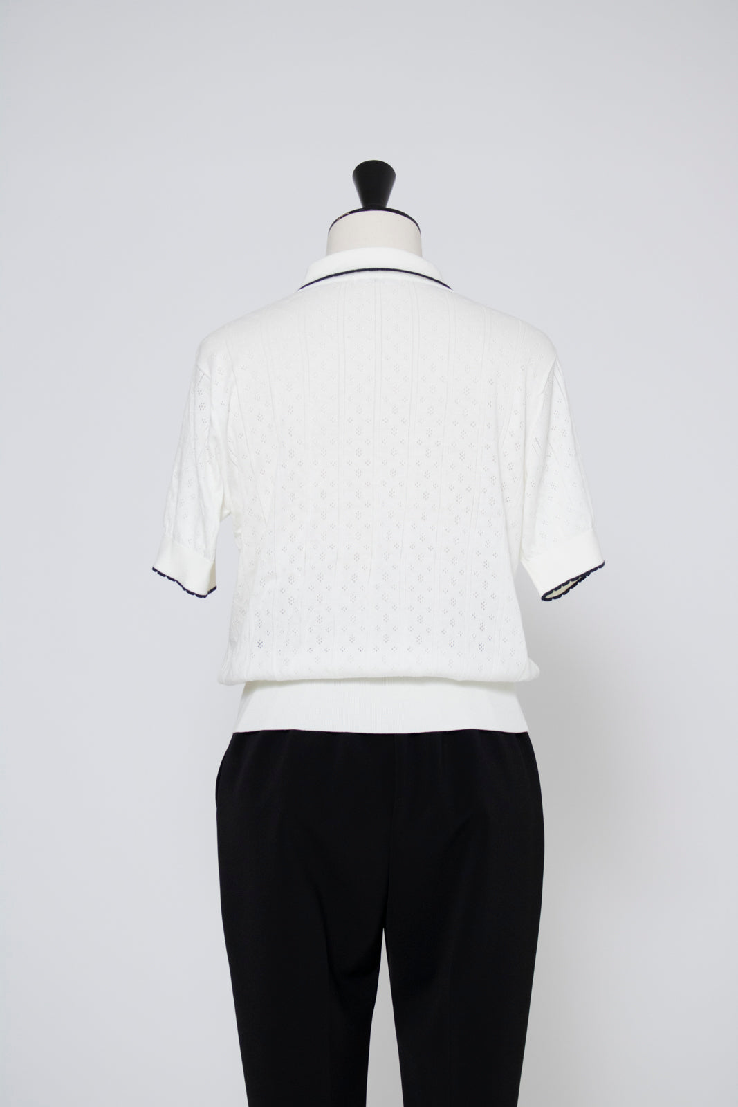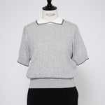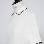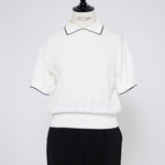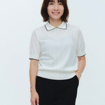 An elegant knit featuring a delicate eyelet pattern reminiscent of tiny flowers across the front, combining sophistication with charm. The compact silhouette offers a clean, streamlined fit, while the lightweight fabric makes it a versatile piece you'll treasure through summer. The scalloped neckline adds a touch of elegance around the face, and the subtle color-blocking design catches the eye as a stylish accent to any outfit. The refined elbow-length sleeves provide coverage while maintaining an airy feel. Crafted from 100% GIZA, a premium extra-long staple cotton, this knit boasts a natural luster and gentle hand feel that luxuriously embraces the skin. Pairs effortlessly with both pants and skirts, making it perfect for everything from polished to casual looks.