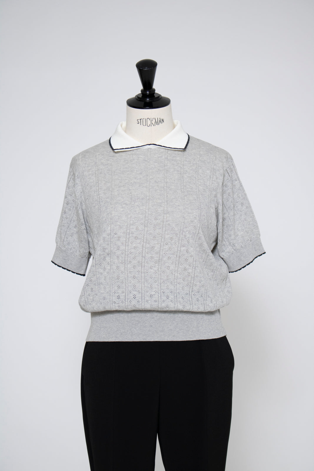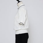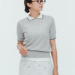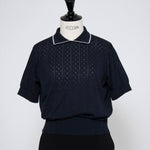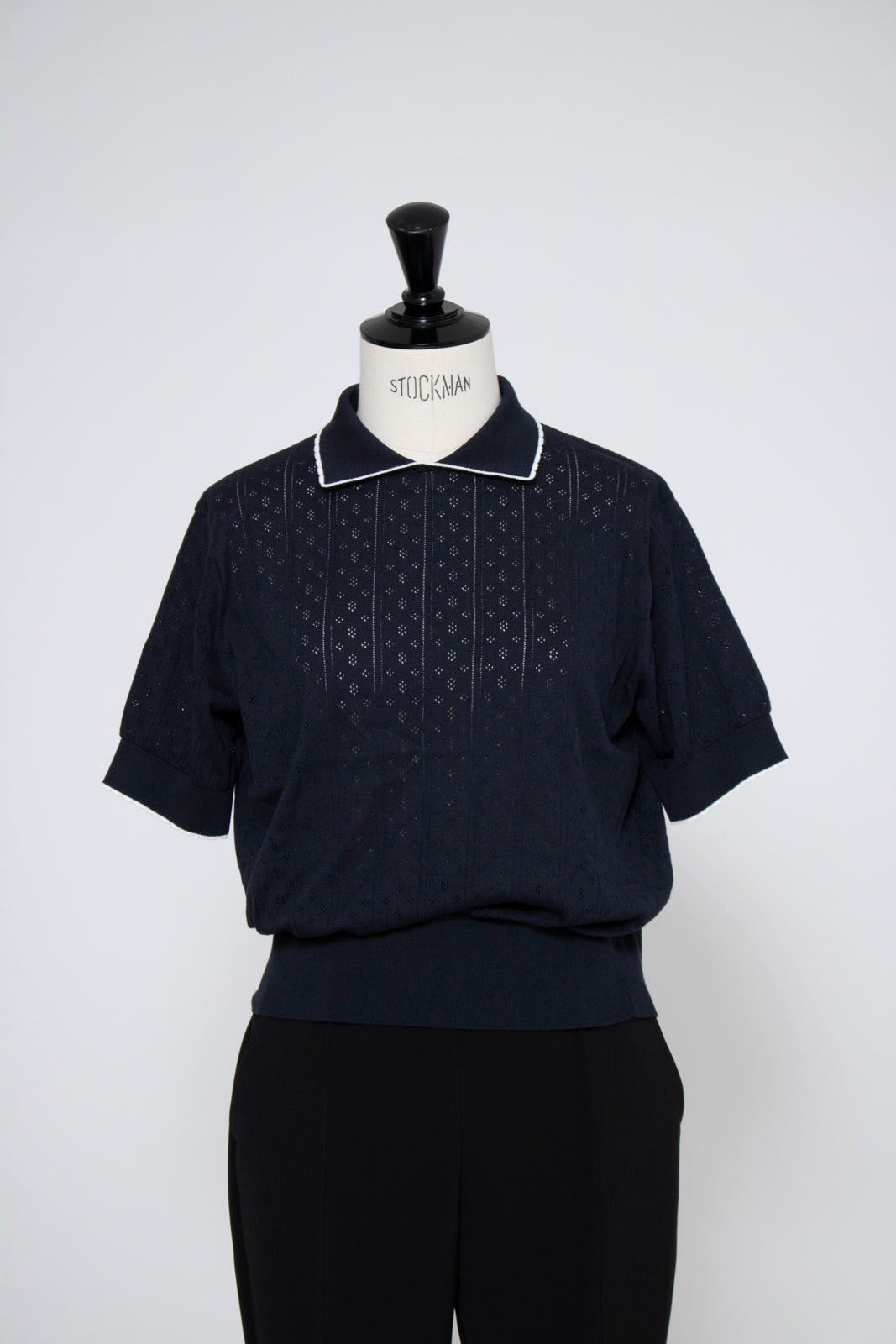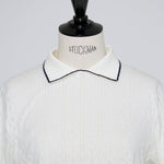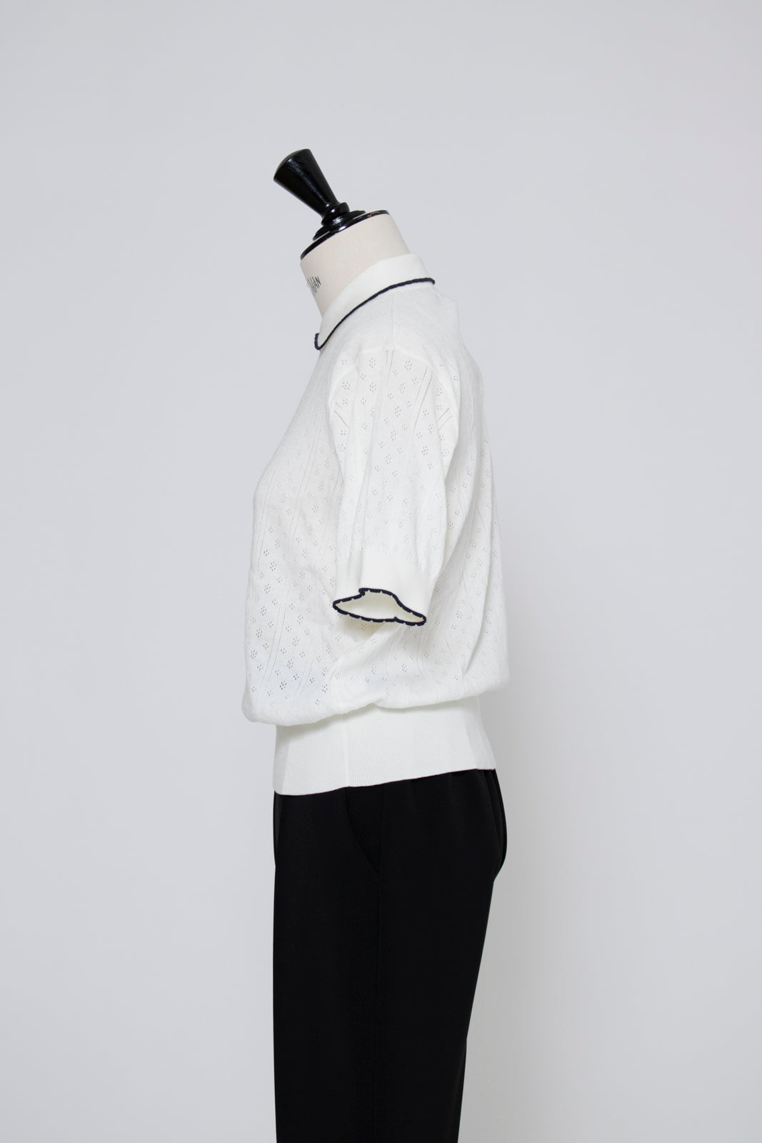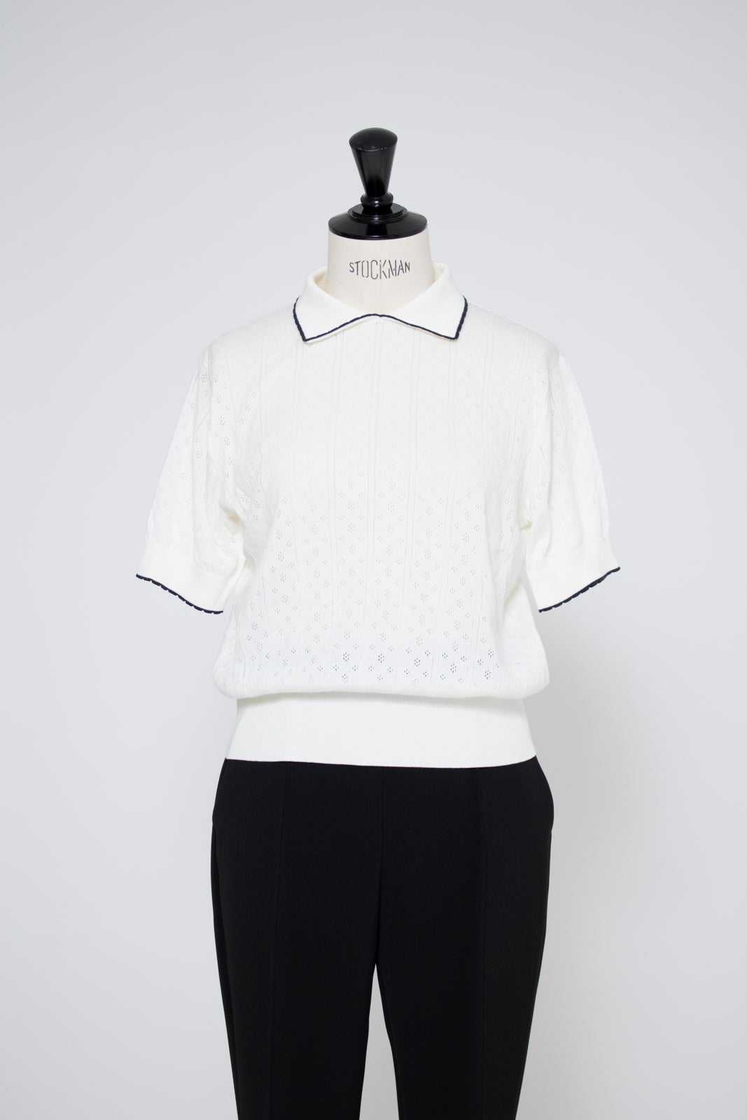 An elegant knit featuring a delicate eyelet pattern reminiscent of tiny flowers across the front, combining sophistication with charm. The compact silhouette offers a clean, streamlined fit, while the lightweight fabric makes it a versatile piece you'll treasure through summer. The scalloped neckline adds a touch of elegance around the face, and the subtle color-blocking design catches the eye as a stylish accent to any outfit. The refined elbow-length sleeves provide coverage while maintaining an airy feel. Crafted from 100% GIZA, a premium extra-long staple cotton, this knit boasts a natural luster and gentle hand feel that luxuriously embraces the skin. Pairs effortlessly with both pants and skirts, making it perfect for everything from polished to casual looks.