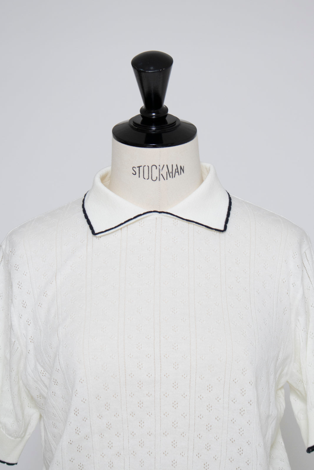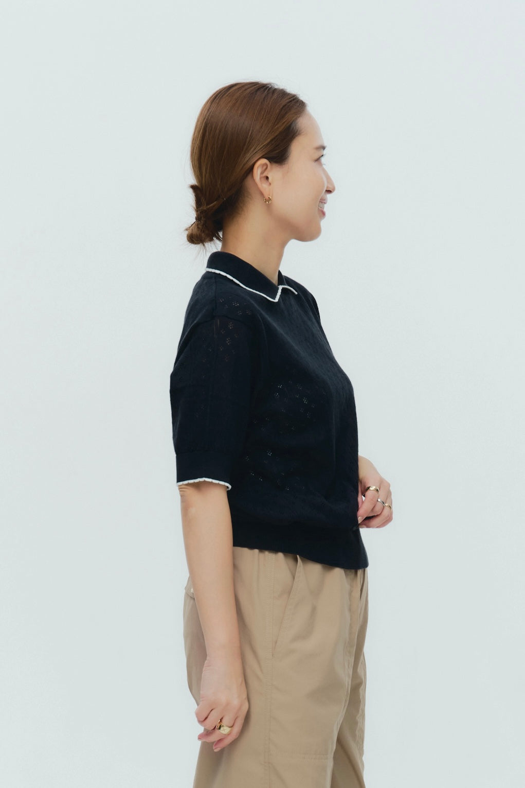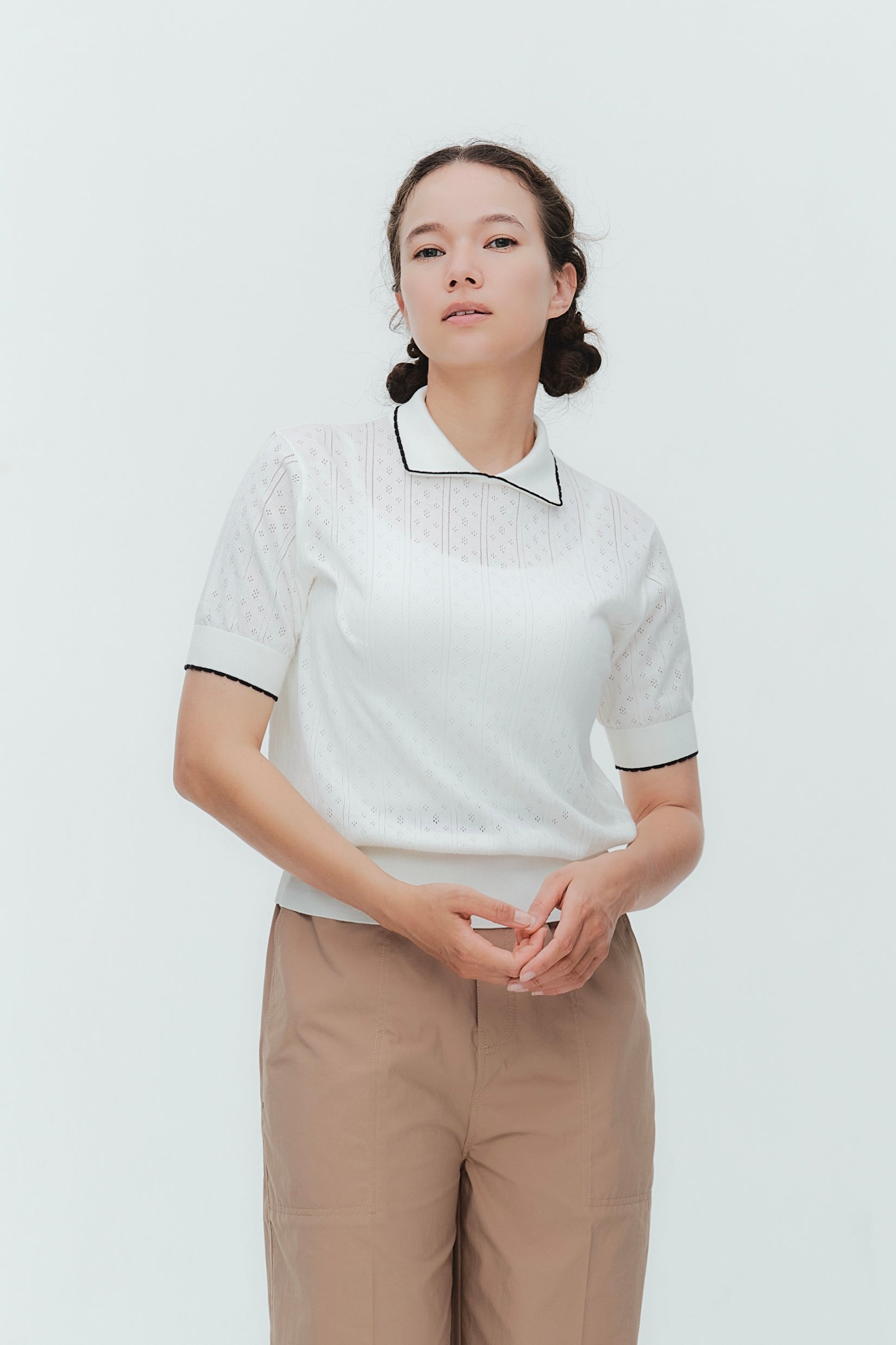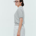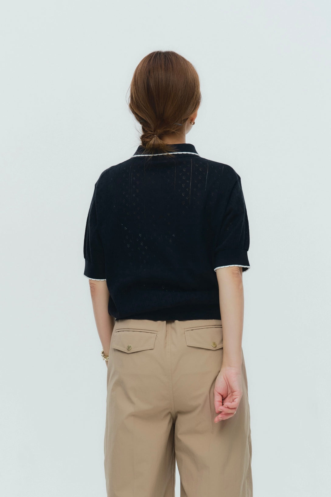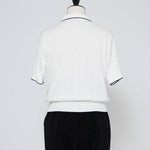 An elegant knit featuring a delicate eyelet pattern reminiscent of tiny flowers across the front, combining sophistication with charm. The compact silhouette offers a clean, streamlined fit, while the lightweight fabric makes it a versatile piece you'll treasure through summer. The scalloped neckline adds a touch of elegance around the face, and the subtle color-blocking design catches the eye as a stylish accent to any outfit. The refined elbow-length sleeves provide coverage while maintaining an airy feel. Crafted from 100% GIZA, a premium extra-long staple cotton, this knit boasts a natural luster and gentle hand feel that luxuriously embraces the skin. Pairs effortlessly with both pants and skirts, making it perfect for everything from polished to casual looks.