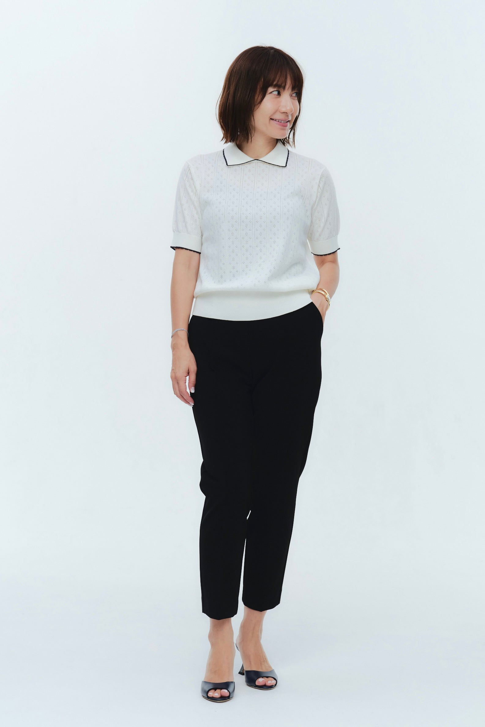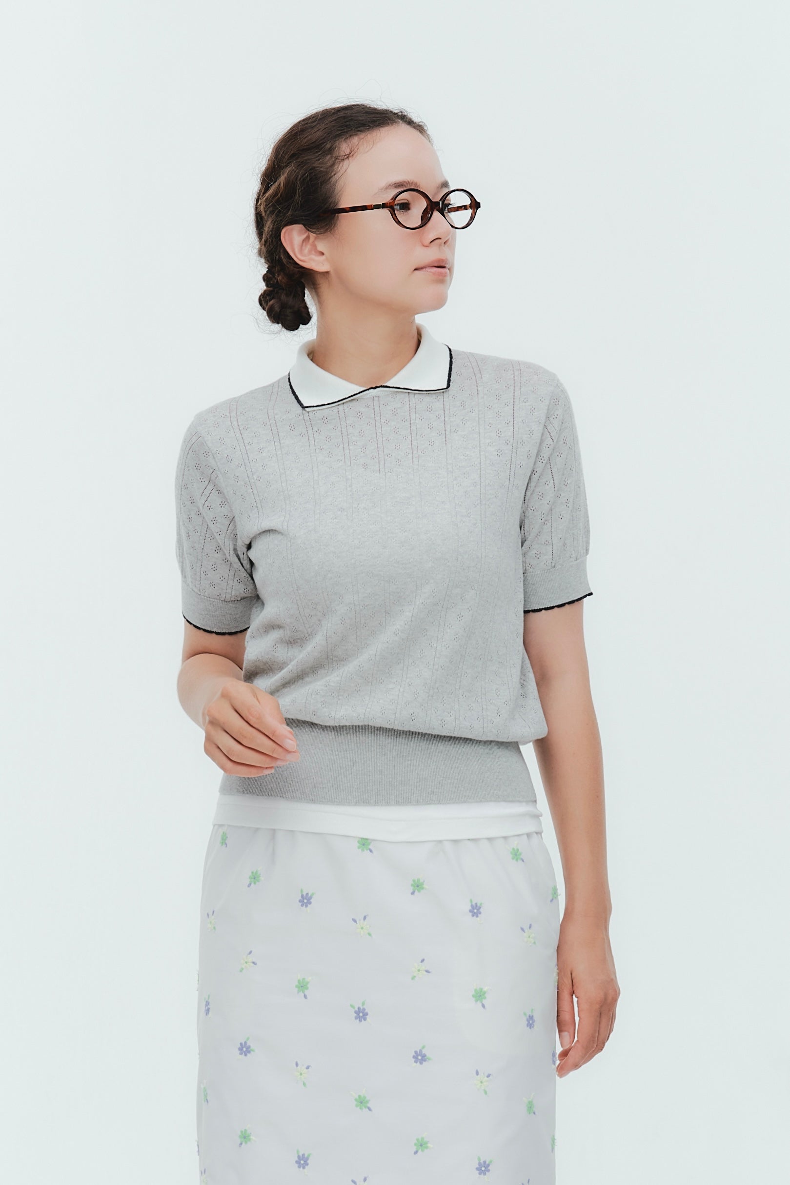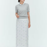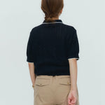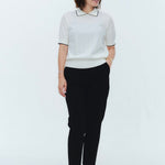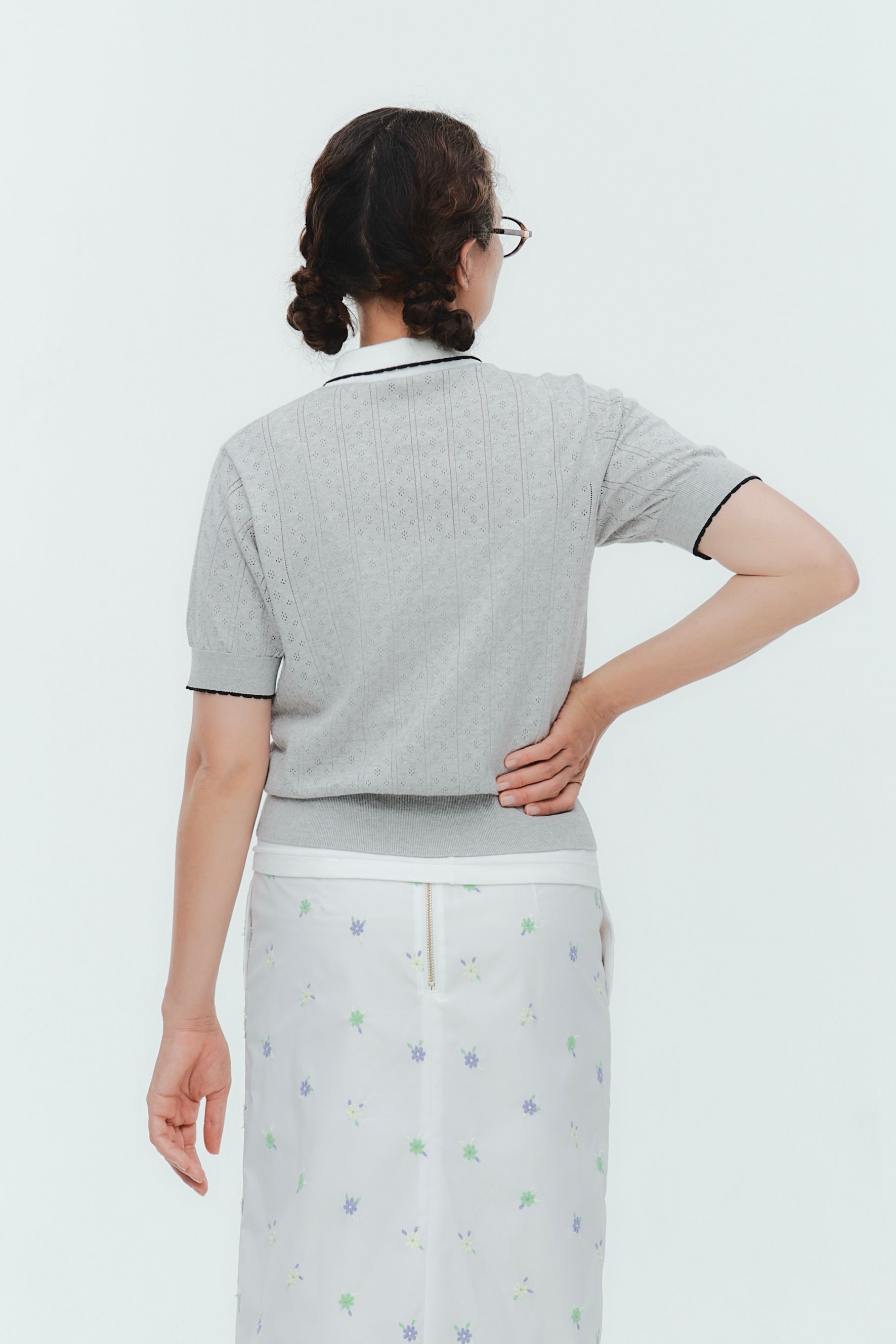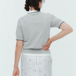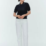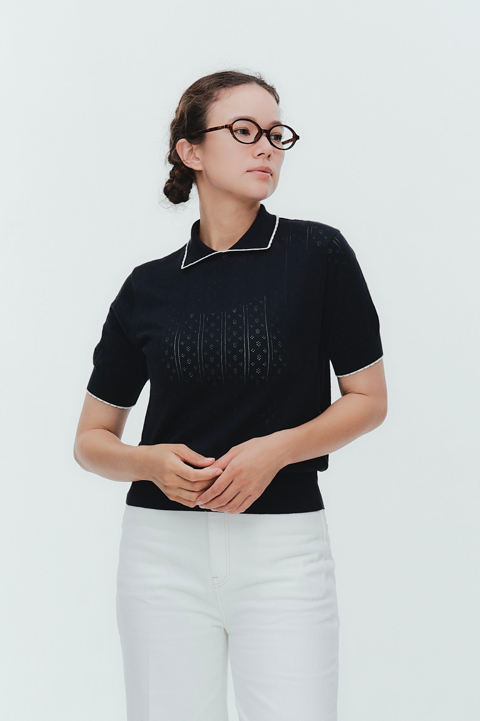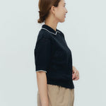 An elegant knit featuring a delicate eyelet pattern reminiscent of tiny flowers across the front, combining sophistication with charm. The compact silhouette offers a clean, streamlined fit, while the lightweight fabric makes it a versatile piece you'll treasure through summer. The scalloped neckline adds a touch of elegance around the face, and the subtle color-blocking design catches the eye as a stylish accent to any outfit. The refined elbow-length sleeves provide coverage while maintaining an airy feel. Crafted from 100% GIZA, a premium extra-long staple cotton, this knit boasts a natural luster and gentle hand feel that luxuriously embraces the skin. Pairs effortlessly with both pants and skirts, making it perfect for everything from polished to casual looks.