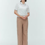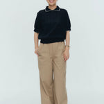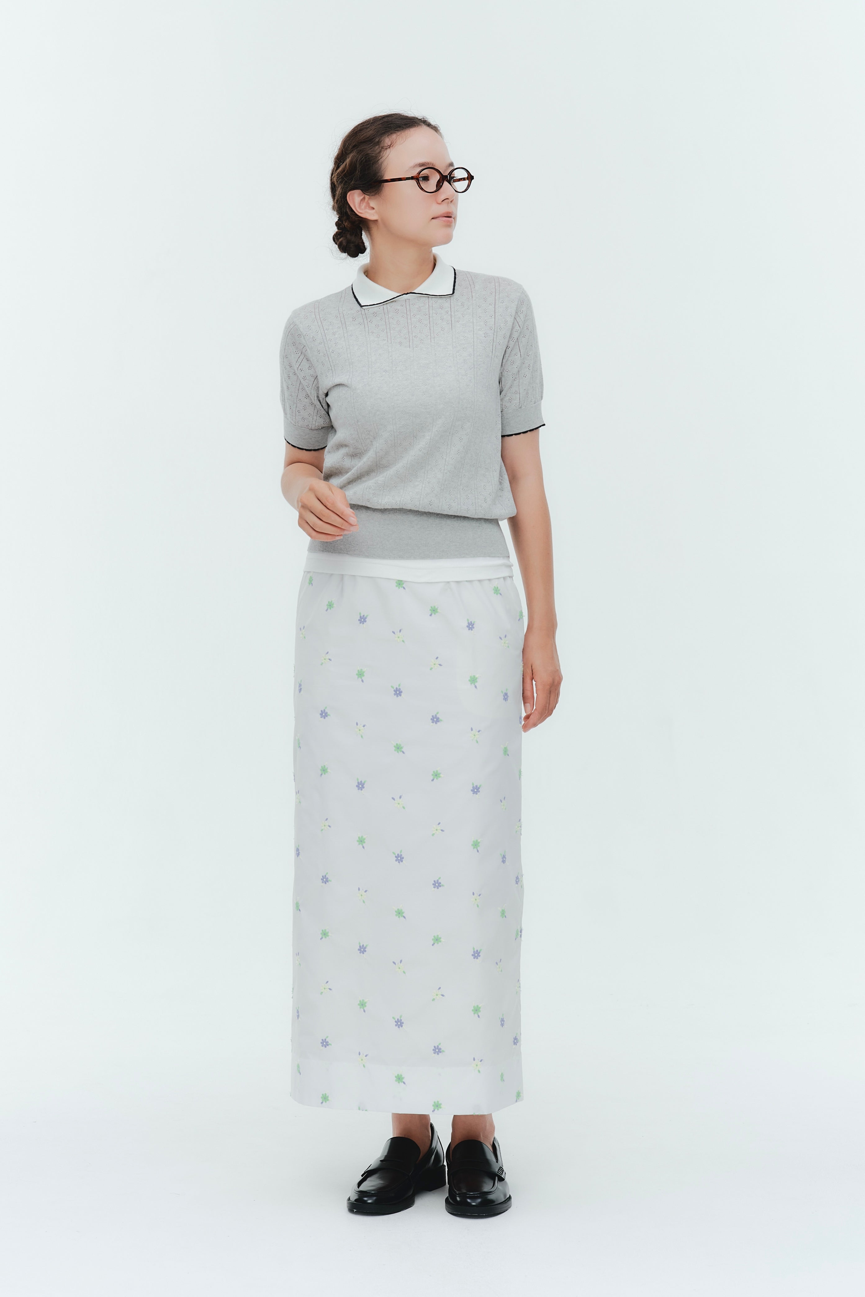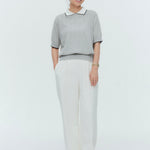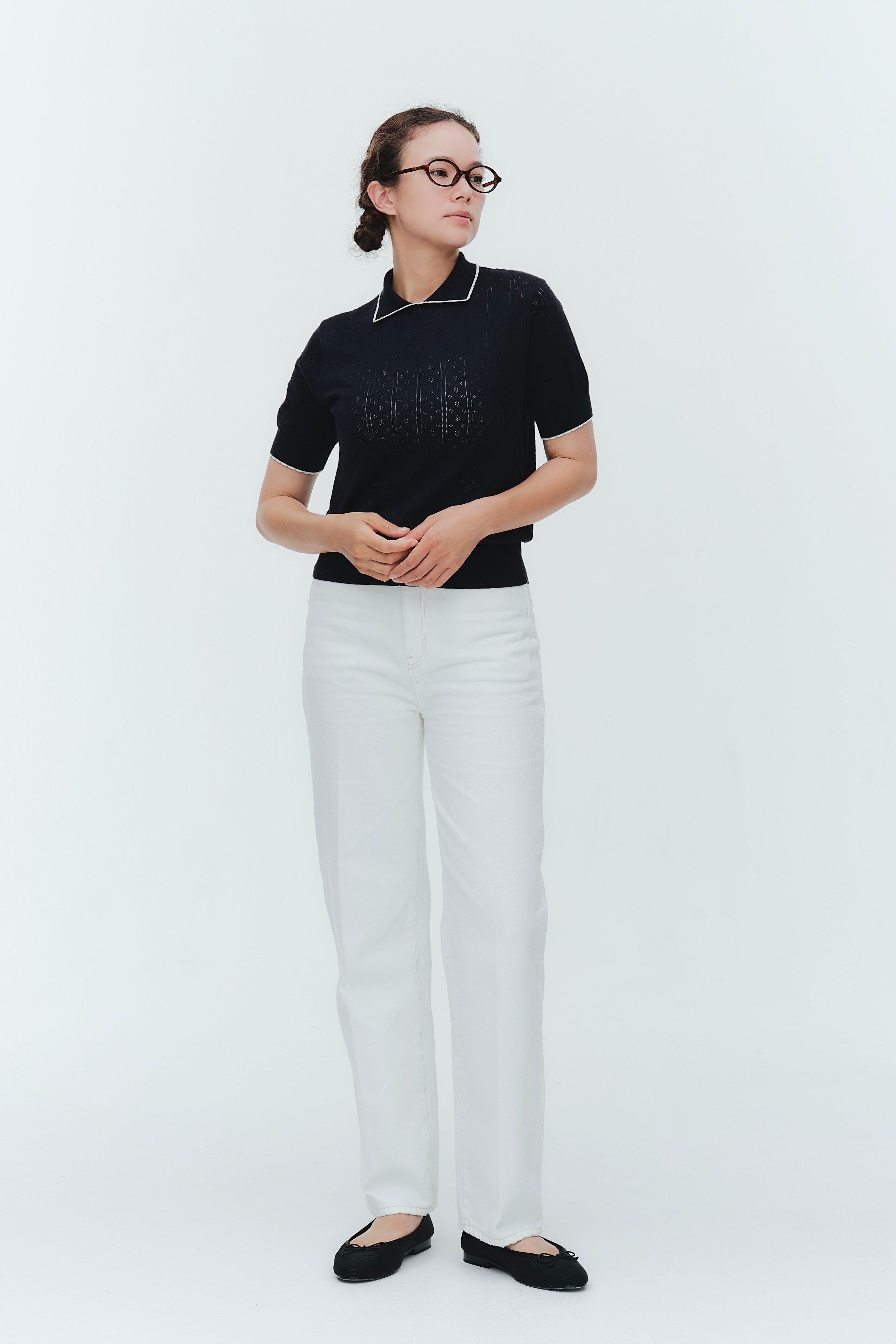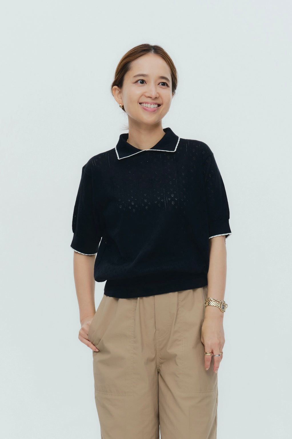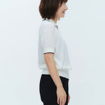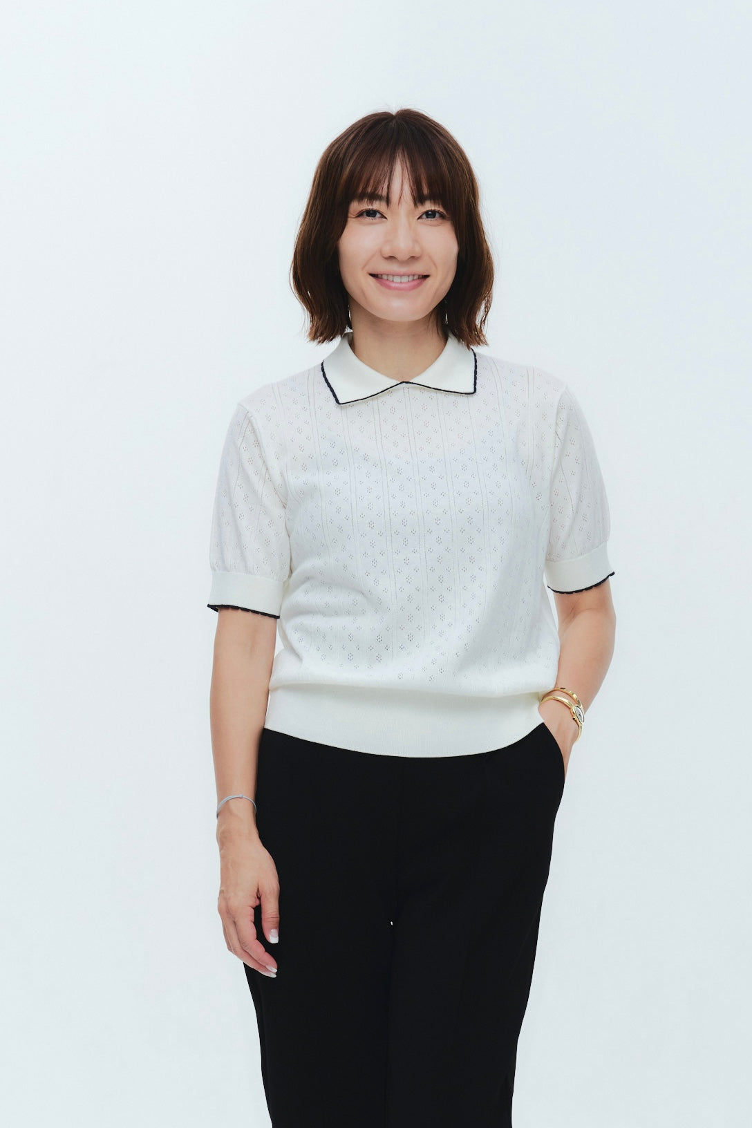 An elegant knit featuring a delicate eyelet pattern reminiscent of tiny flowers across the front, combining sophistication with charm. The compact silhouette offers a clean, streamlined fit, while the lightweight fabric makes it a versatile piece you'll treasure through summer. The scalloped neckline adds a touch of elegance around the face, and the subtle color-blocking design catches the eye as a stylish accent to any outfit. The refined elbow-length sleeves provide coverage while maintaining an airy feel. Crafted from 100% GIZA, a premium extra-long staple cotton, this knit boasts a natural luster and gentle hand feel that luxuriously embraces the skin. Pairs effortlessly with both pants and skirts, making it perfect for everything from polished to casual looks.
