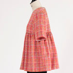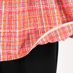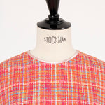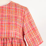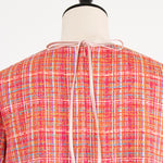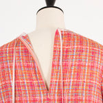 這款單品採用鮮豔的粗花呢材質,融合亮麗色彩,打造出吸睛優雅的造型。採用日本原創布料,精緻的質感中不失俏皮感。雖然是粗花呢材質,但質地輕盈順滑,不會有厚重感,即使在夏天穿著也倍感舒適。柔和的A字輪廓巧妙地提升了整體風格。領口處的緞帶、胸前接縫的佈局以及後背拉鍊等細節,都為這款單品增添了精緻的質感。